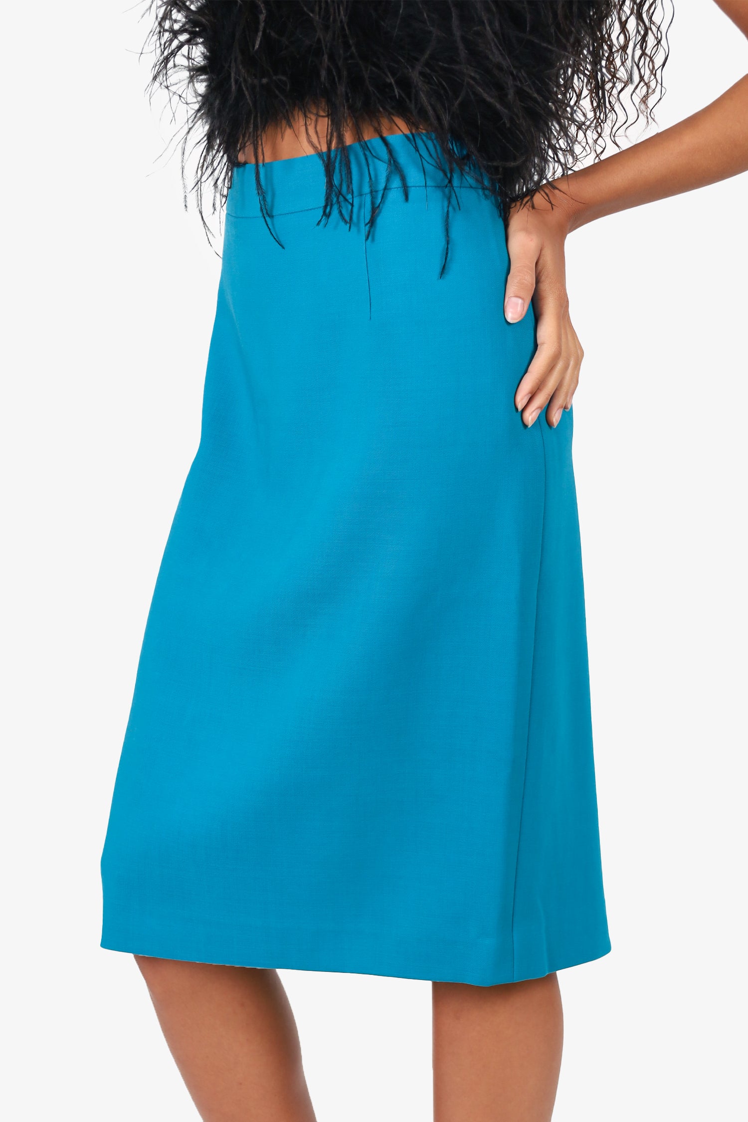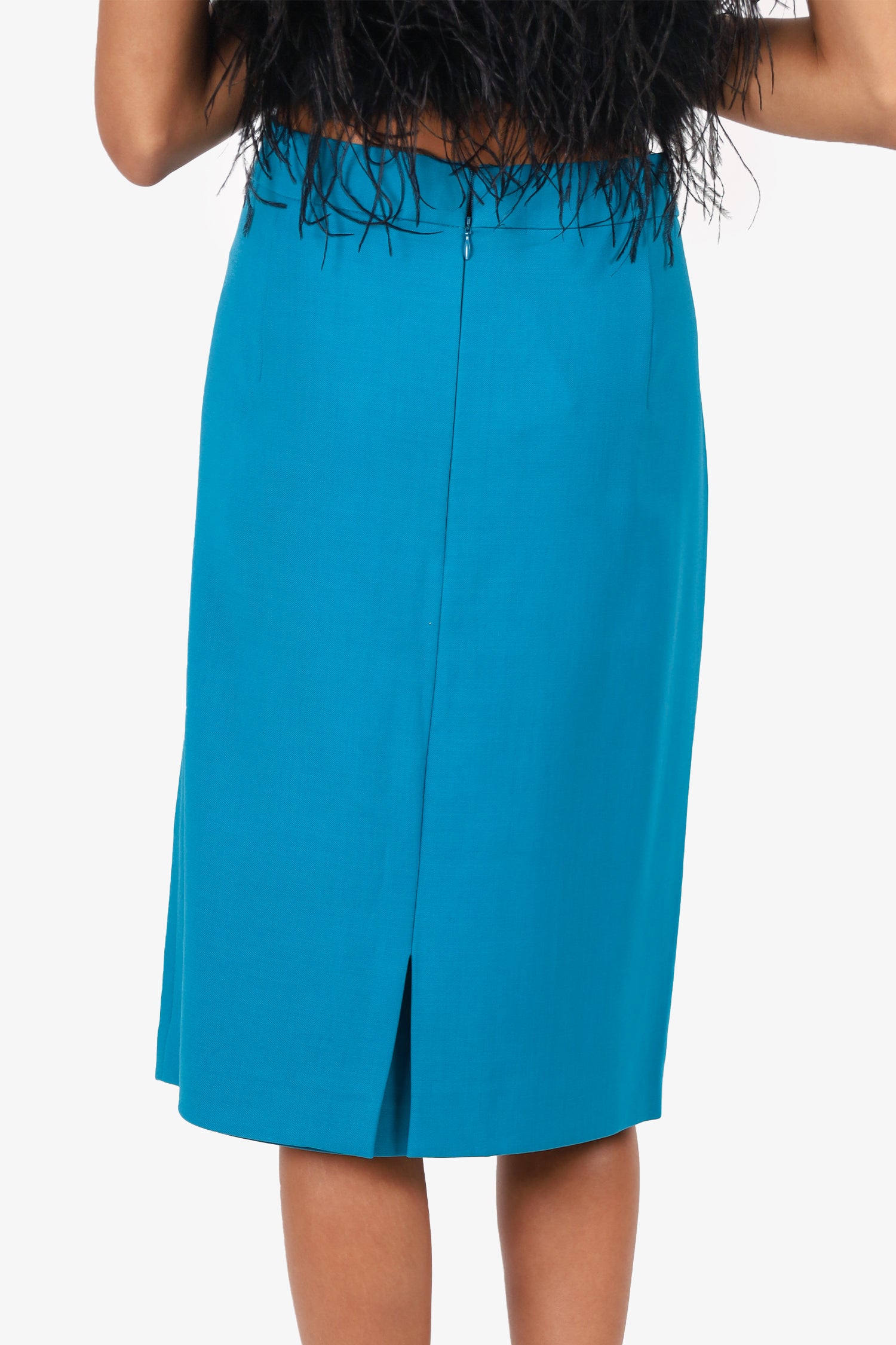 Refresh availabilityEscada Blue High Waisted knee Length Skirt. Slip-on. Rear zip with button-up closure. Lined interior. Tonal stitching.