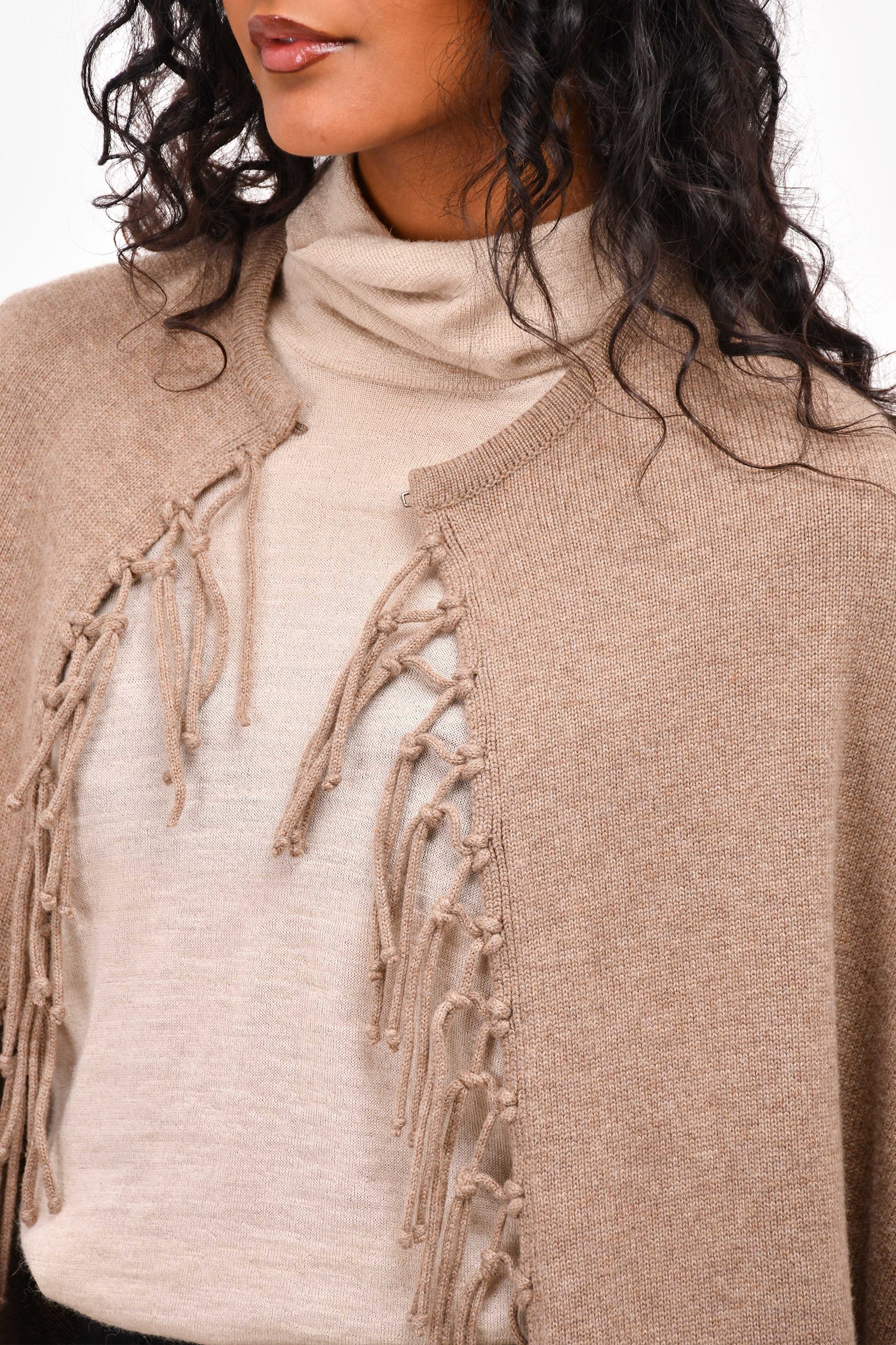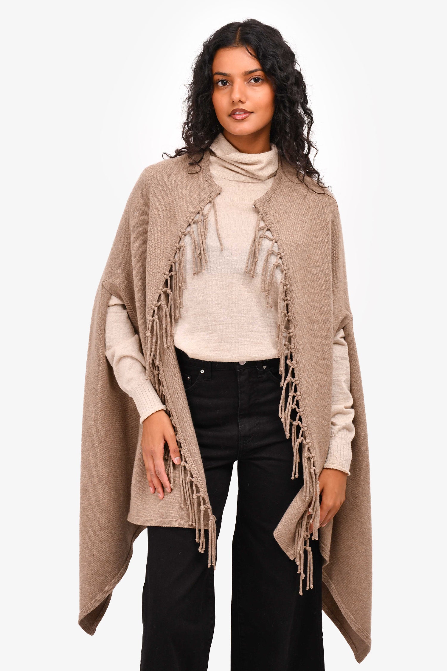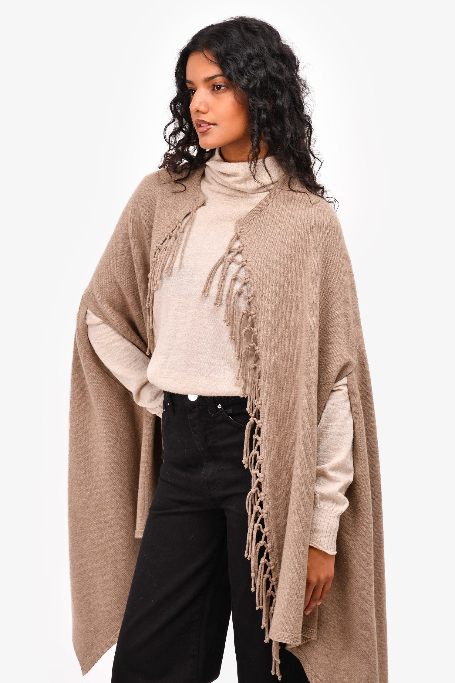 Refresh availabilityEscada Brown Cashmere Fringe Cape. Pull-on. Single front hook closure on the neckline.
