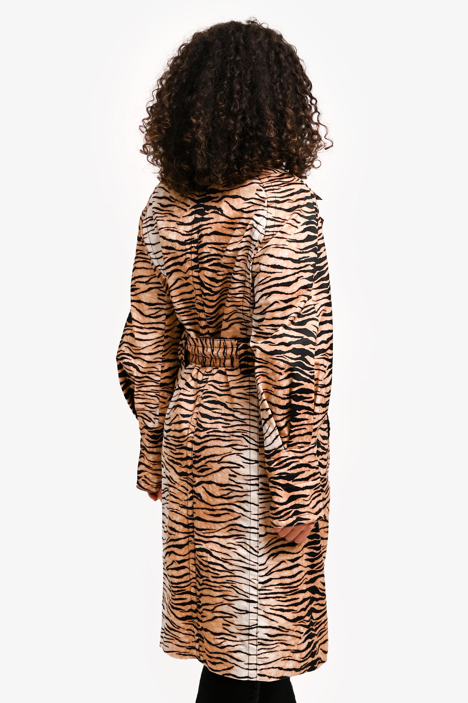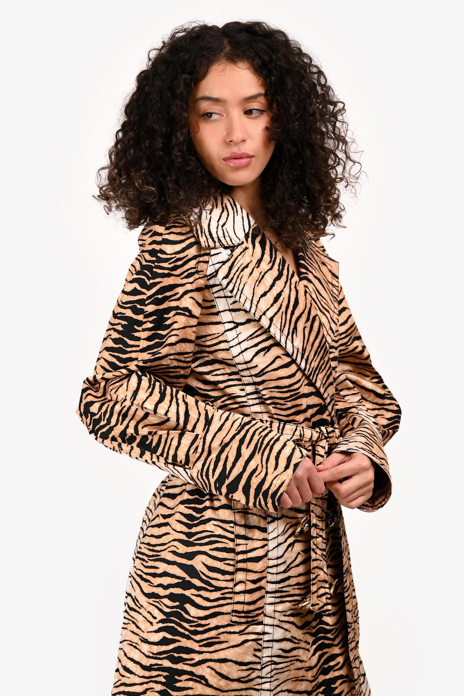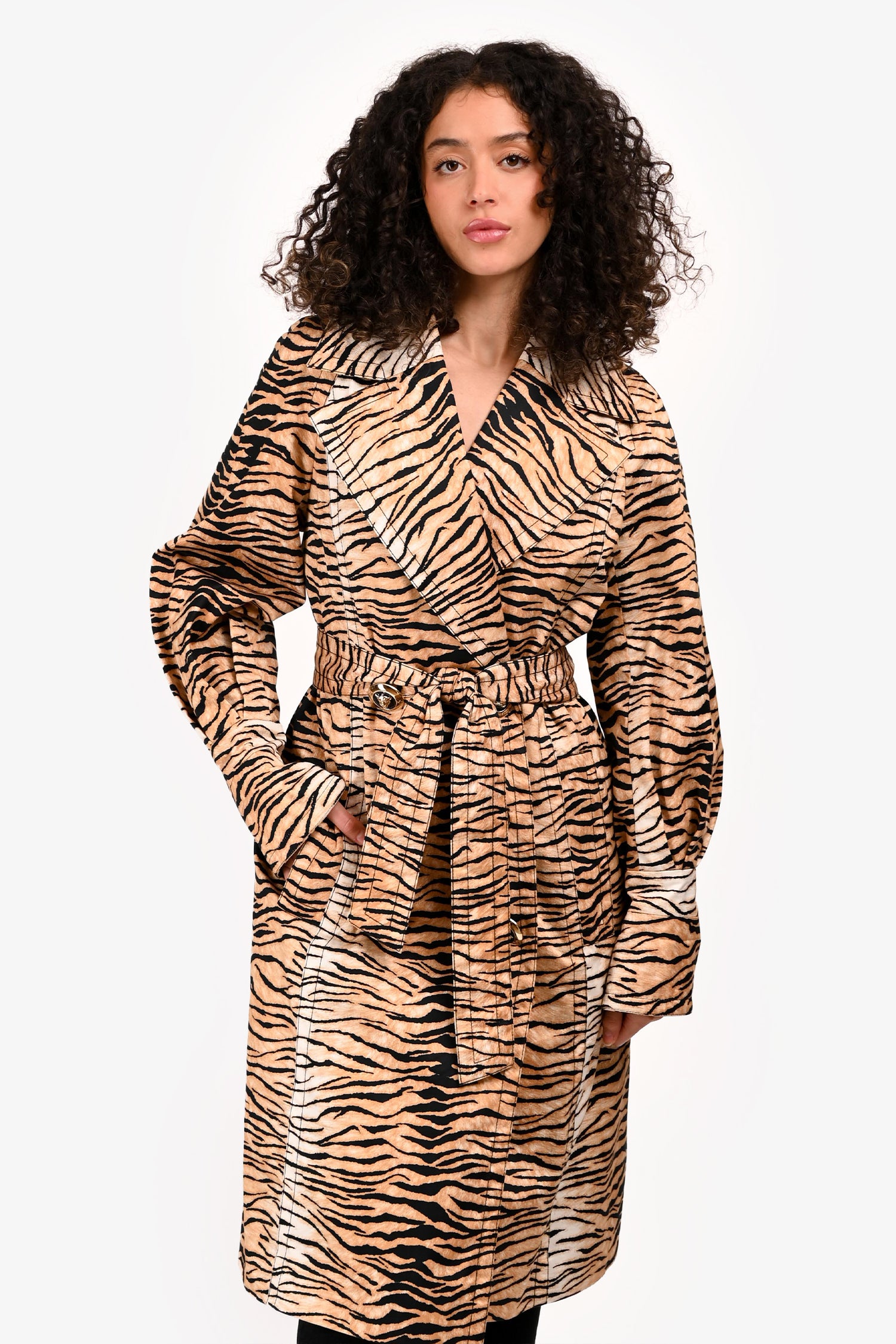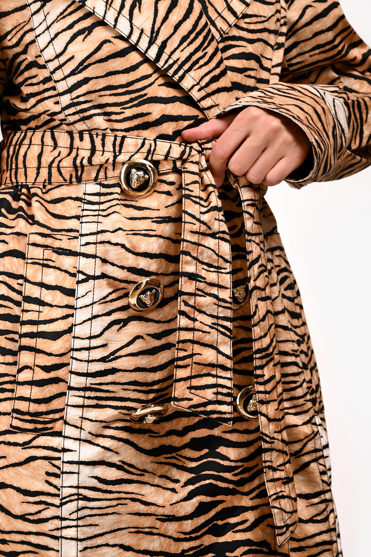Escada Brown Cotton Tiger Print Double Breasted Trench Coat. Pull-on with front button closure and detachable waist belt. Wide notched lapels with shoulder epaulettes. Two exterior pockets. Fully lined. Tonal stitching.