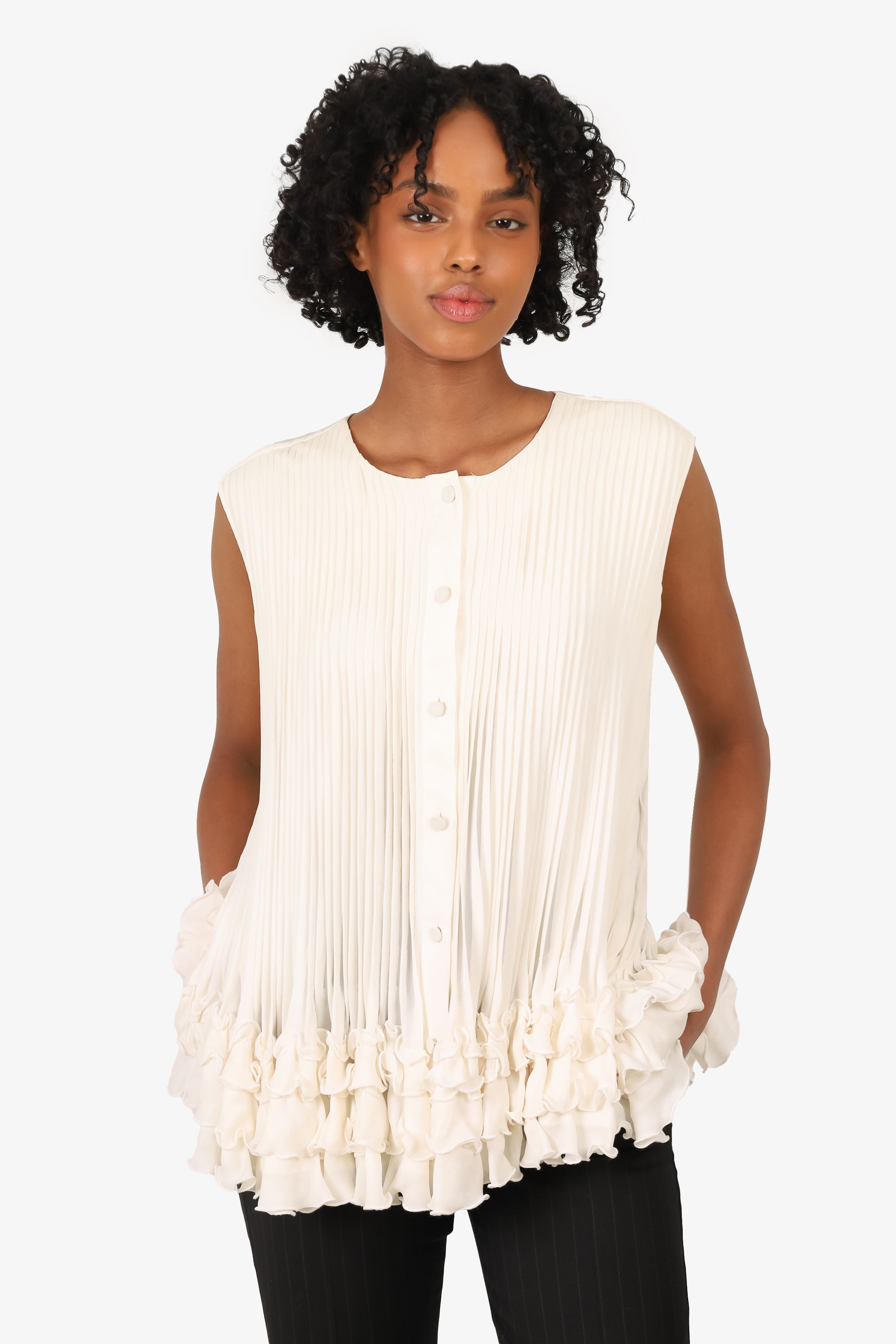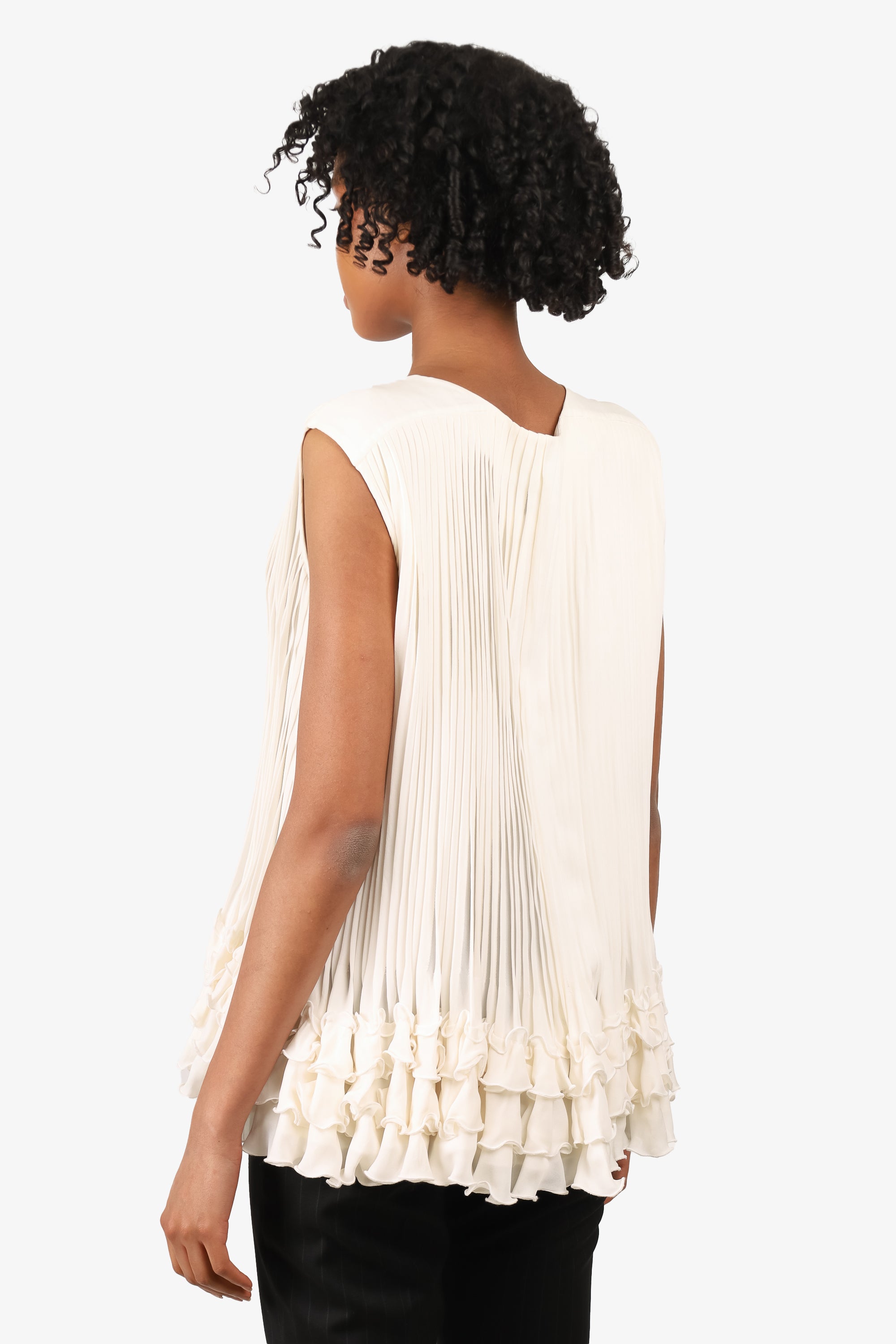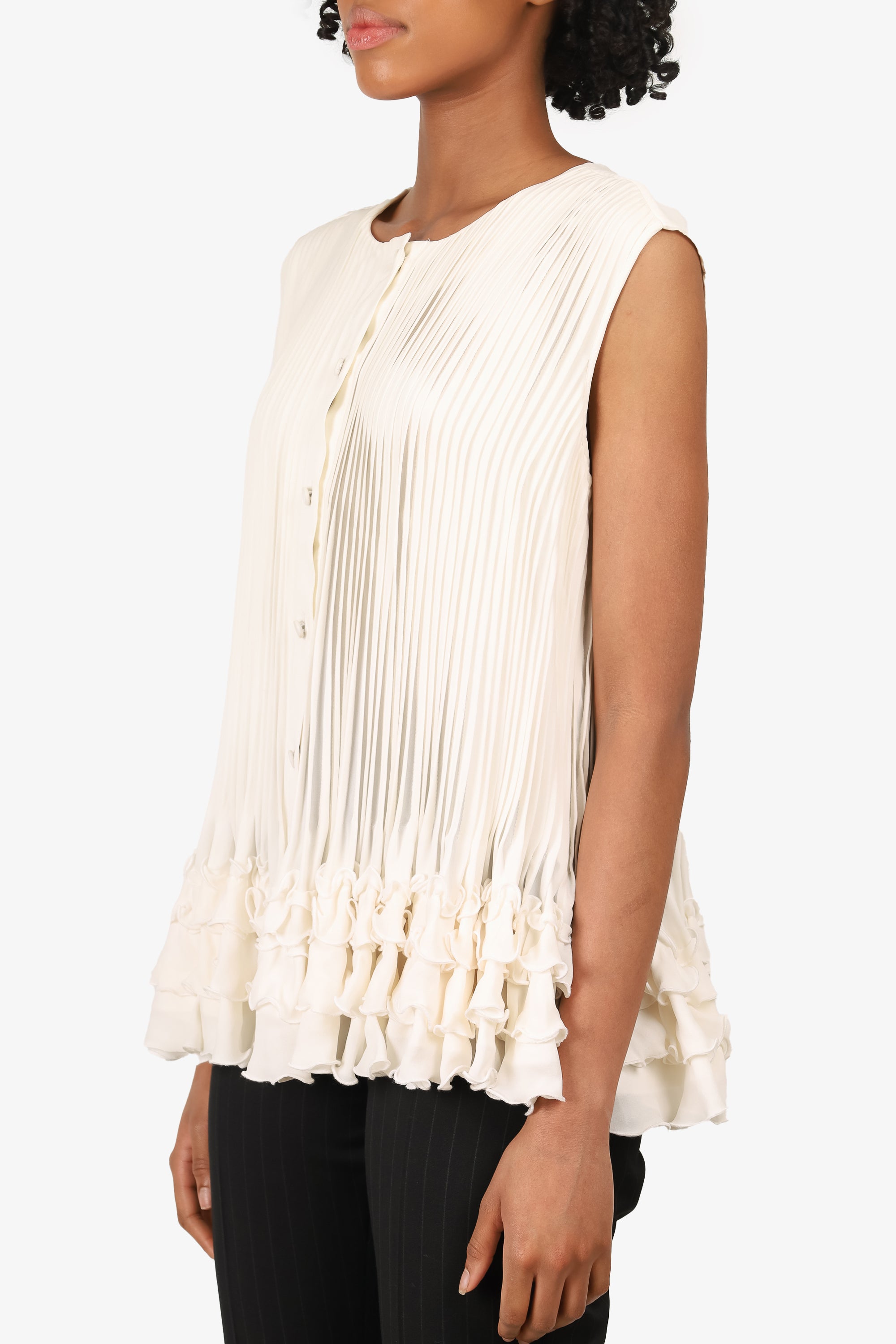 Refresh availabilityEscada Cream Silk Pleated Ruffle Sleeveless Top. Front button closure. Round neckline. Unlined. Tonal stitching.