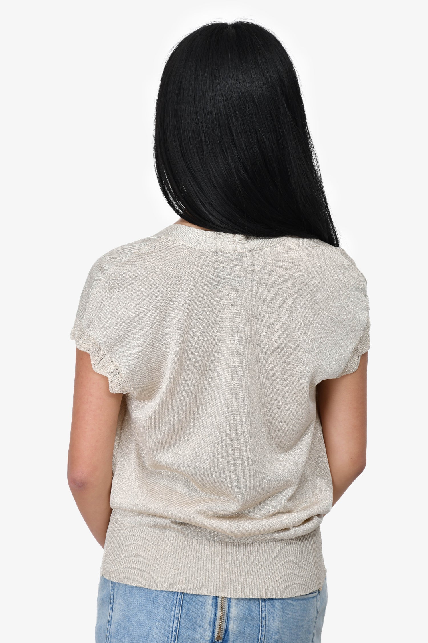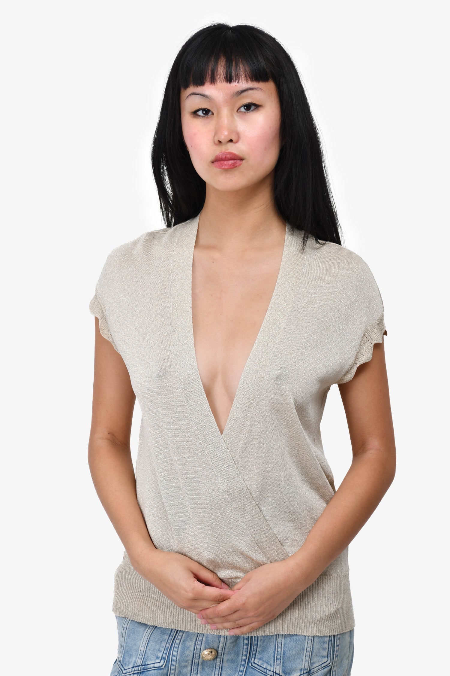 Refresh availabilityEscada Gold Metallic Sleeveless Top. Sheer. Deep v-neckline. Ribbed at the hem. Knit detailing on the armholes. Tonal stitching.