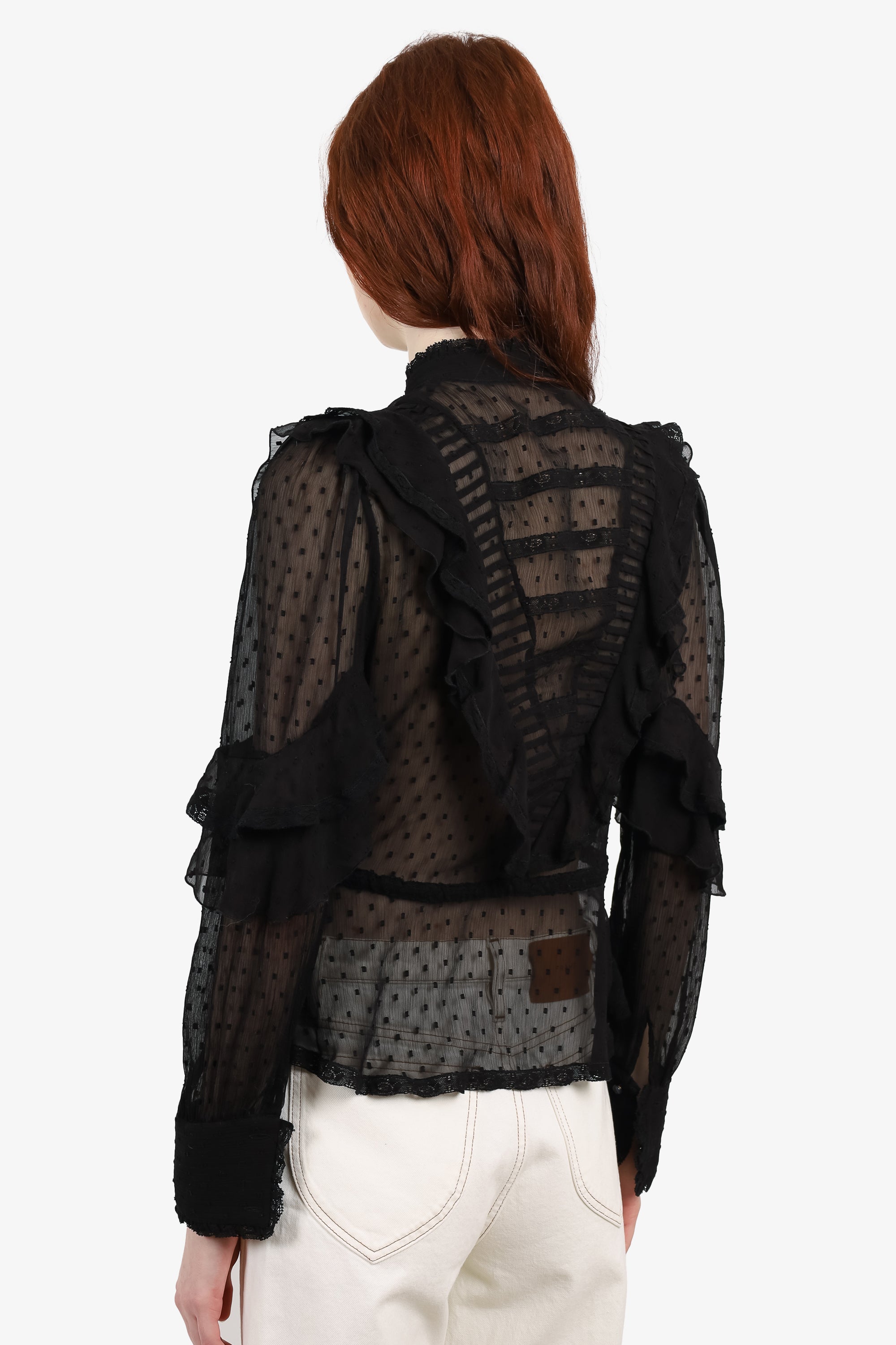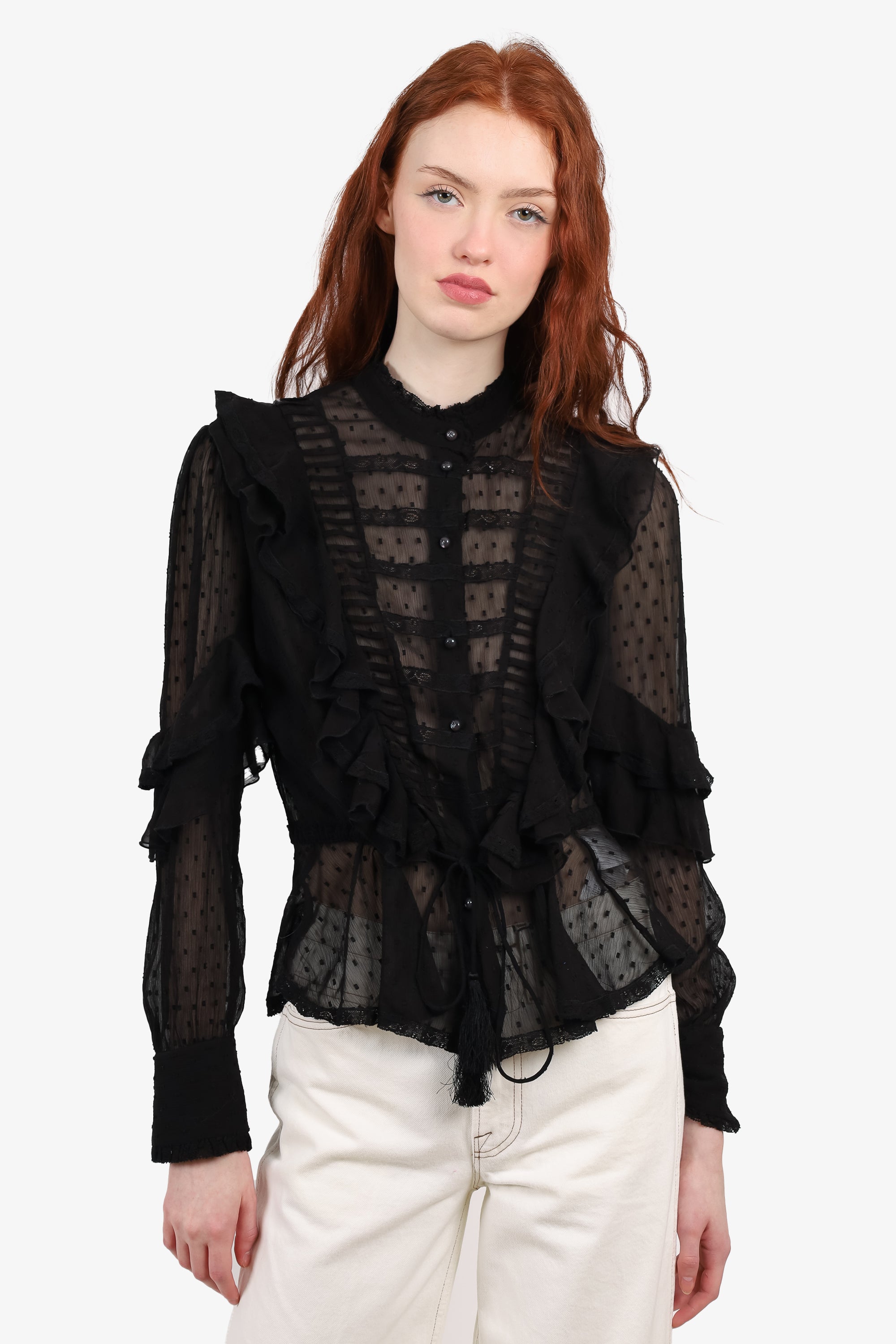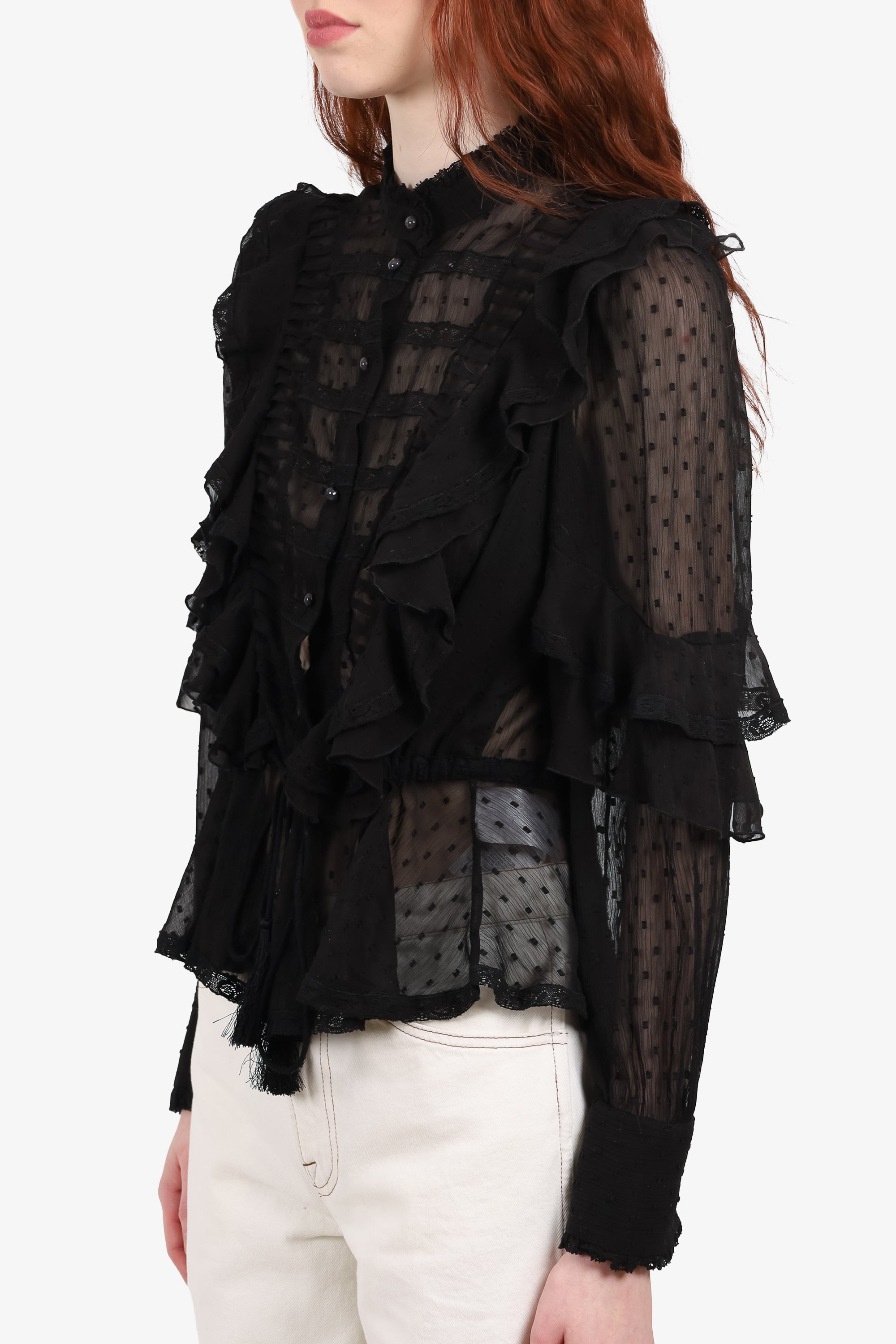 Refresh availabilityEtro 44 Black Sheer Ruffle Long Sleeve Top. Button-up closure. Unlined. Tonal stitching.