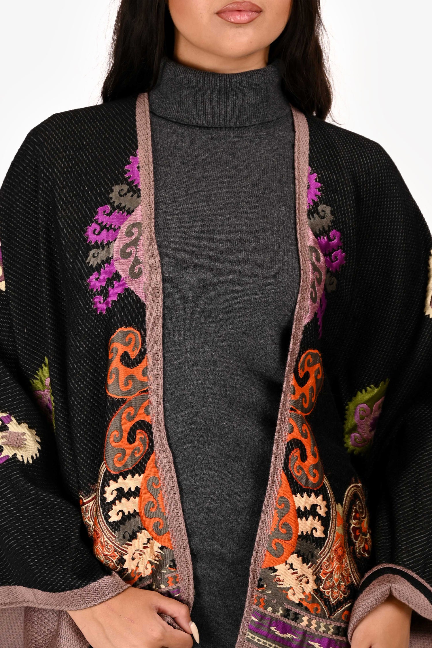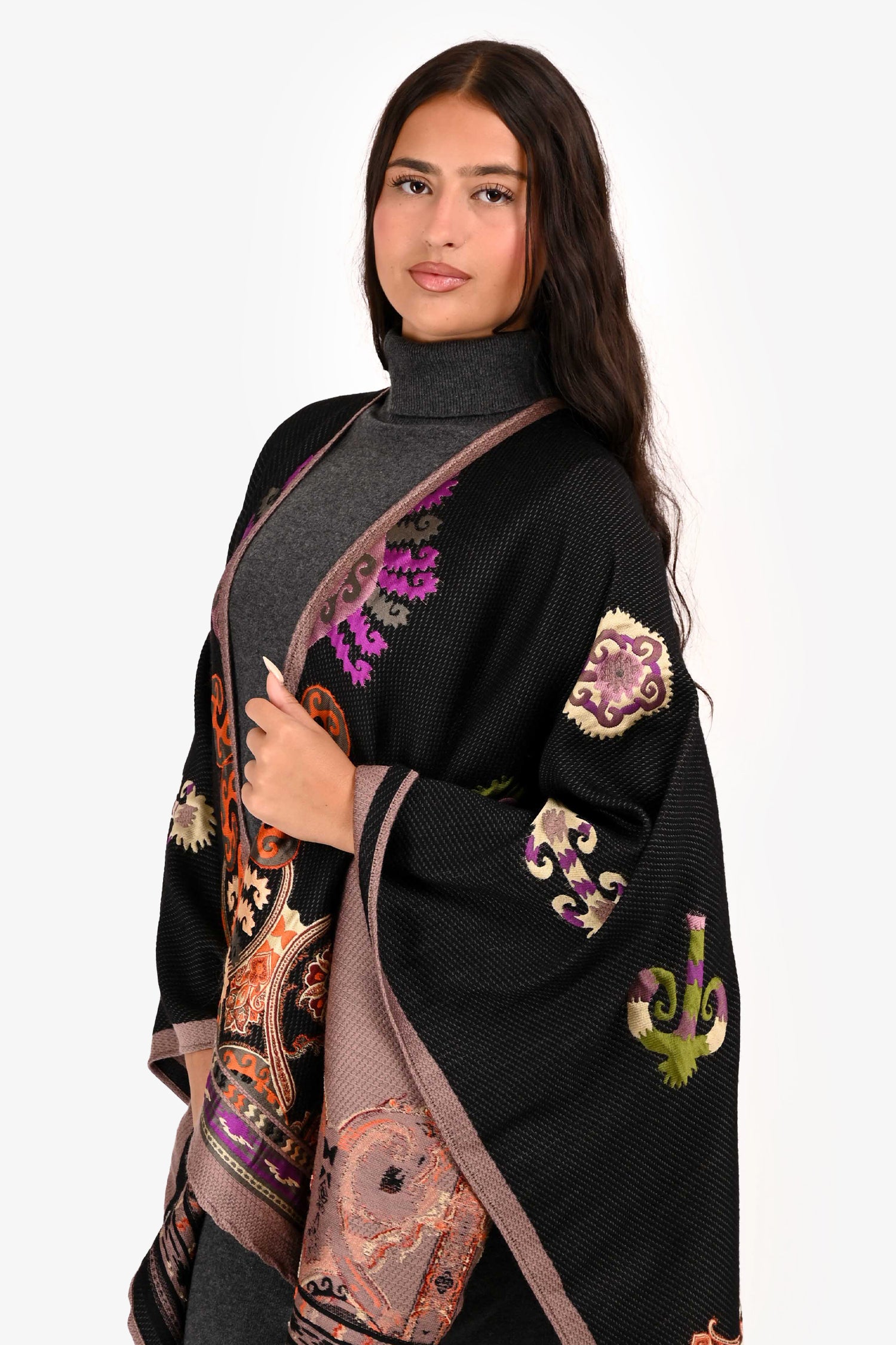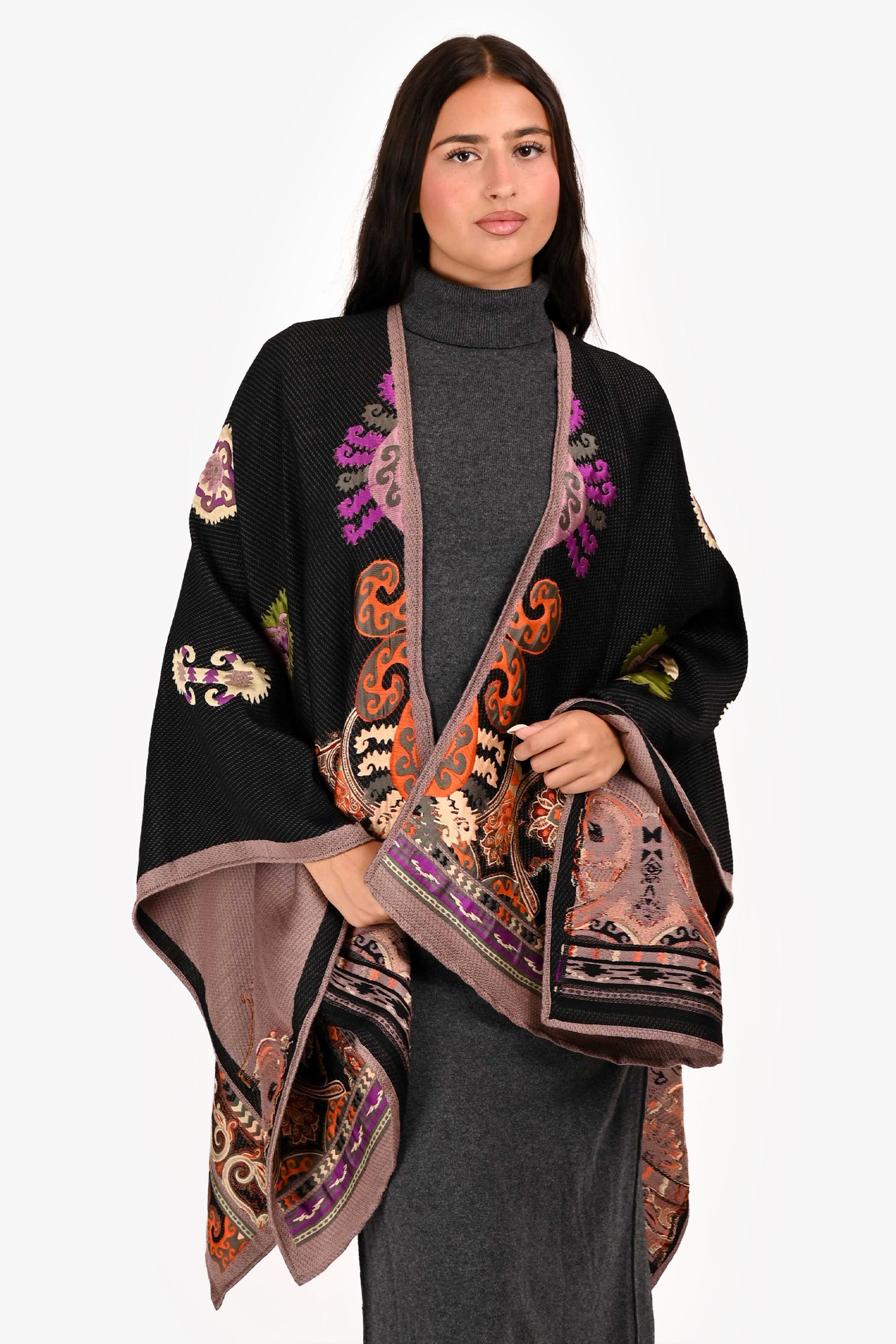 Refresh availabilityEtro Black/Orange Paisley Wool Poncho. Multi-coloured paisley-print embroidery. Tonal stitching.