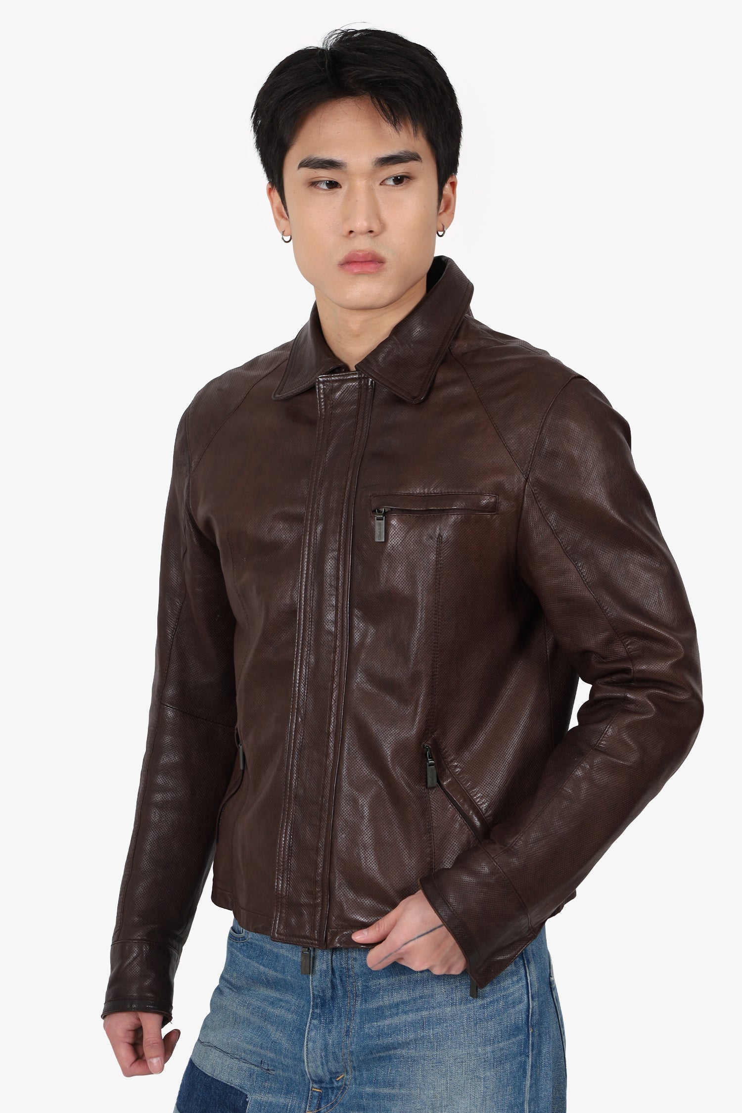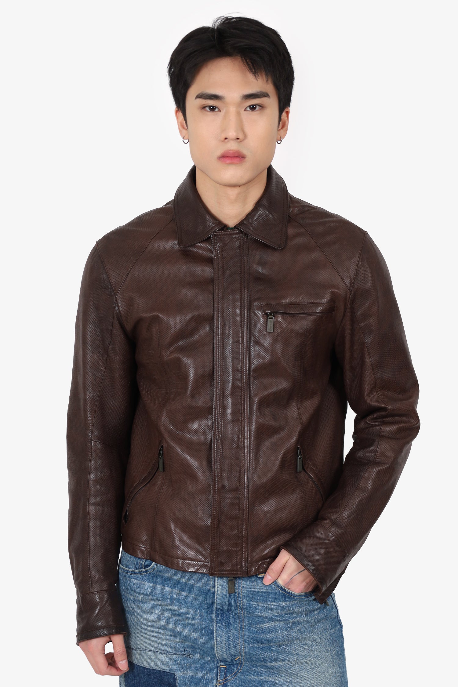 Refresh availabilityEtro Brown Leather Zip-up Jacket. Pull-on. Collared-neckline. Front zip and snap-button closure. Sleeve cuffs with zip closure. 3 exterior pockets; 2 side zip and 1 chest zip. Lined interior. Single interior slip pocket Tonal stitching.