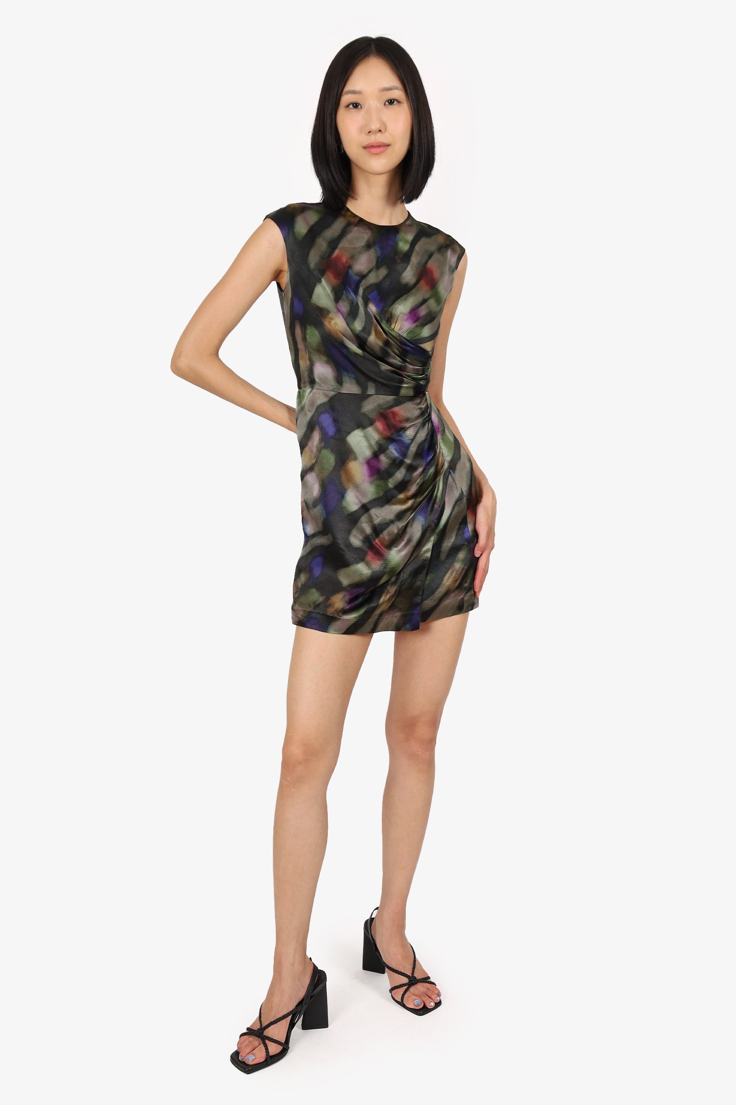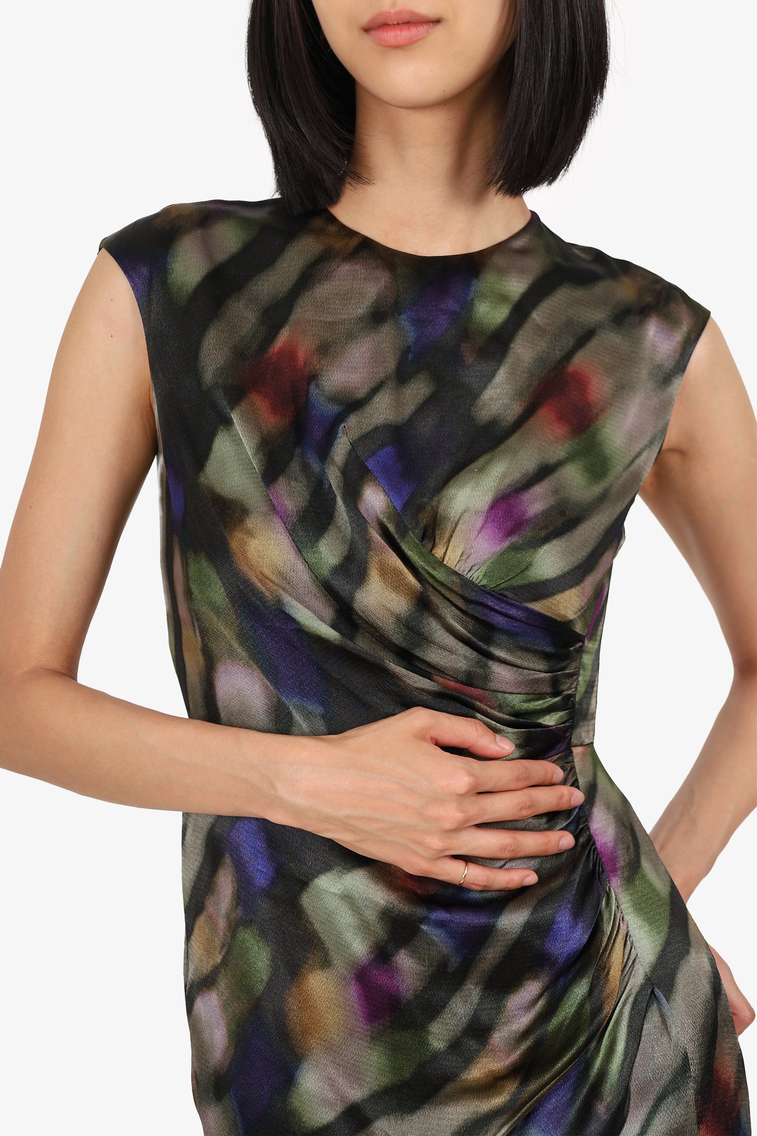 Refresh availabilityEtro Green/Purple Printed Sleeveless Ruched Shift Dress. Slip-on. Round neckline. Rear zip with hook closure. Lined interior. Tonal stitching.