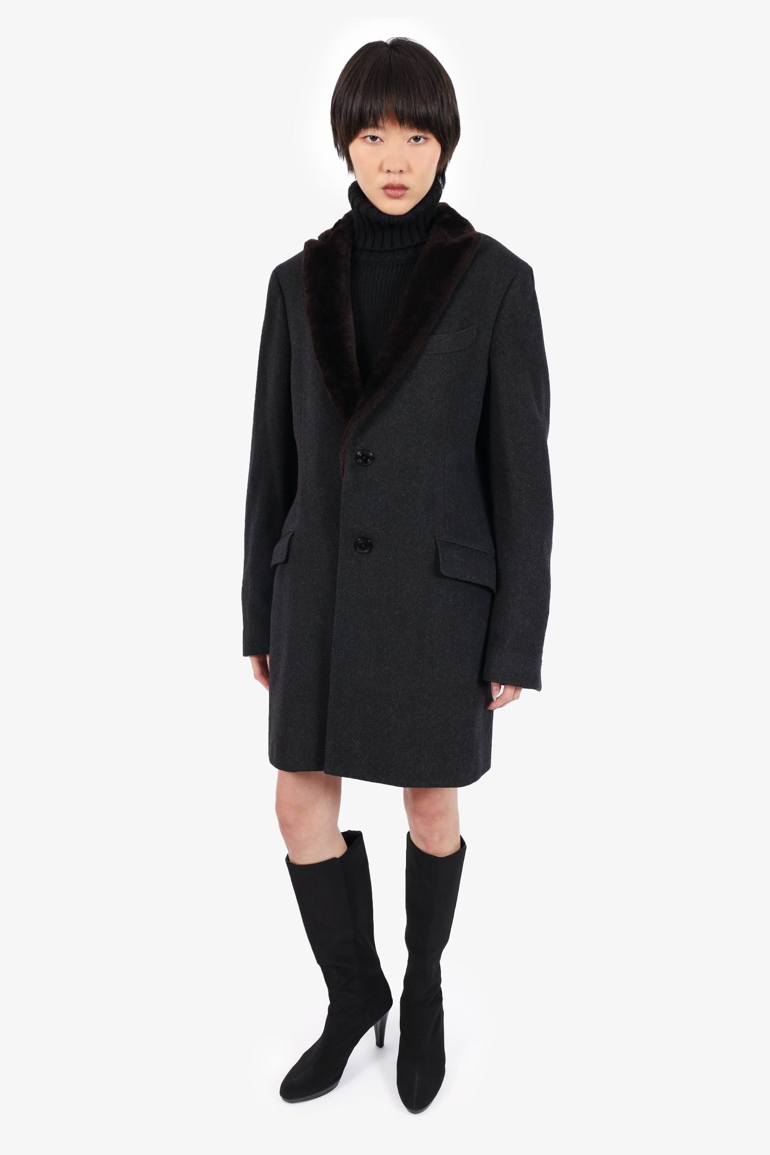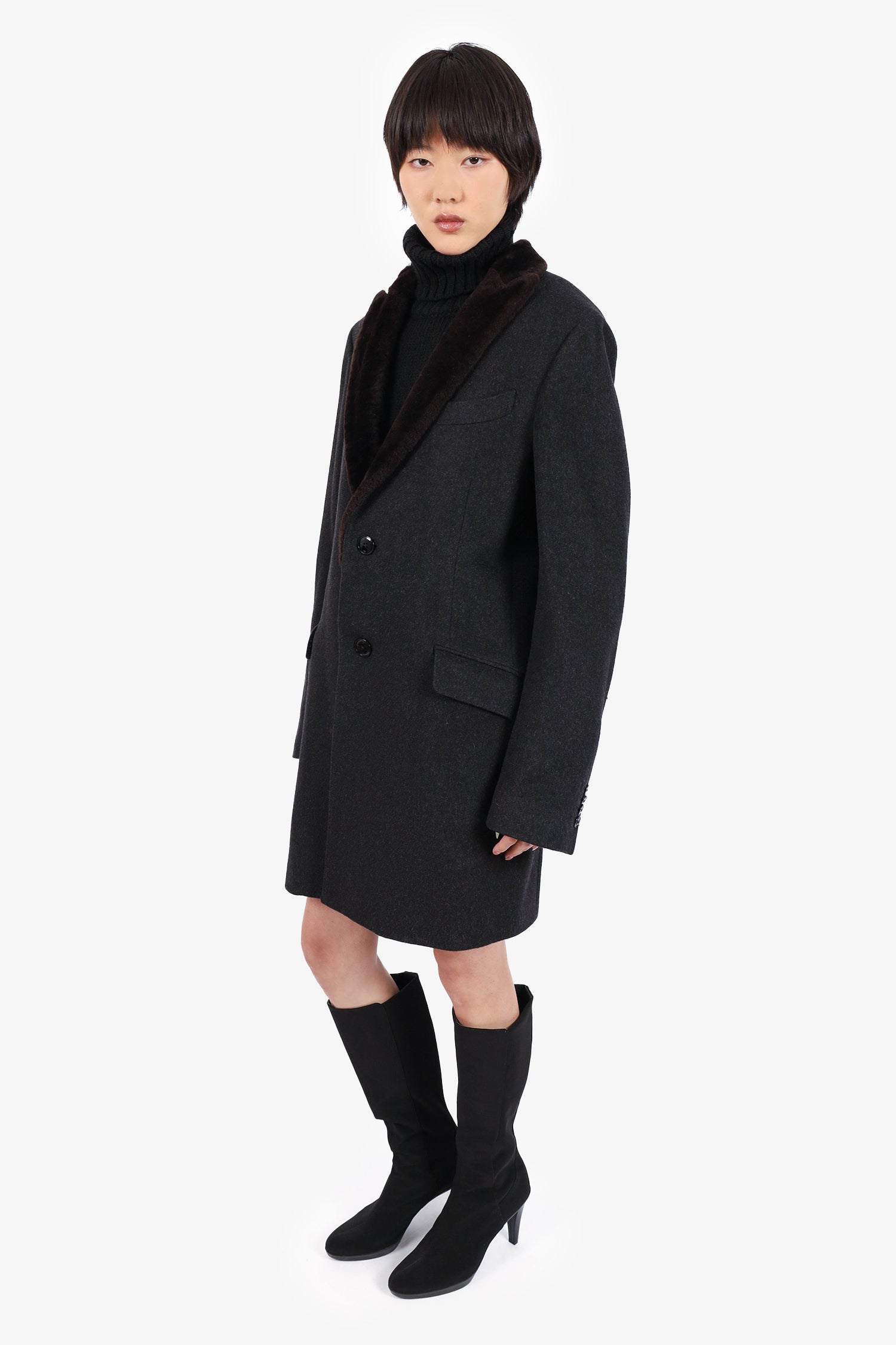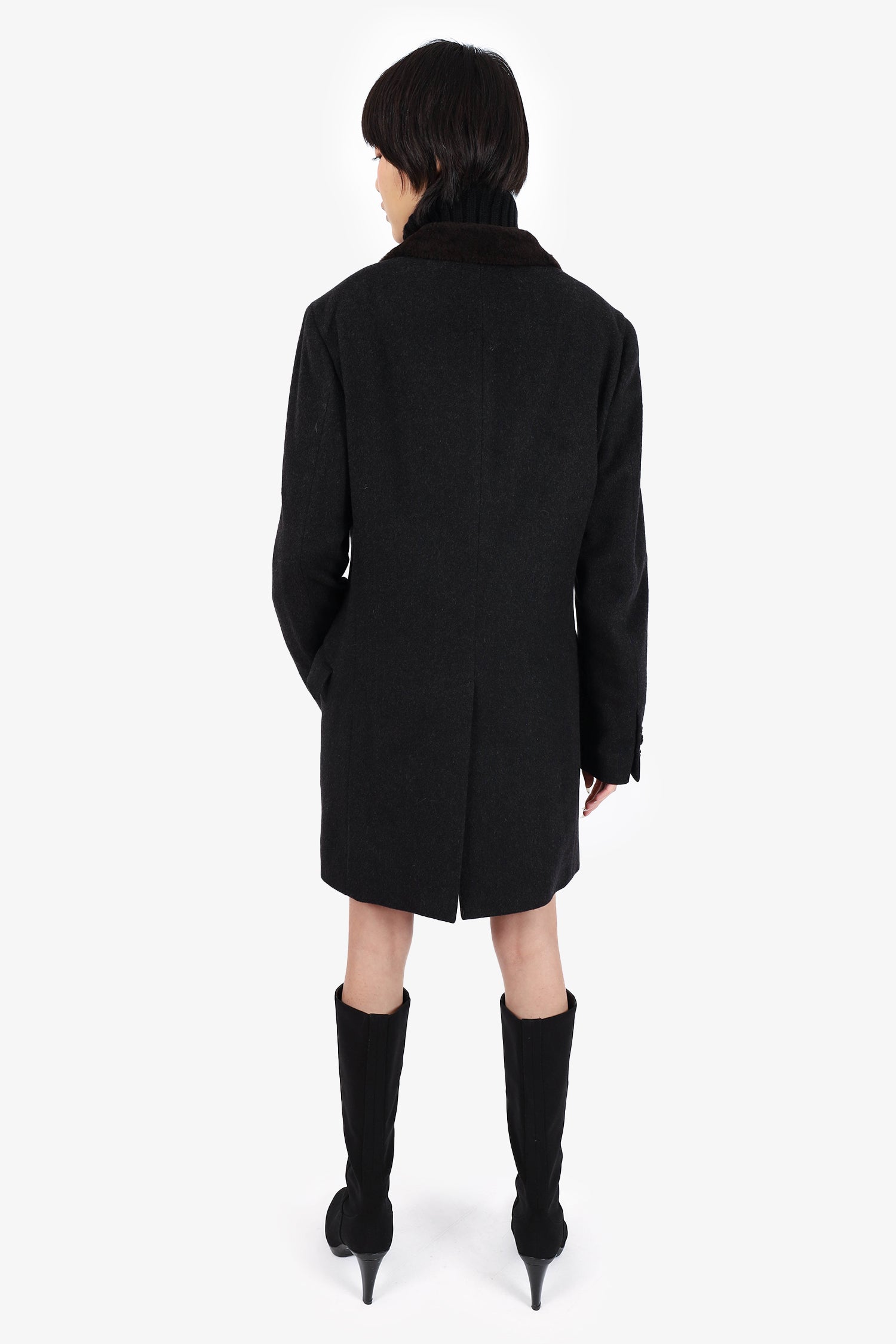 Refresh availabilityEtro Grey Cashmere Shearling Collar Coat. Peaked lapel. Front button-up closure. 2 front fold-over flap slip pockets. Button-up sleeve cuff closure. Rear vent. Lined. Tonal stitching.