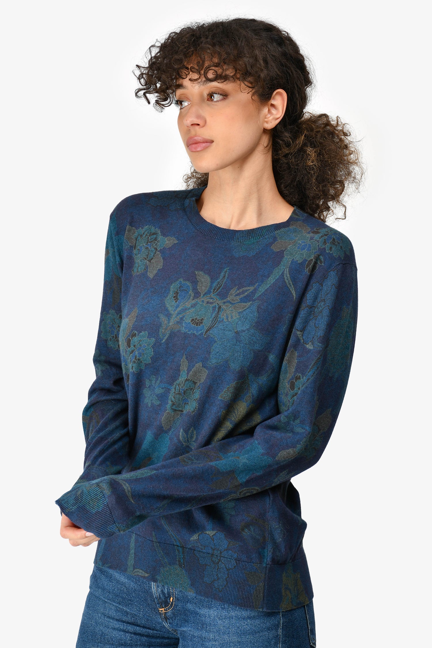 Etro Navy Floral Print Round Neck Long Sleeve Sweater Size S