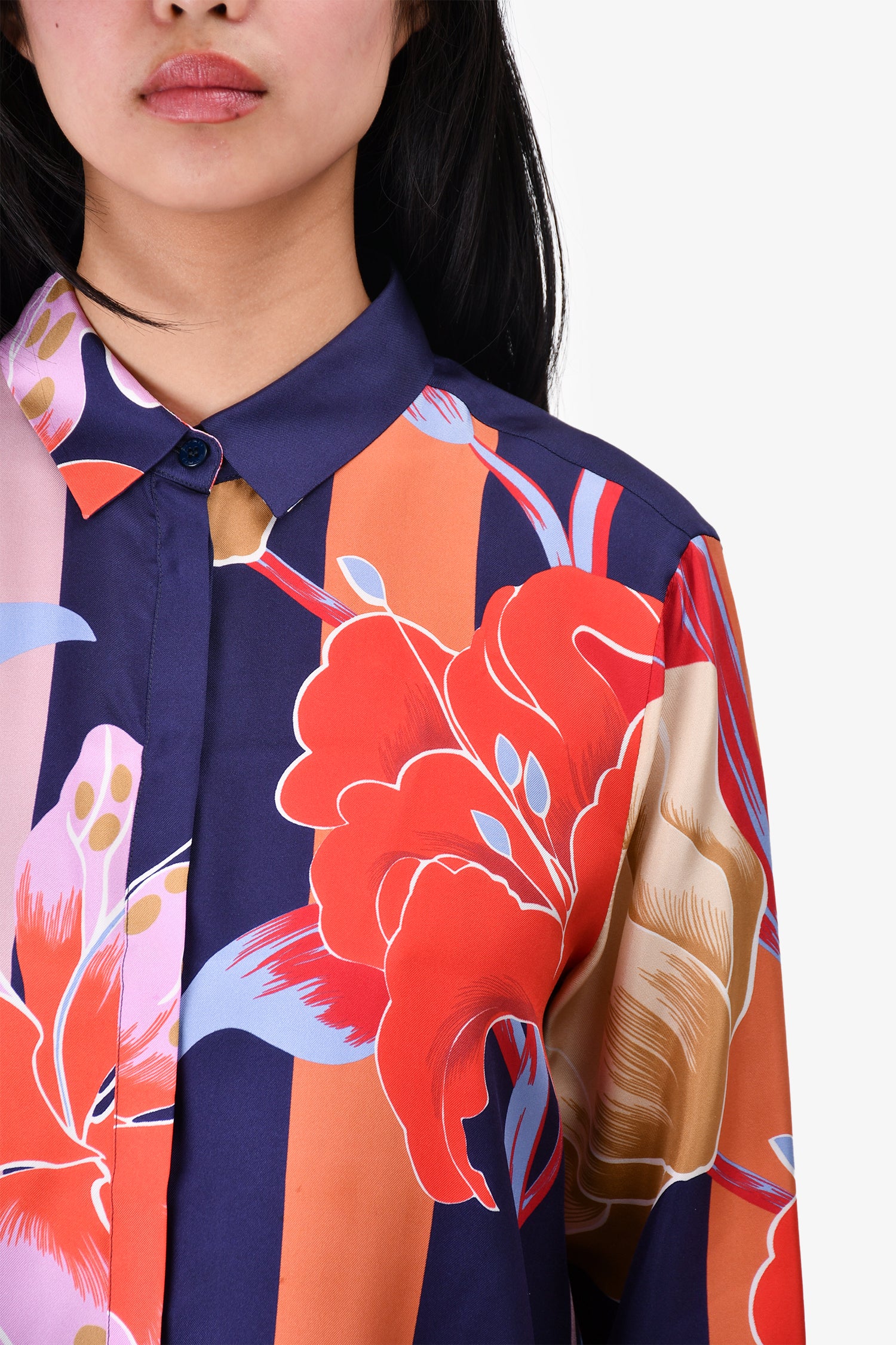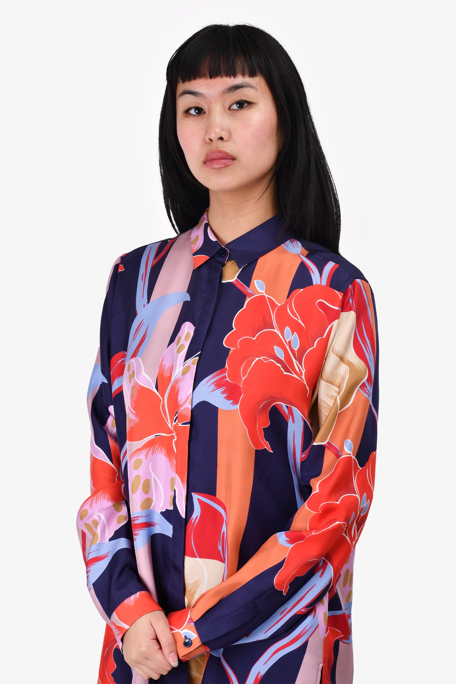 Refresh availabilityEtro Navy/Multi Floral Print Satin Blouse. Front button-up closure. Button closure on the cuffs. Tonal stitching.