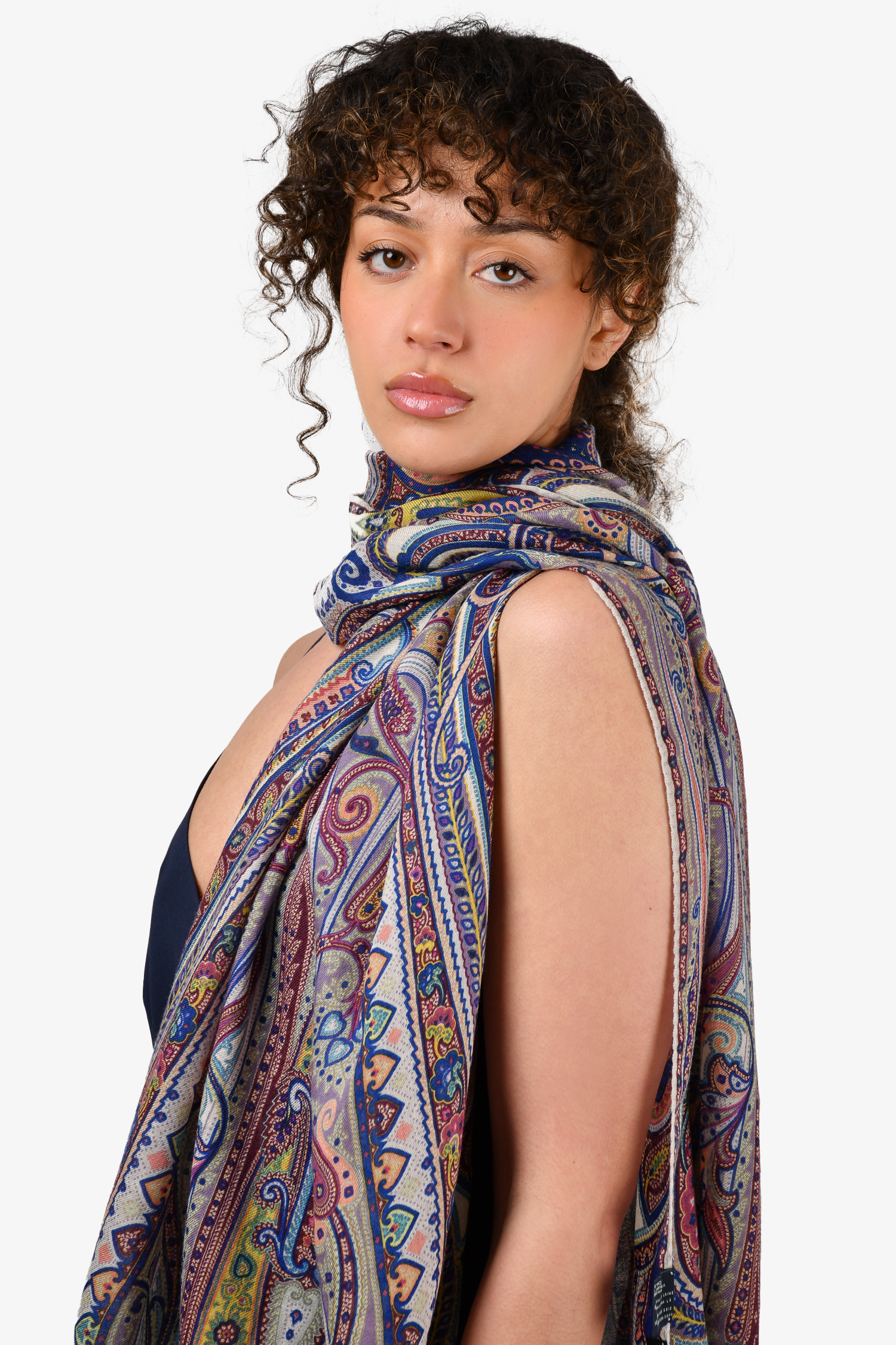 Etro Purple/Blue Paisley Wool/Silk Raw Edge Scarf