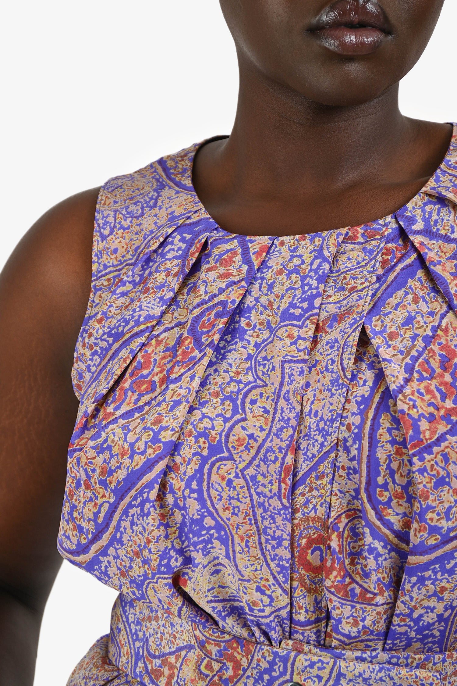 Refresh availabilityEtro Purple Printed Silk Sleeveless Dress. Hidden back zip closure. Detachable belt. Contrast lining. Tulip-shaped front layer. Tonal stitching.