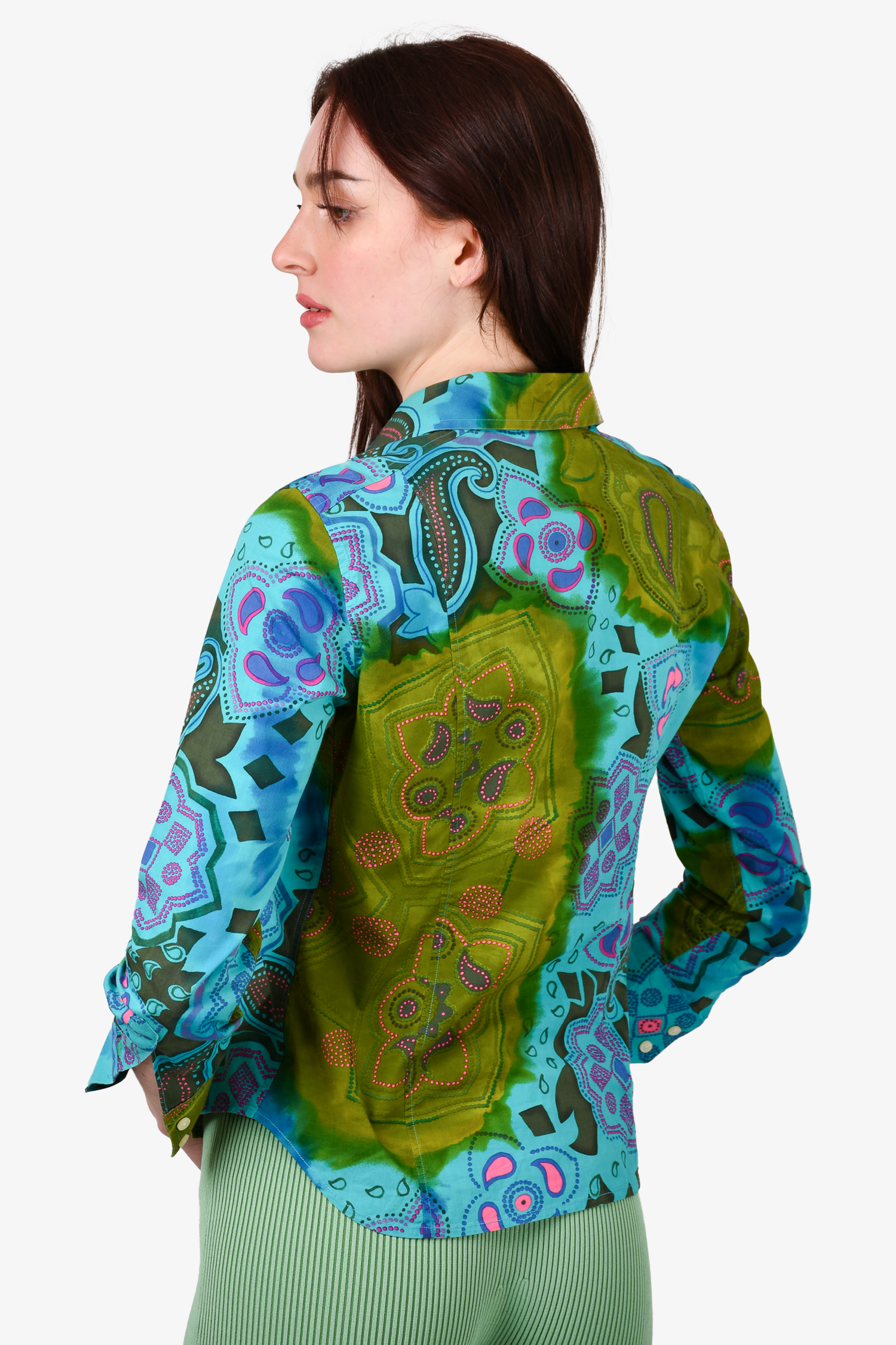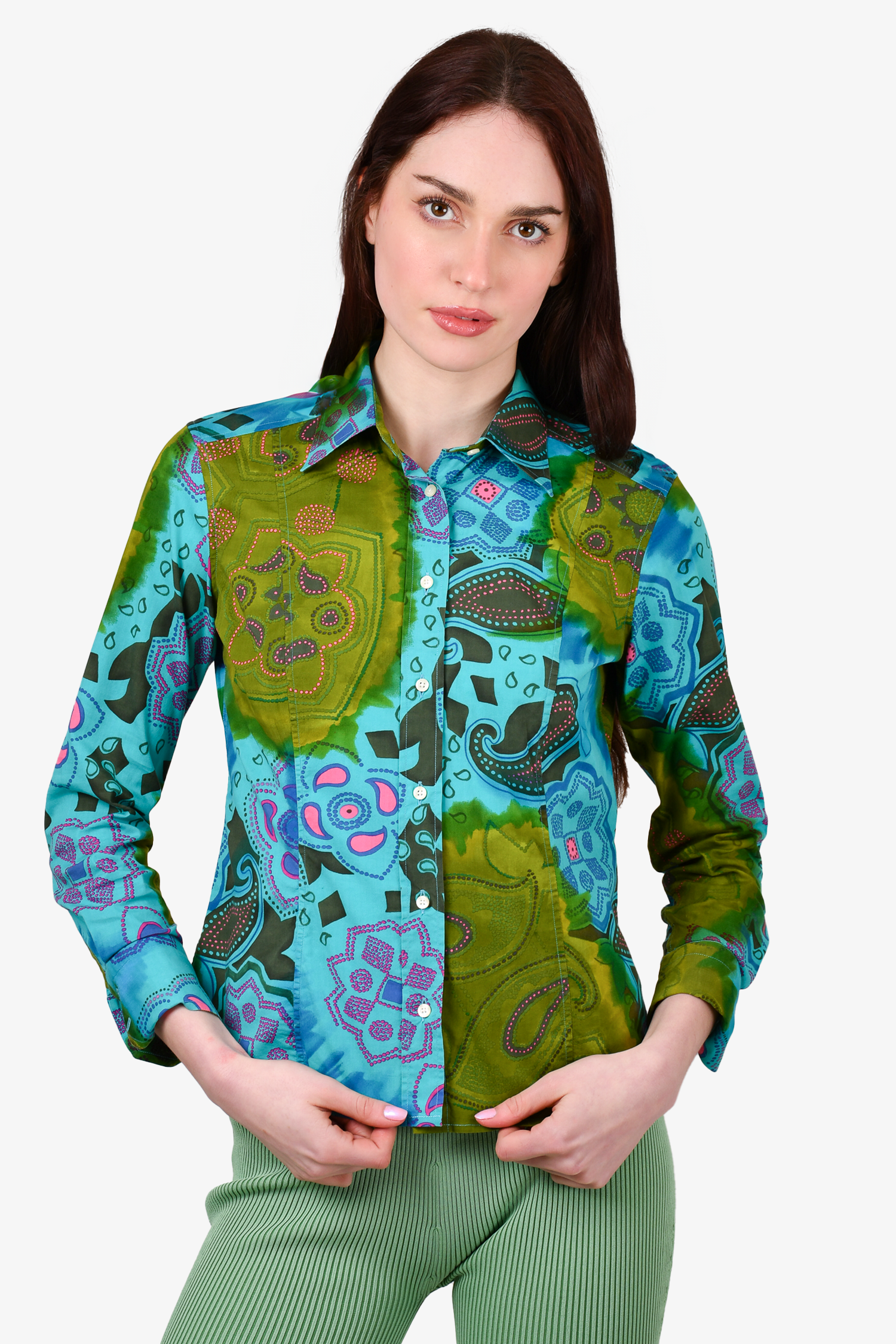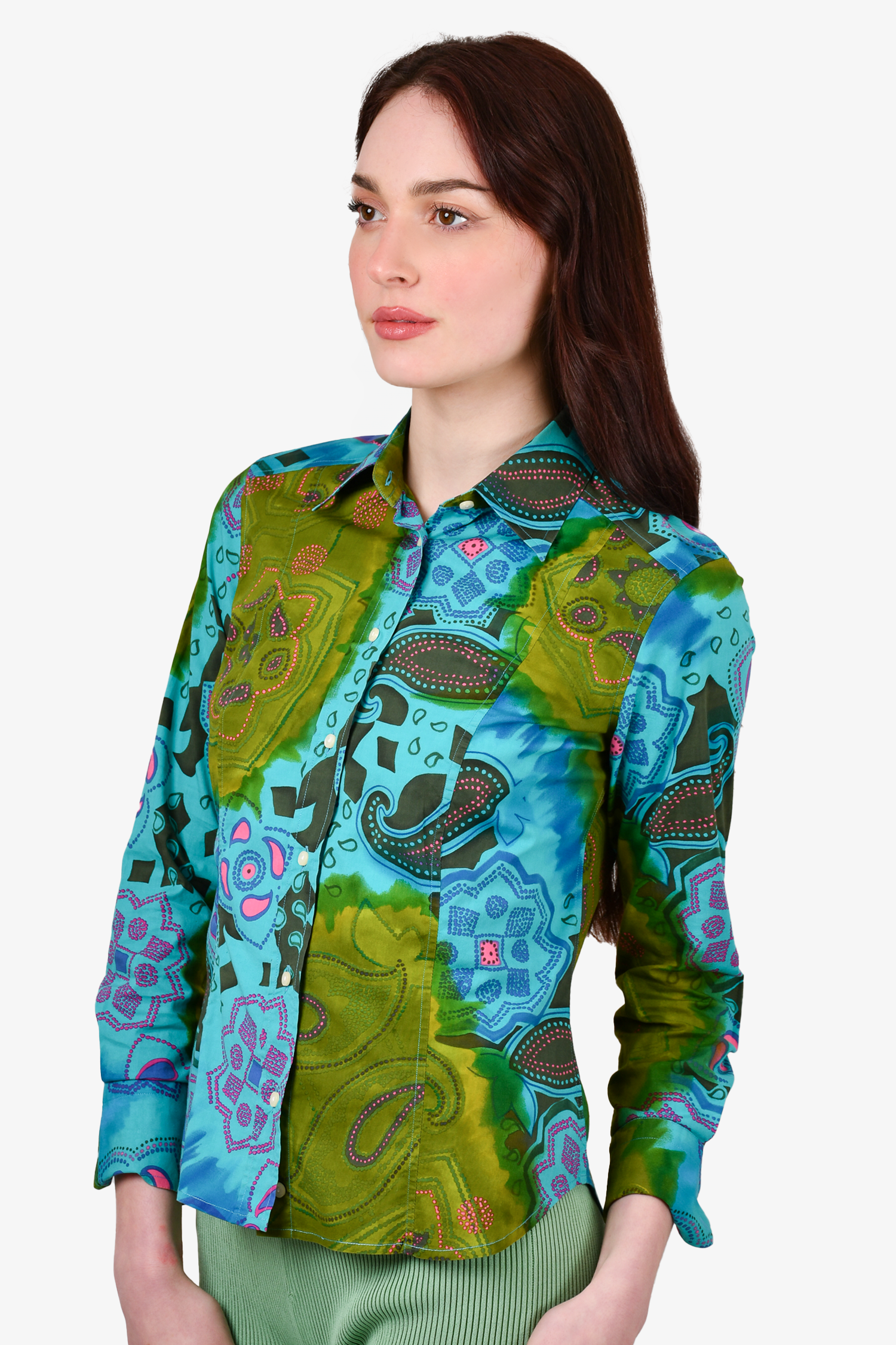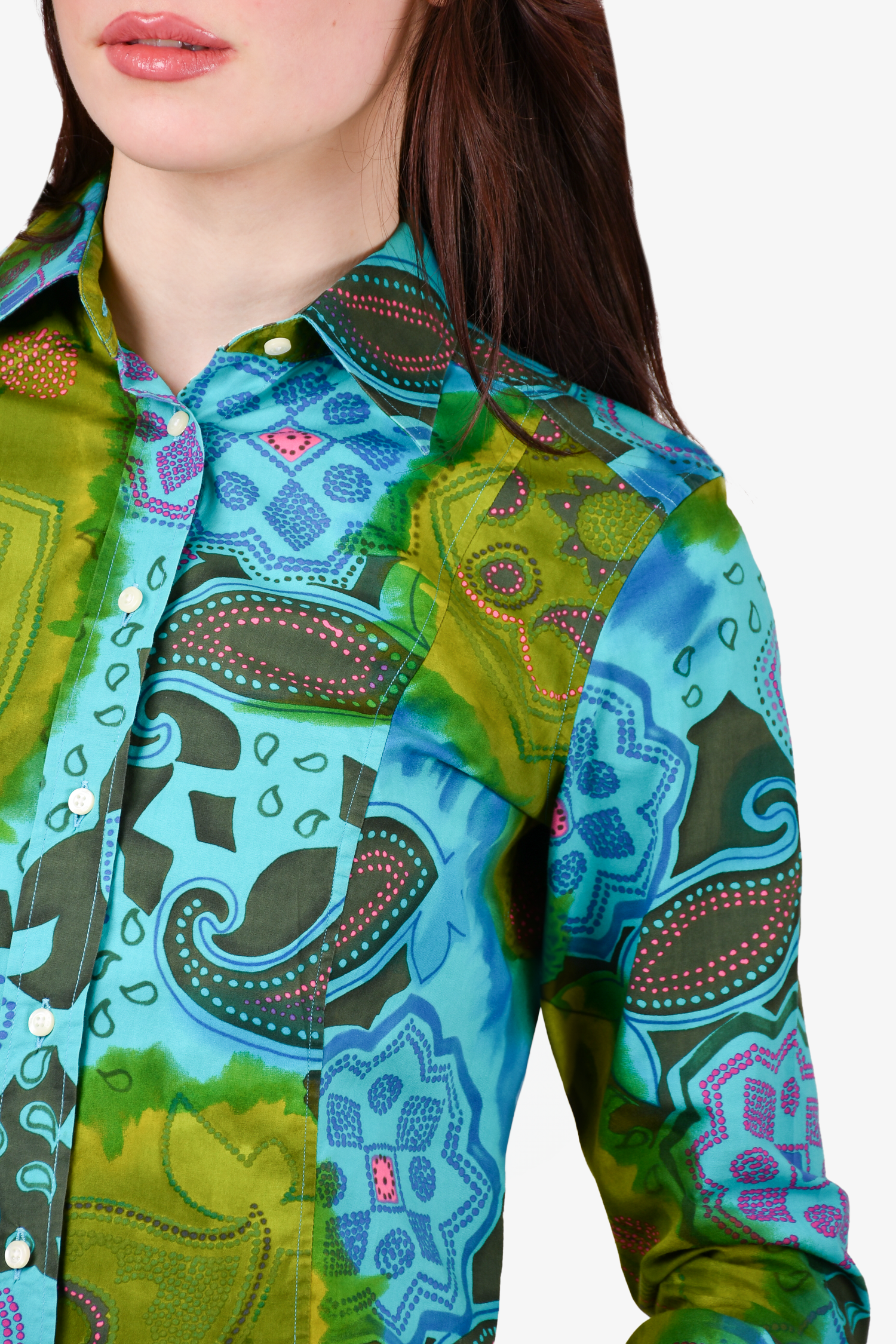 Refresh availabilityEtro Turquoise Patterned Button Down Top. Button closures on the cuffs. Tonal stitching.