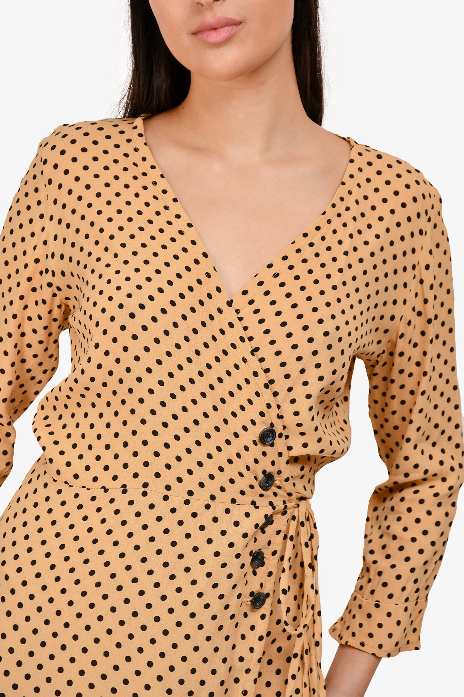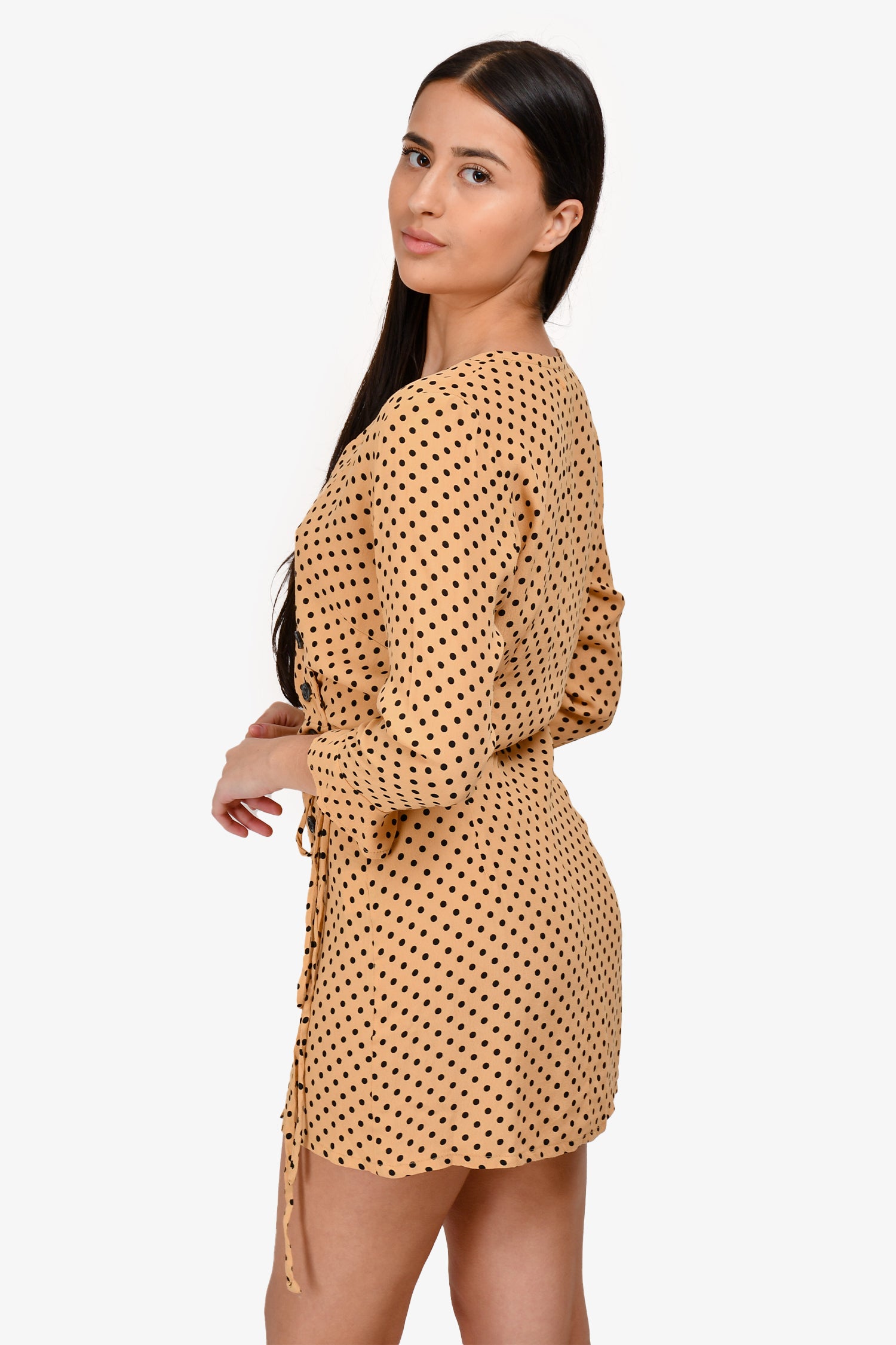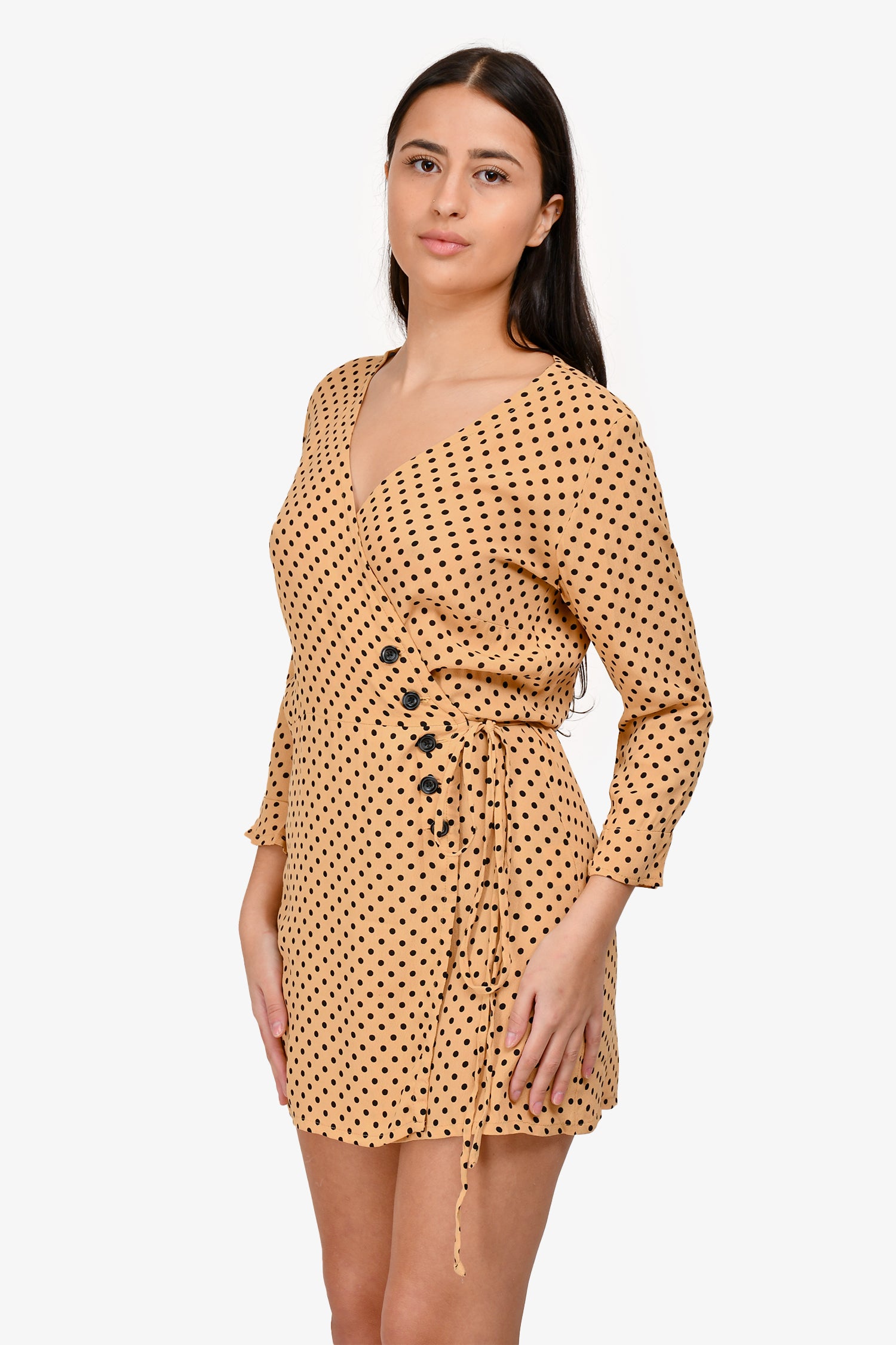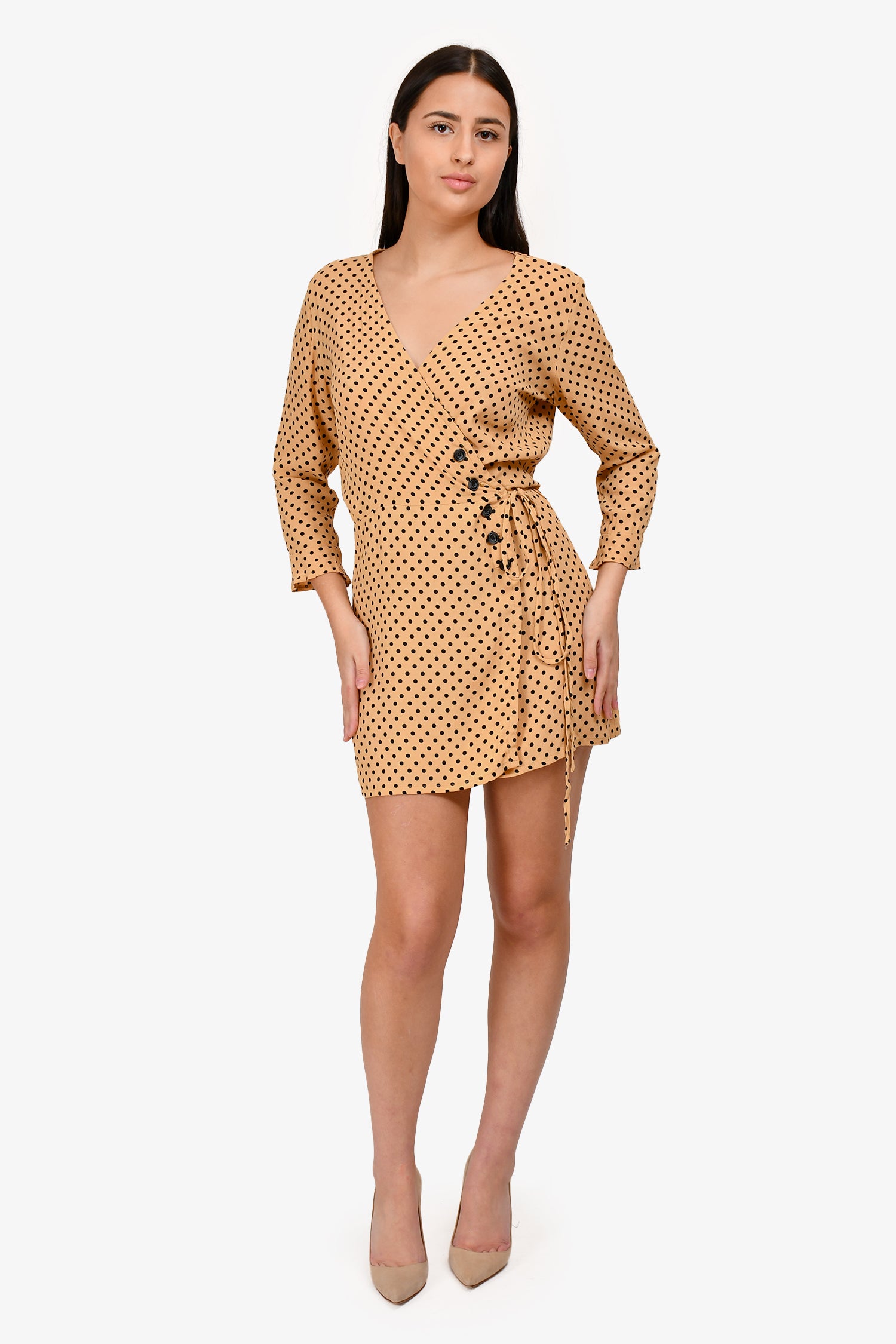 Refresh availabilityFaithfull The Brand Beige/Black Polkadot Mini Dress. Button fastenings. Wrap-arounf tie. Tonal stitching.
