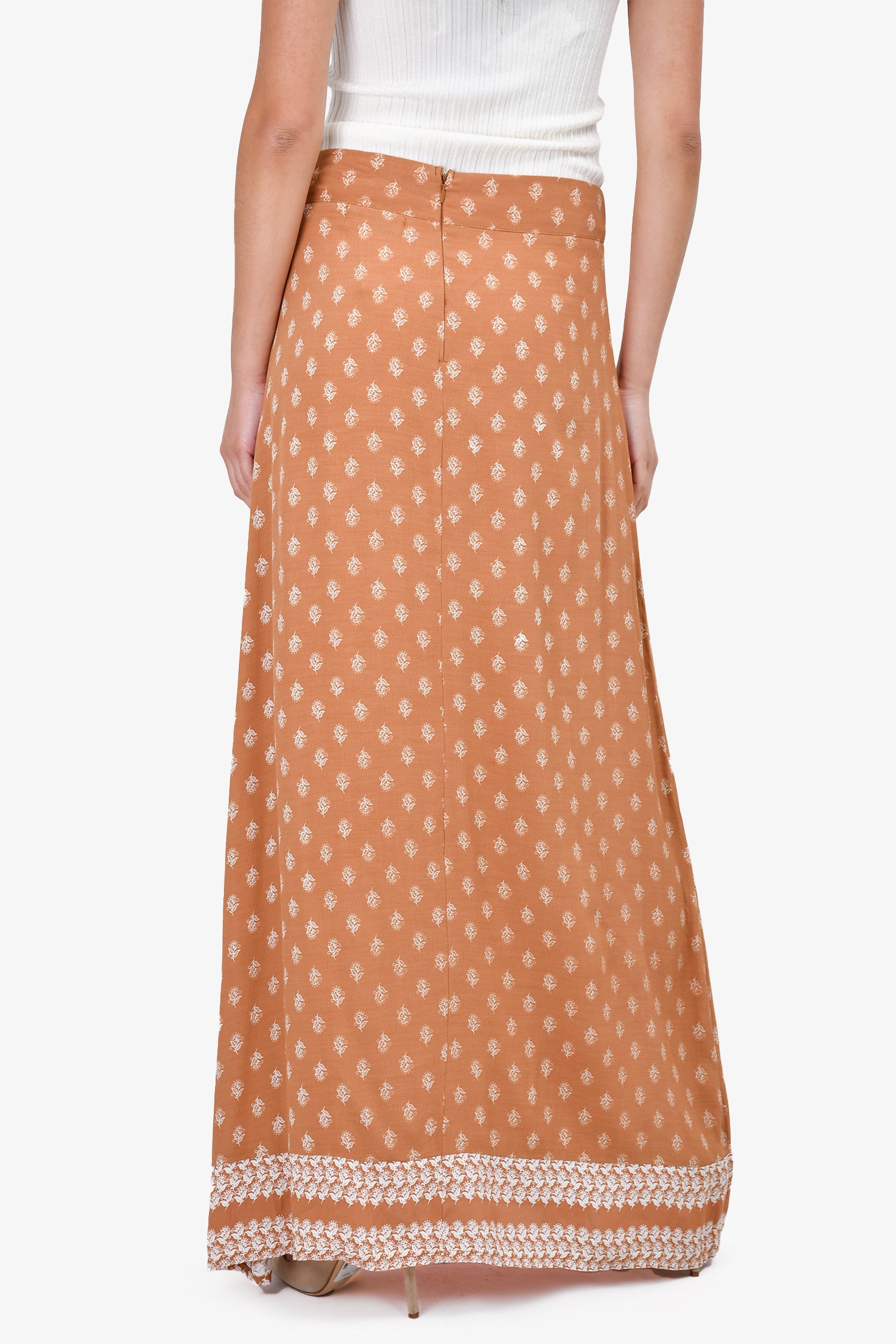 Refresh availabilityFaithfull The Brand Copper Patterned Maxi Skirt. Front layered slit. Back hidden zipper closure. detailing at hem. Unlined. Tonal stitching.