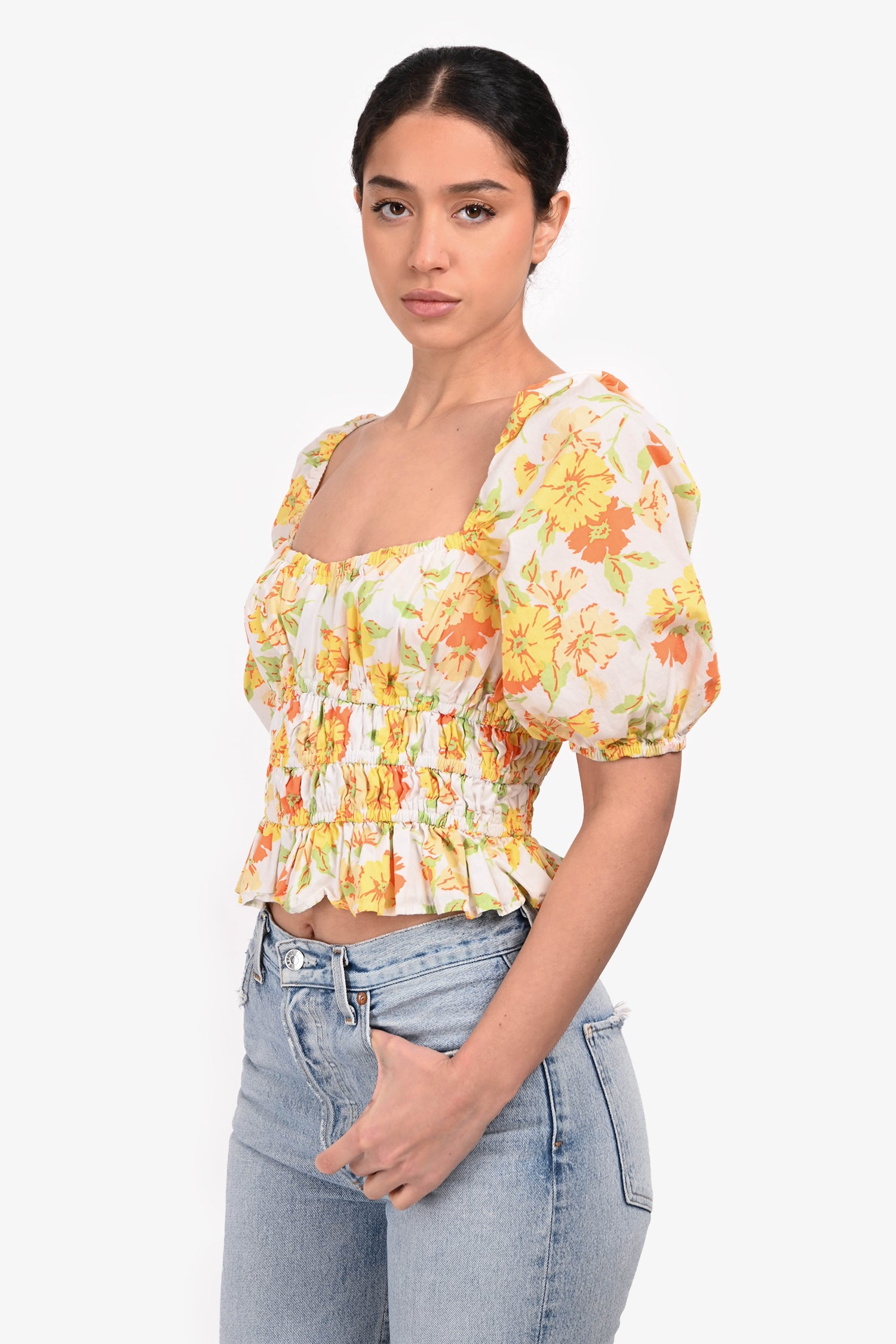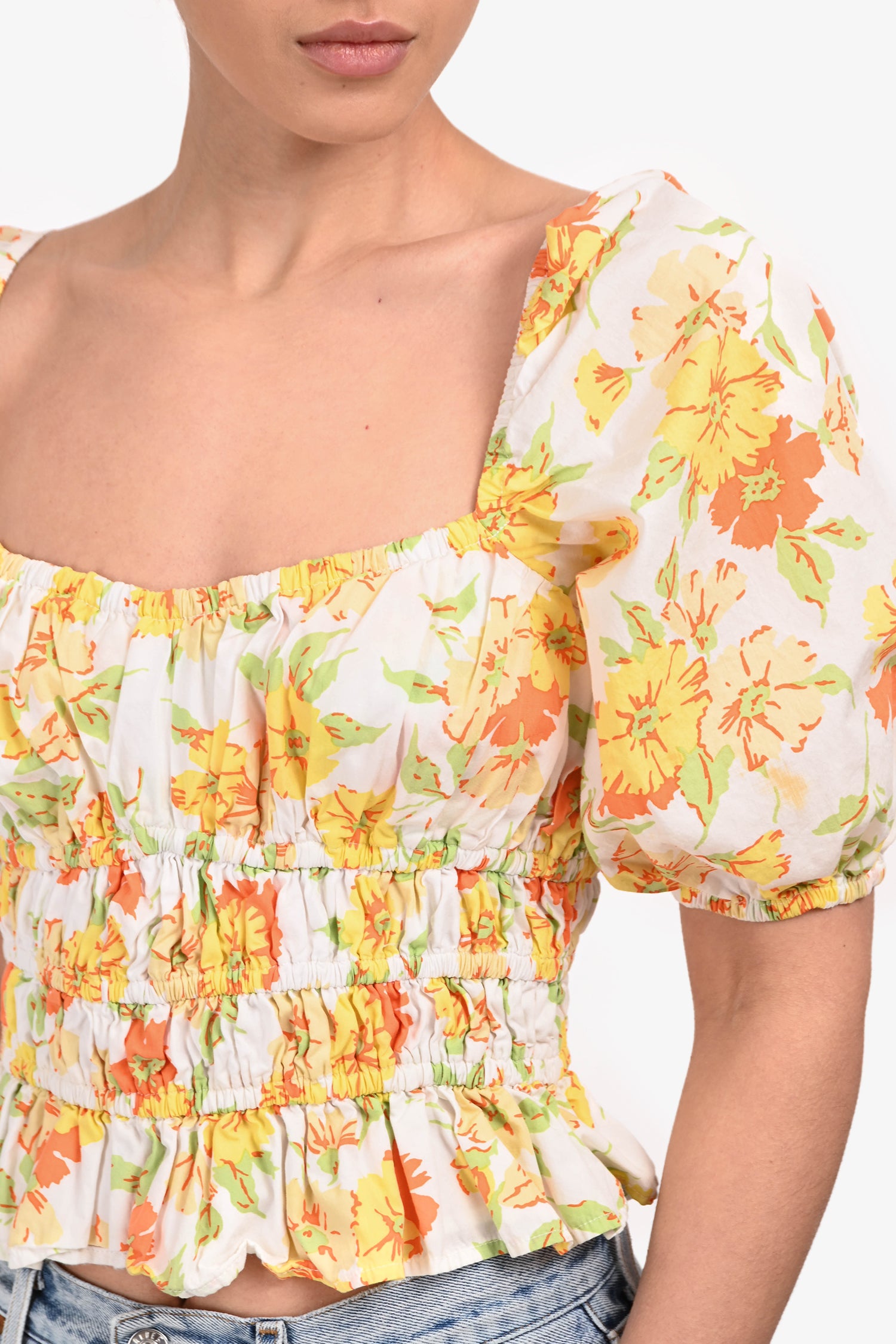 Refresh availabilityFaithfull The Brand Orange/White Floral Cropped Puff Sleeve Top. Elasticated neck, waist, cuffs. Puffed sleeves. Tonal stitching.