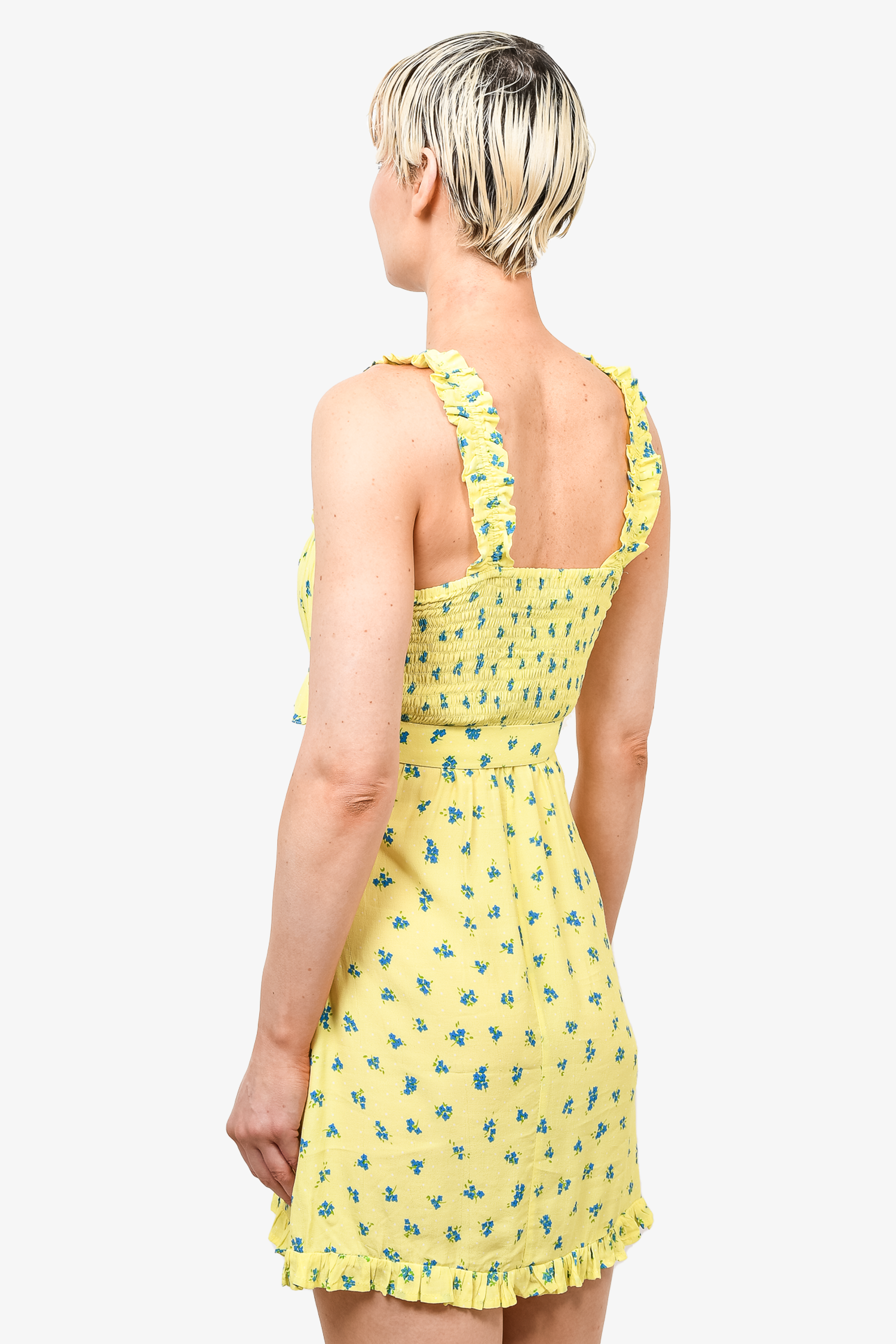 Faithfull The Brand Yellow/Blue Floral Ruffle Strap Mini Dress with Belt Size S