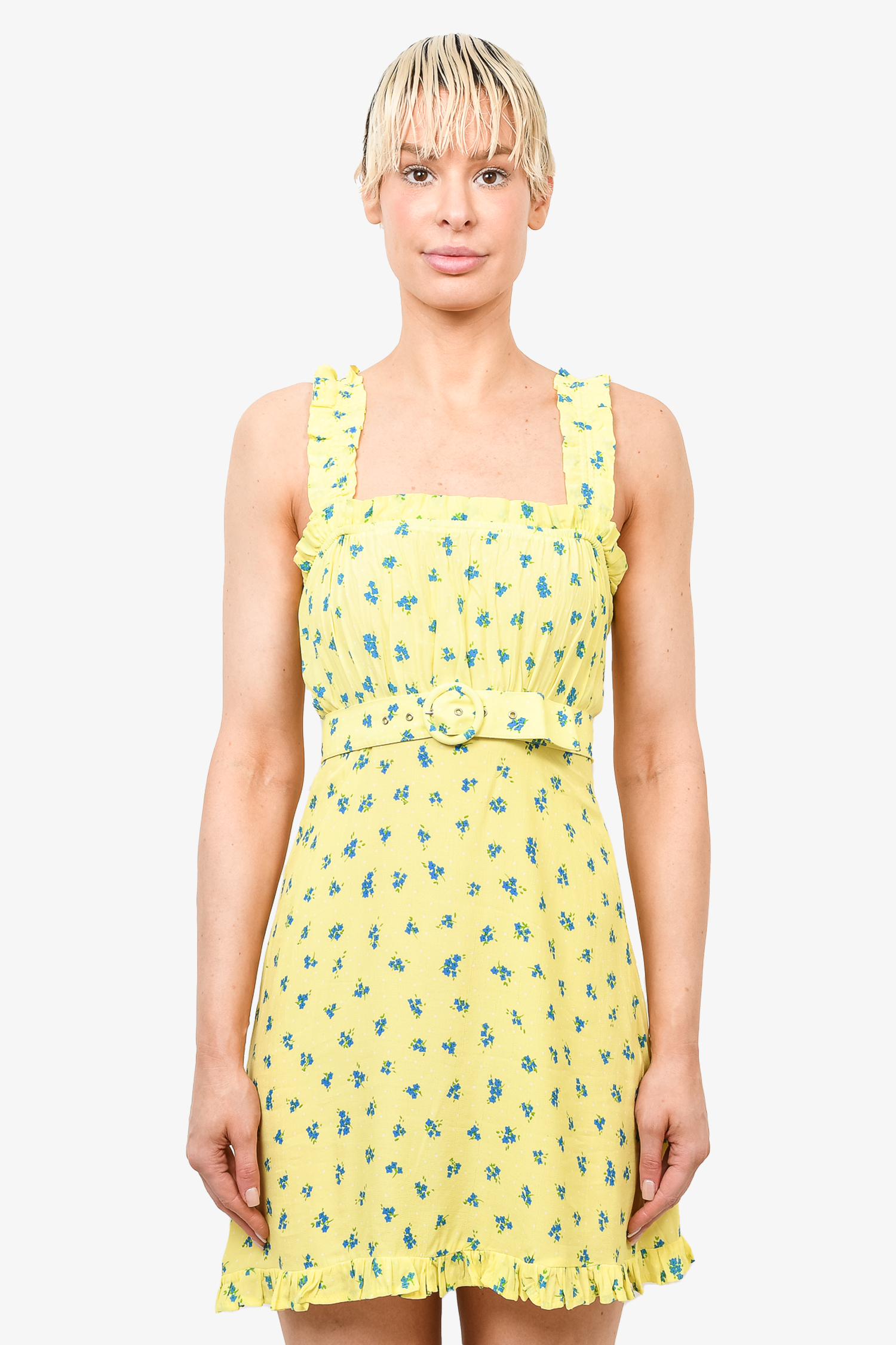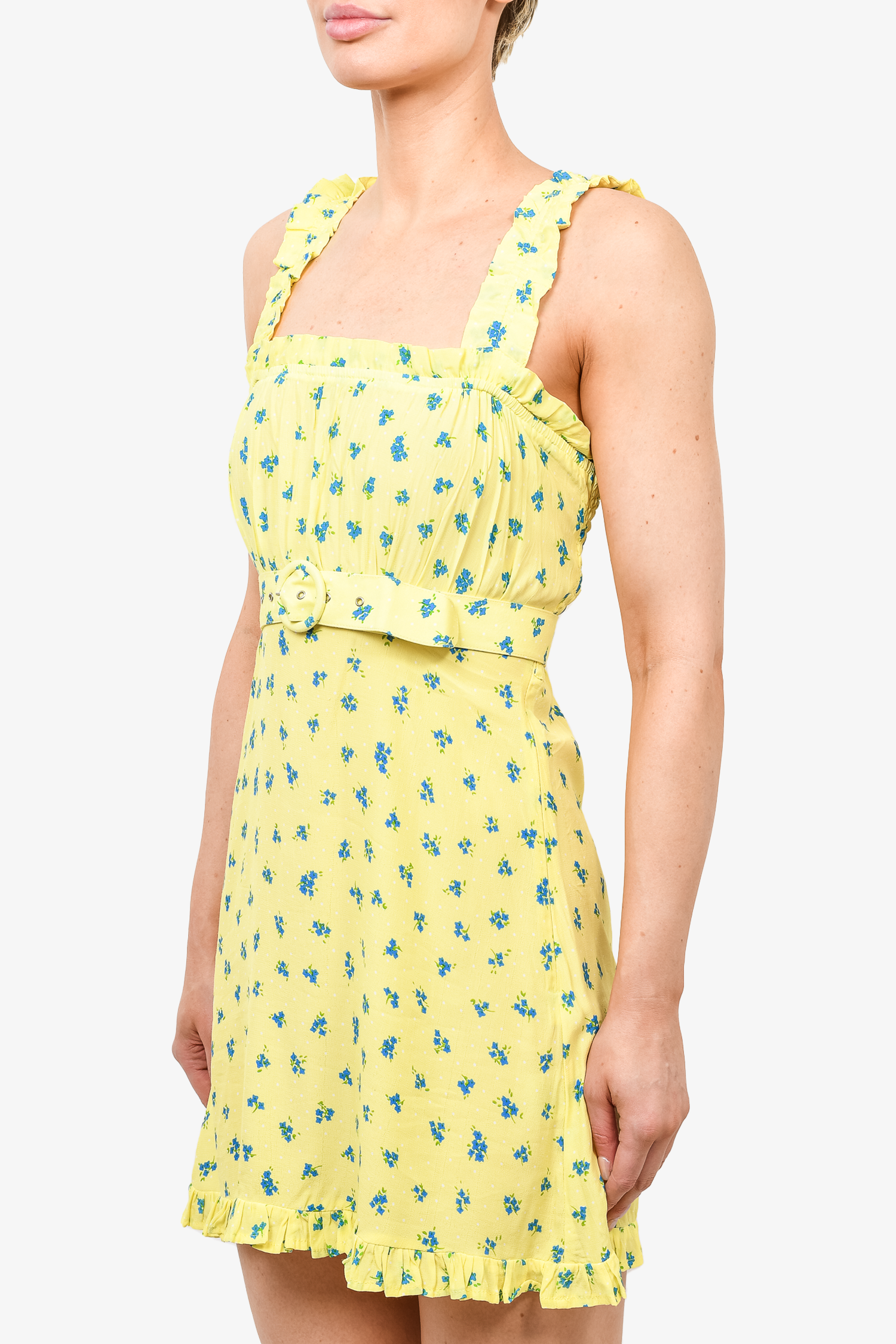 Refresh availabilityFaithfull the Brand Yellow/Blue Floral Ruffle Strap Mini Dress with Belt. Sleeveless. Side zip and hook closure. Unlined. Tonal stitching.