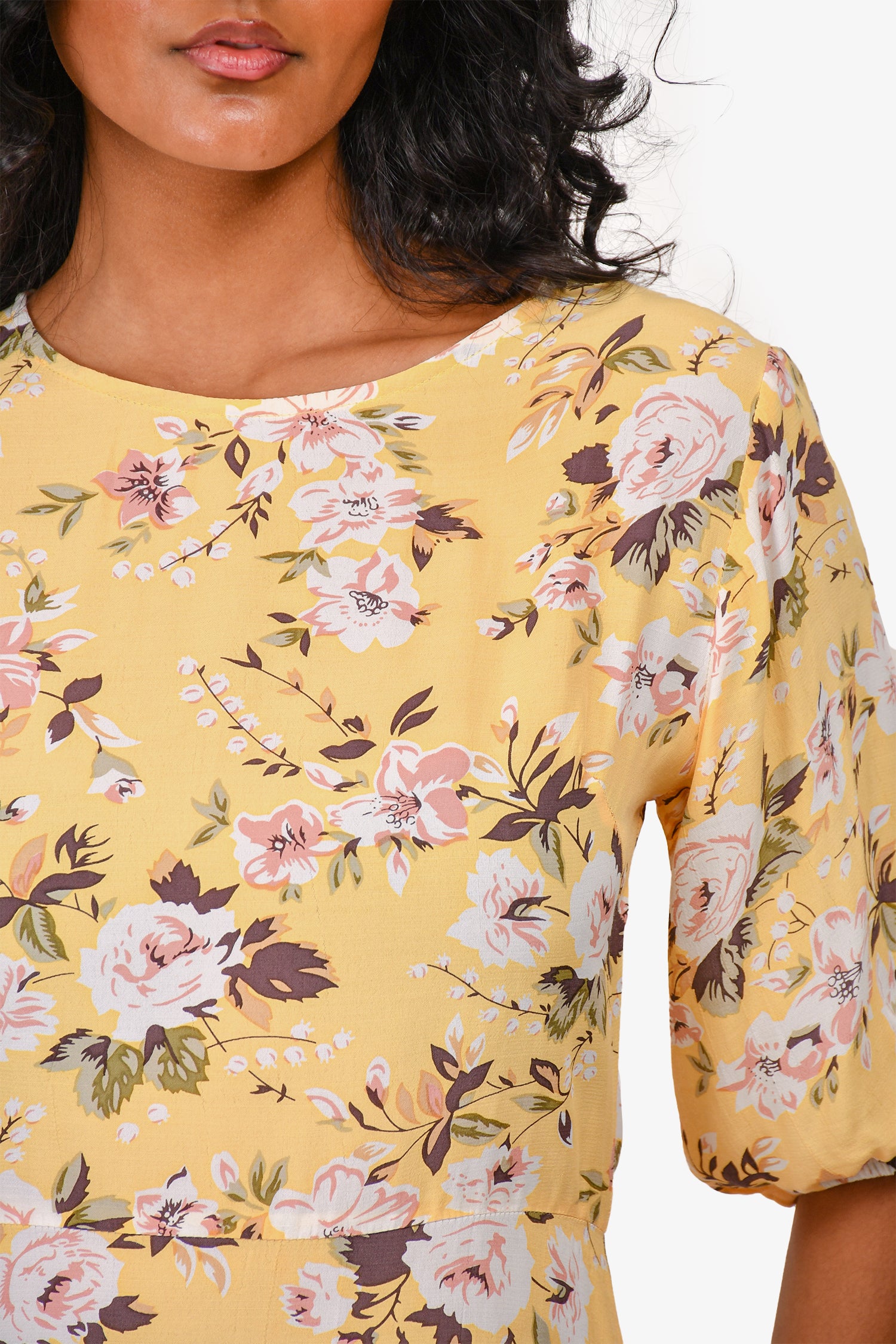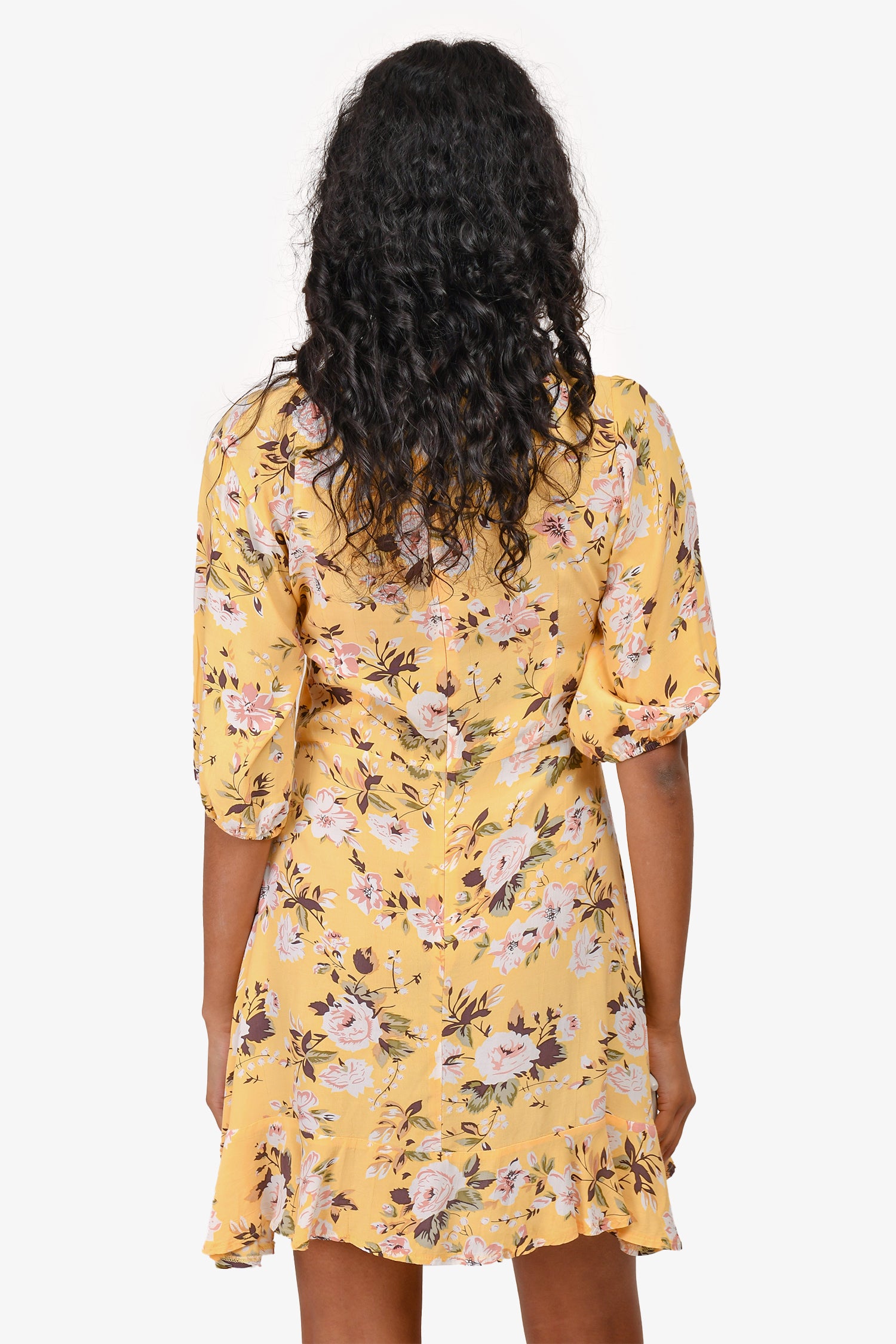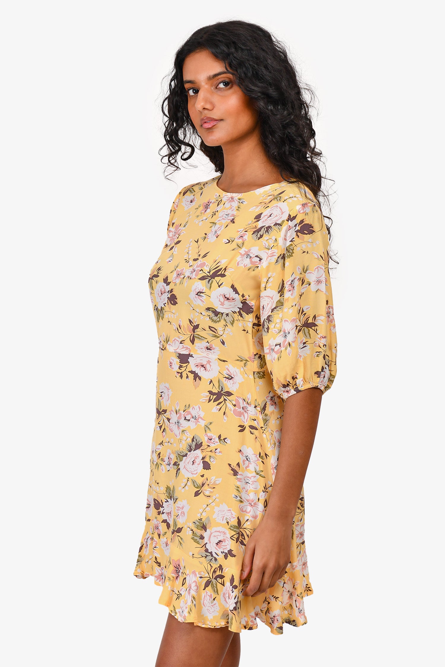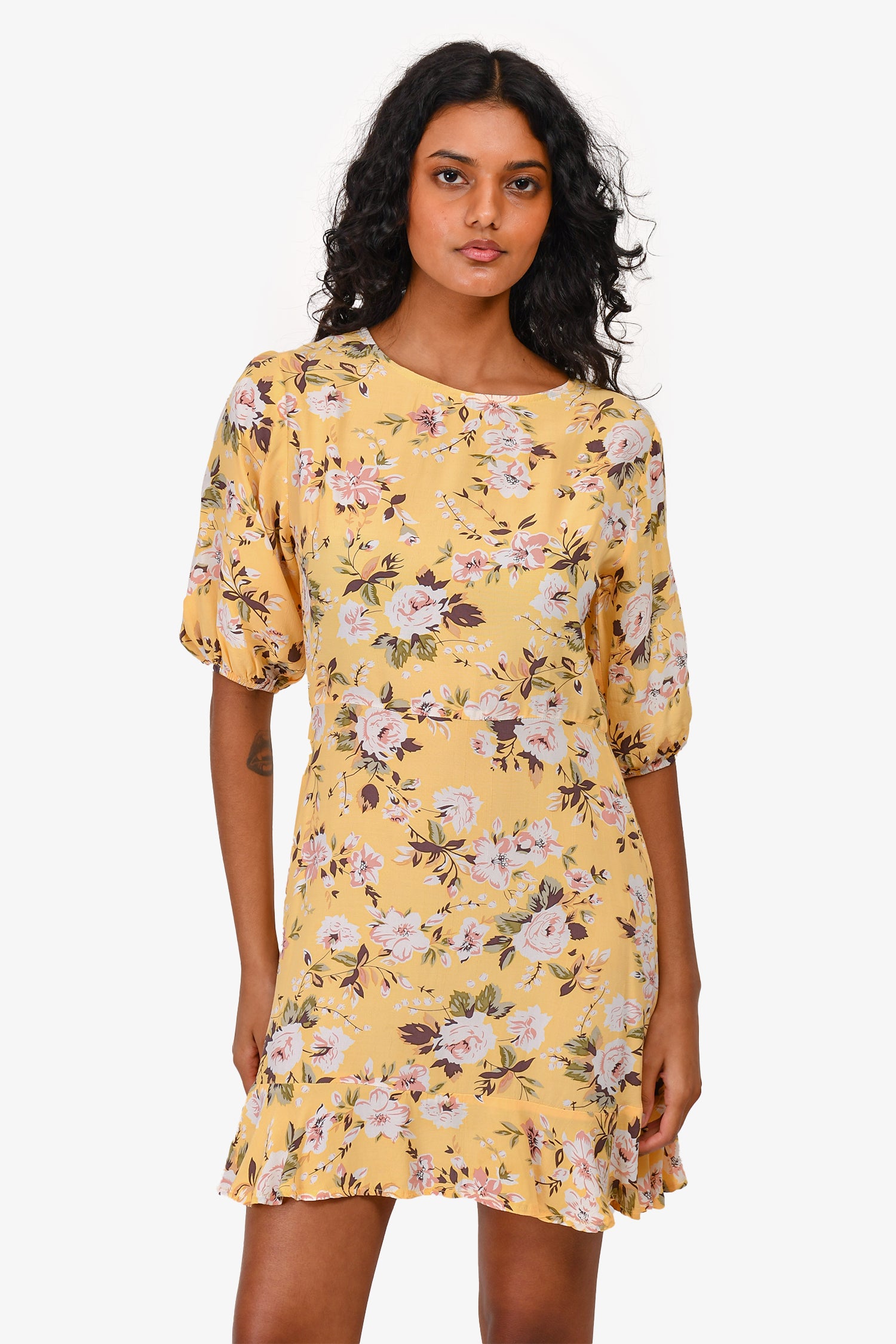 Refresh availabilityFaithfull The Brand Yellow Floral Short-Sleeved Mini Dress. Round neck. Rear zip closure. Unlined. Tonal stitching.