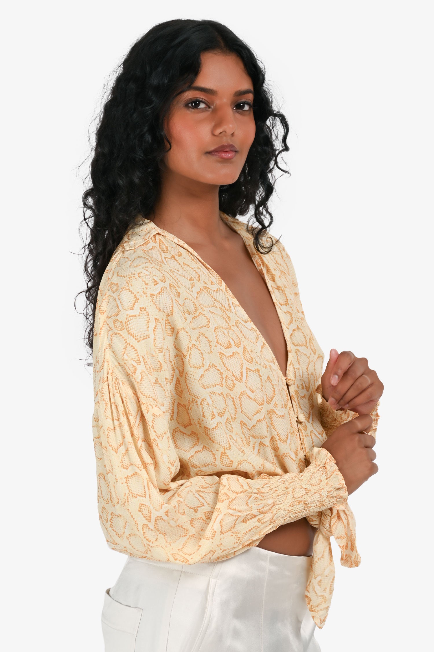 Refresh availabilityFaithfull The Brand Yellow Snakeskin Print Blouse. Front button closures. Elasticized cuffs. Tonal stitching.