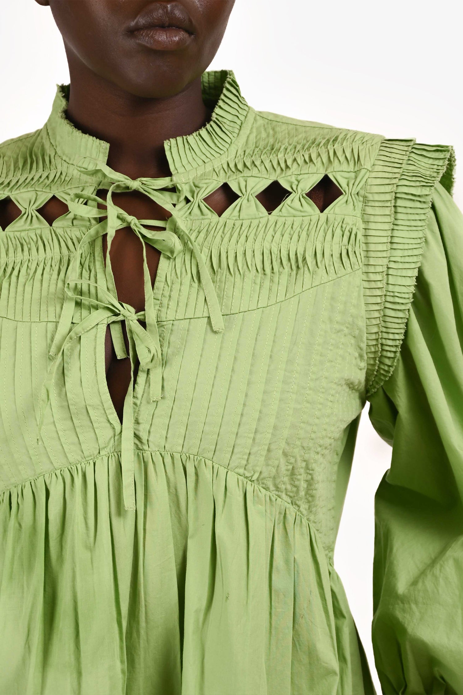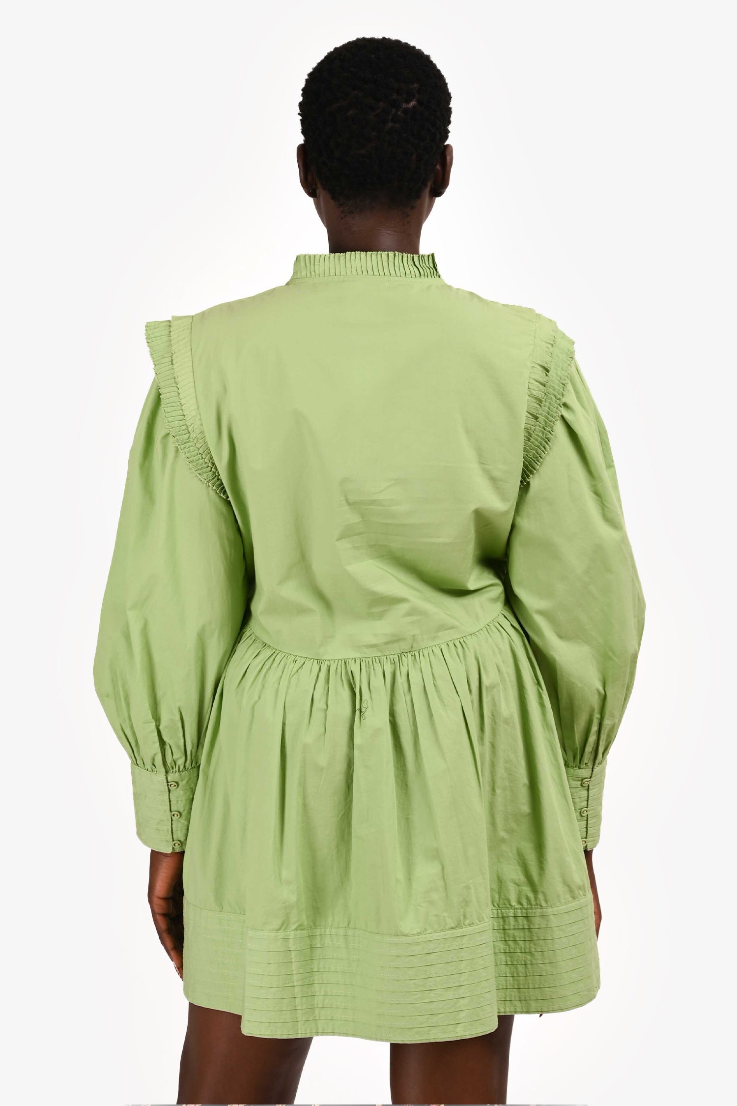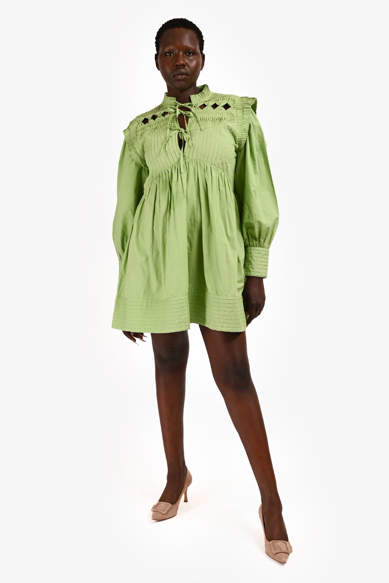 Refresh availabilityFarm Rio Green Cotton Long Sleeve Mini Dress. Adjustable tie detail at front. Long puff sleeves with buttoned cuffs. Tonal stitching.