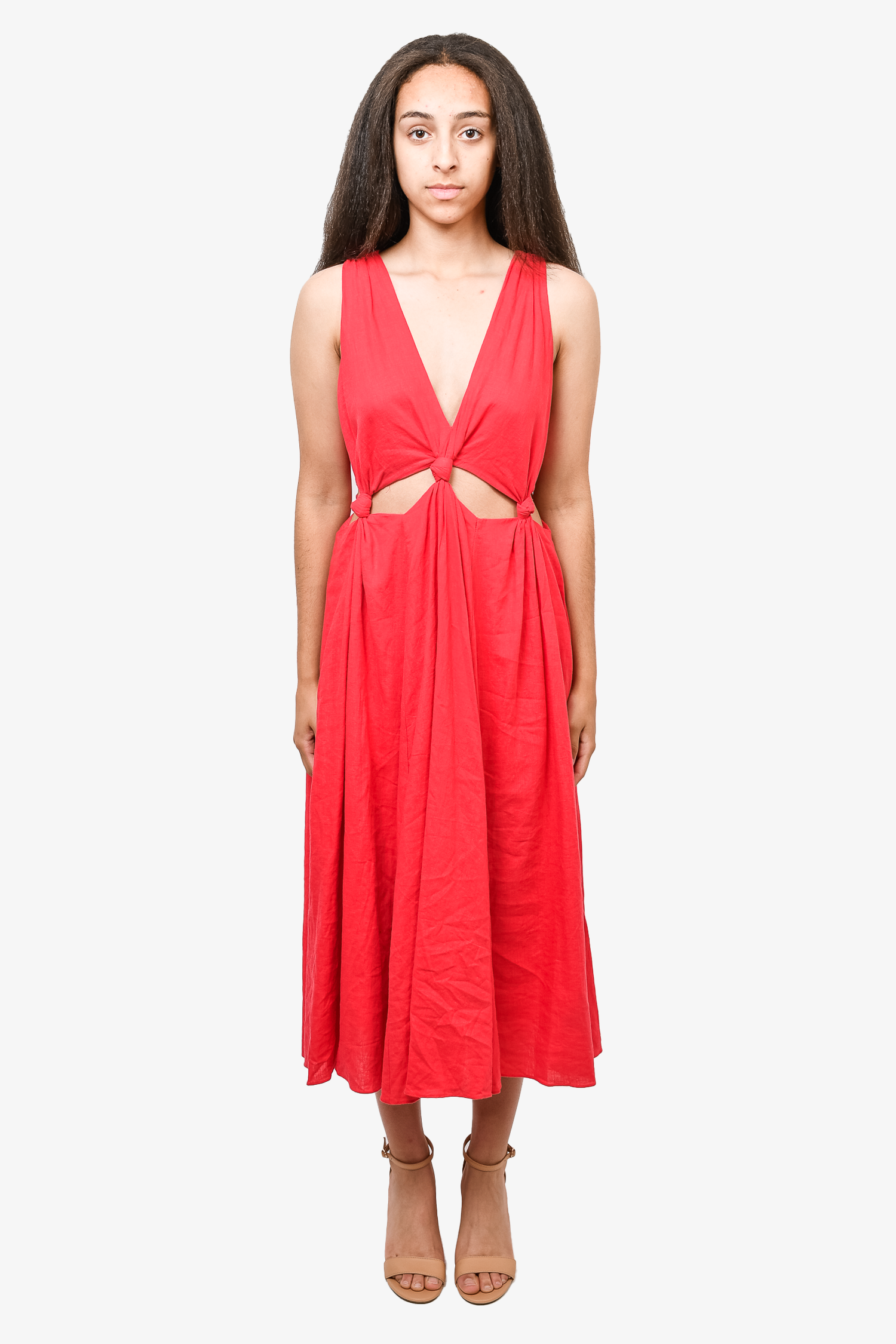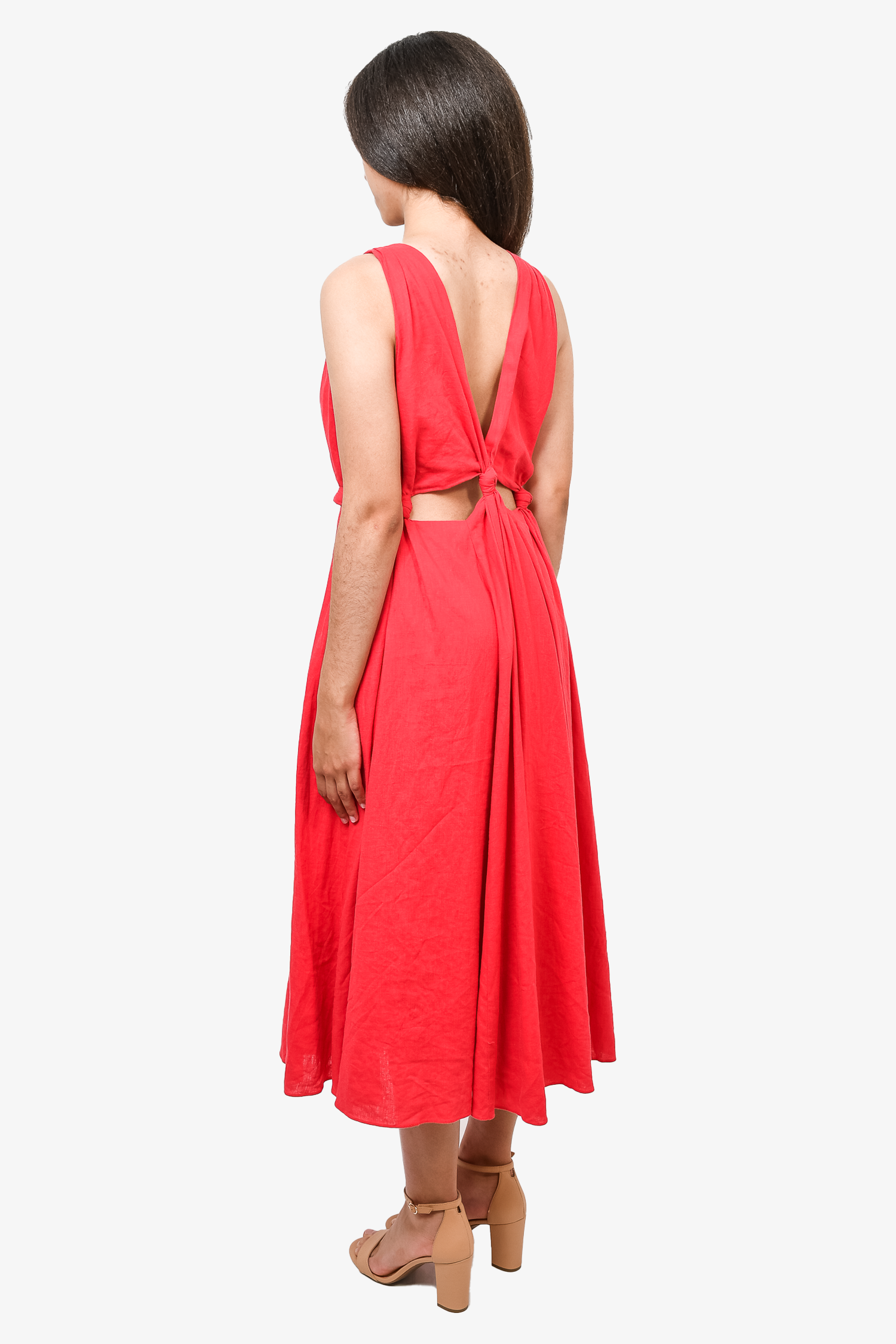 Refresh availabilityFarm Rio Red Linen Cut Out Sleeveless Midi Dress. Slip-on. V neck. Tonal stitching.