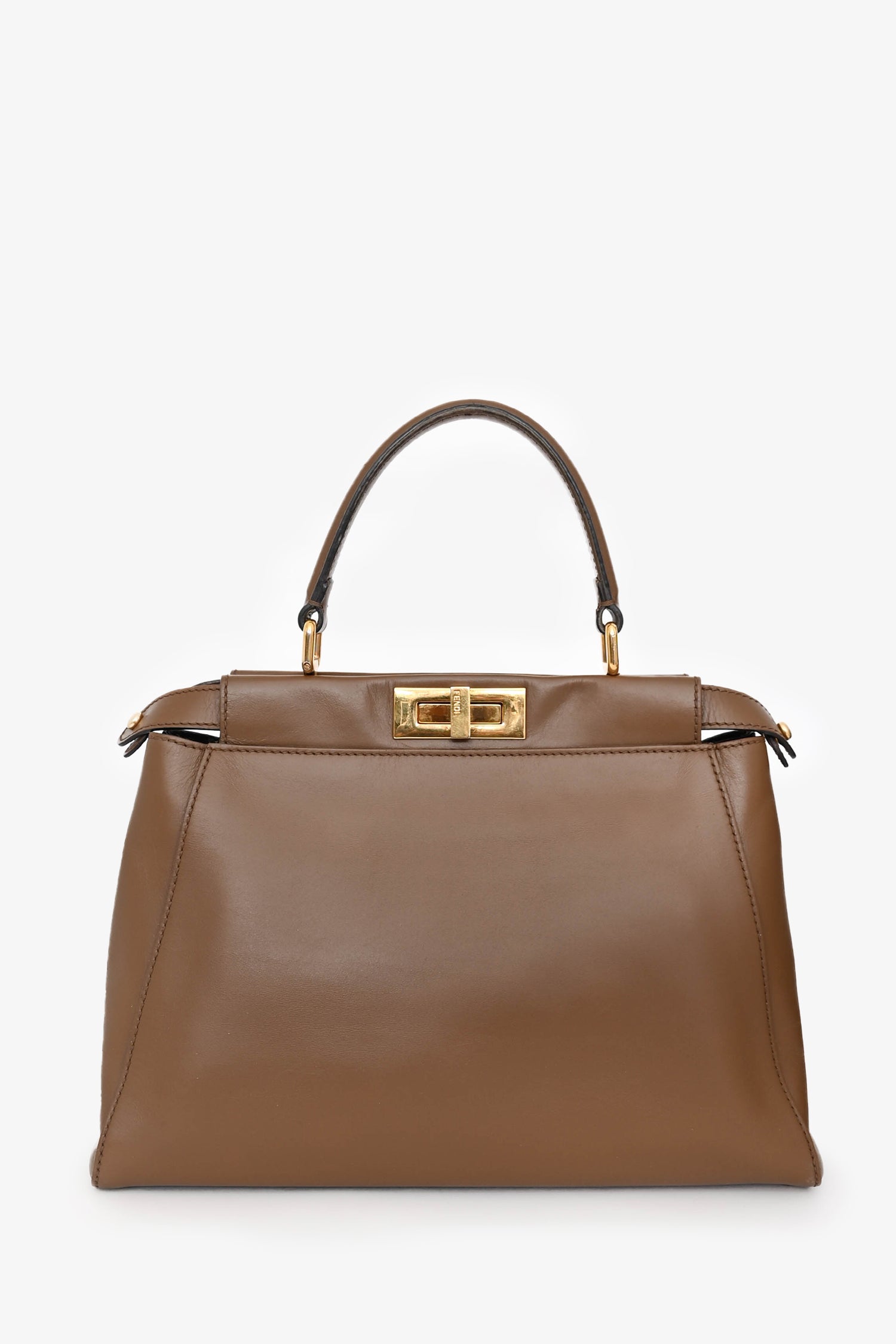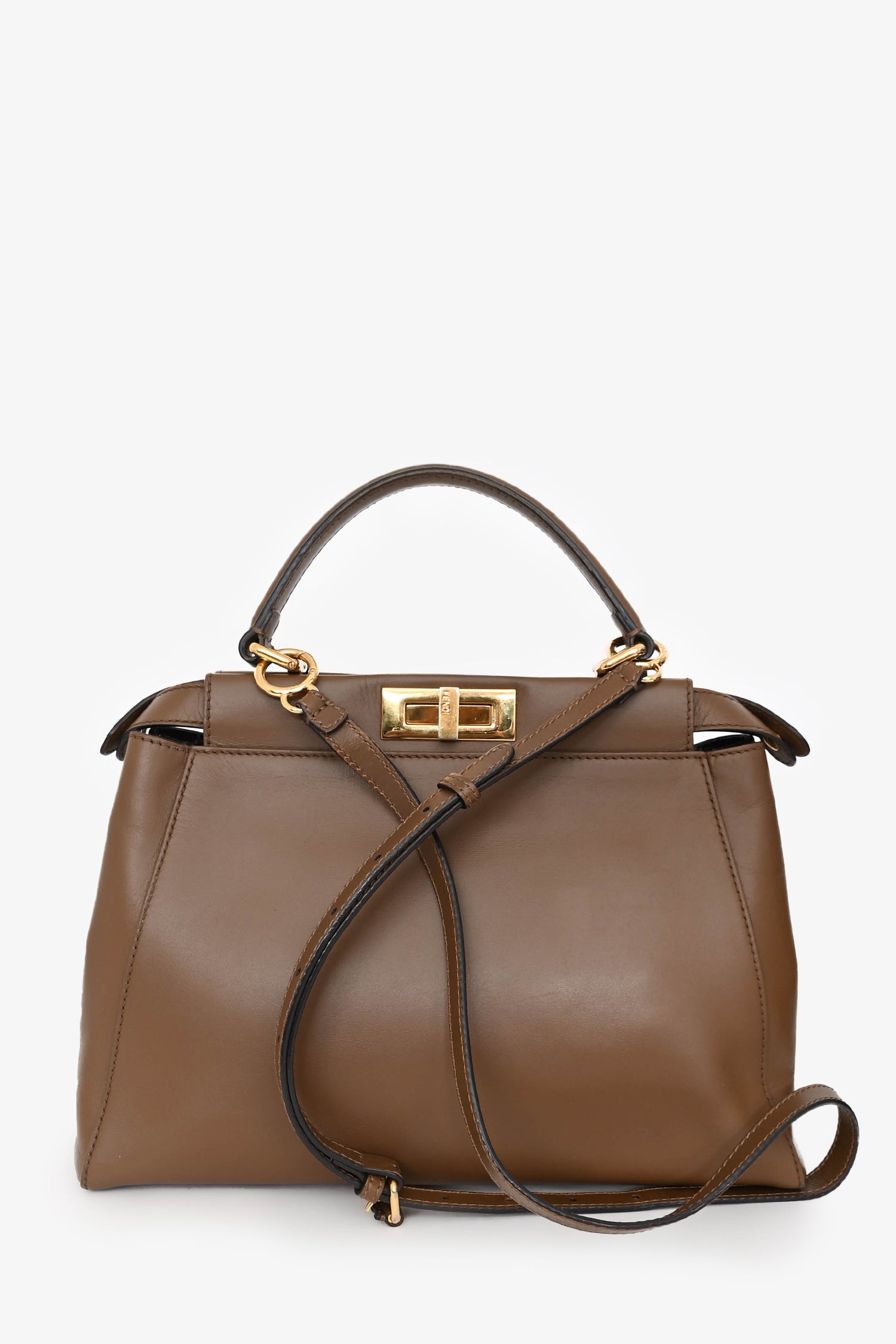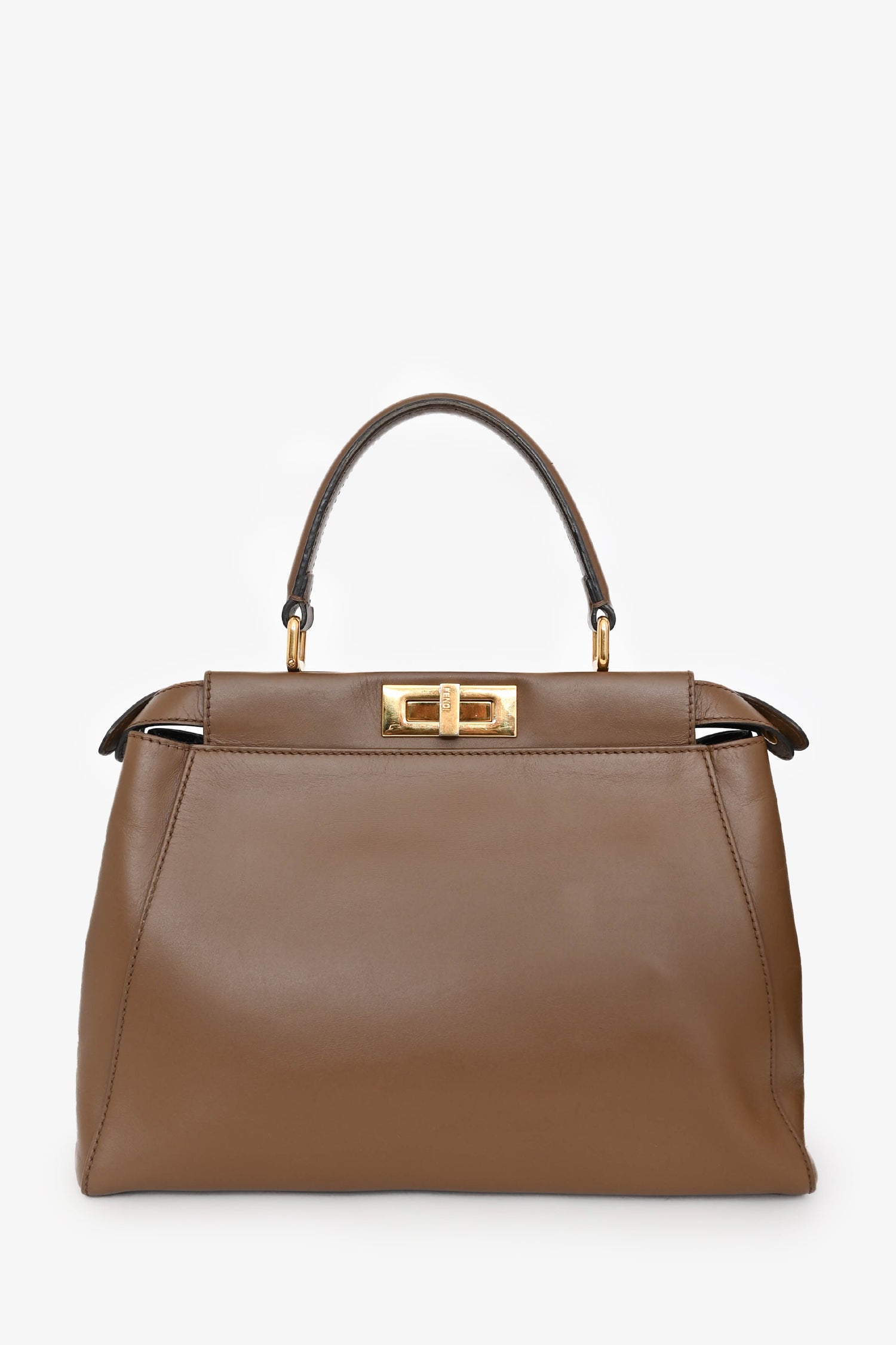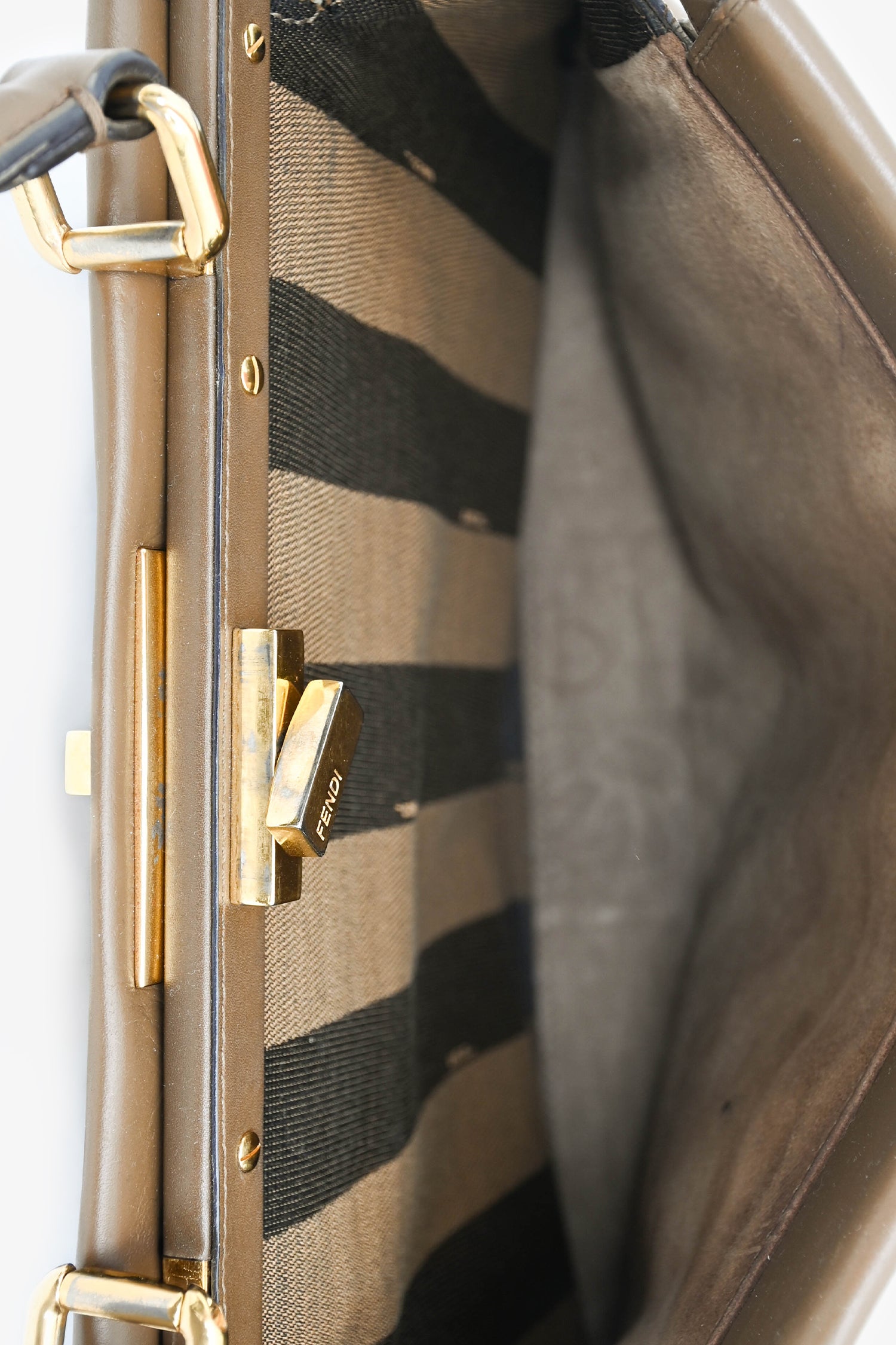 Refresh availabilityFendi 2013 Brown Calf Leather Medium Peekaboo. Double top turn lock closure. Two interior pockets, one with an attached pocket with a zipper closure. Suede interior with contrast stripe fabric. Five bottom studs. Adjustable shoulder strap. Gold-tone hardware. Tonal stitching.
