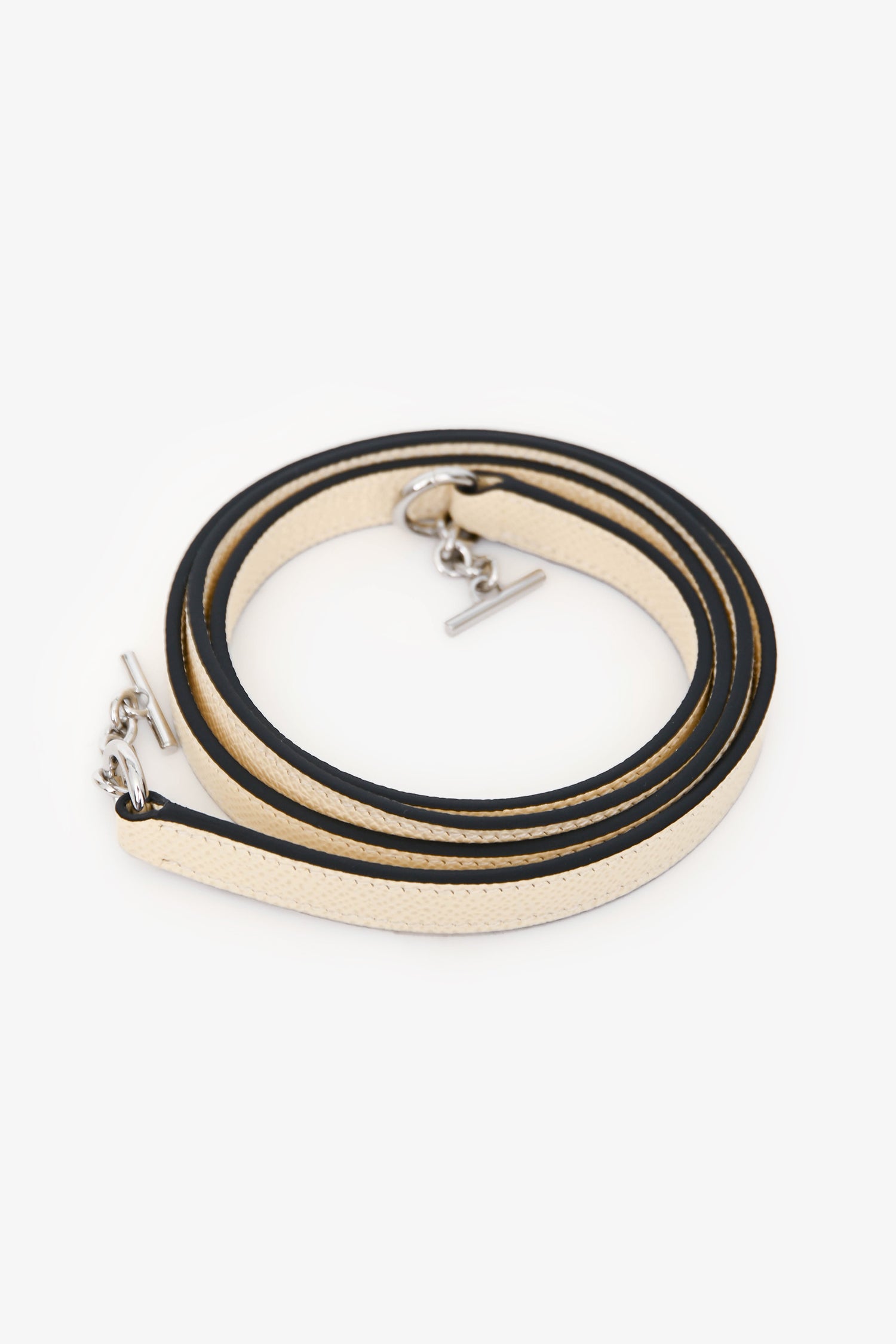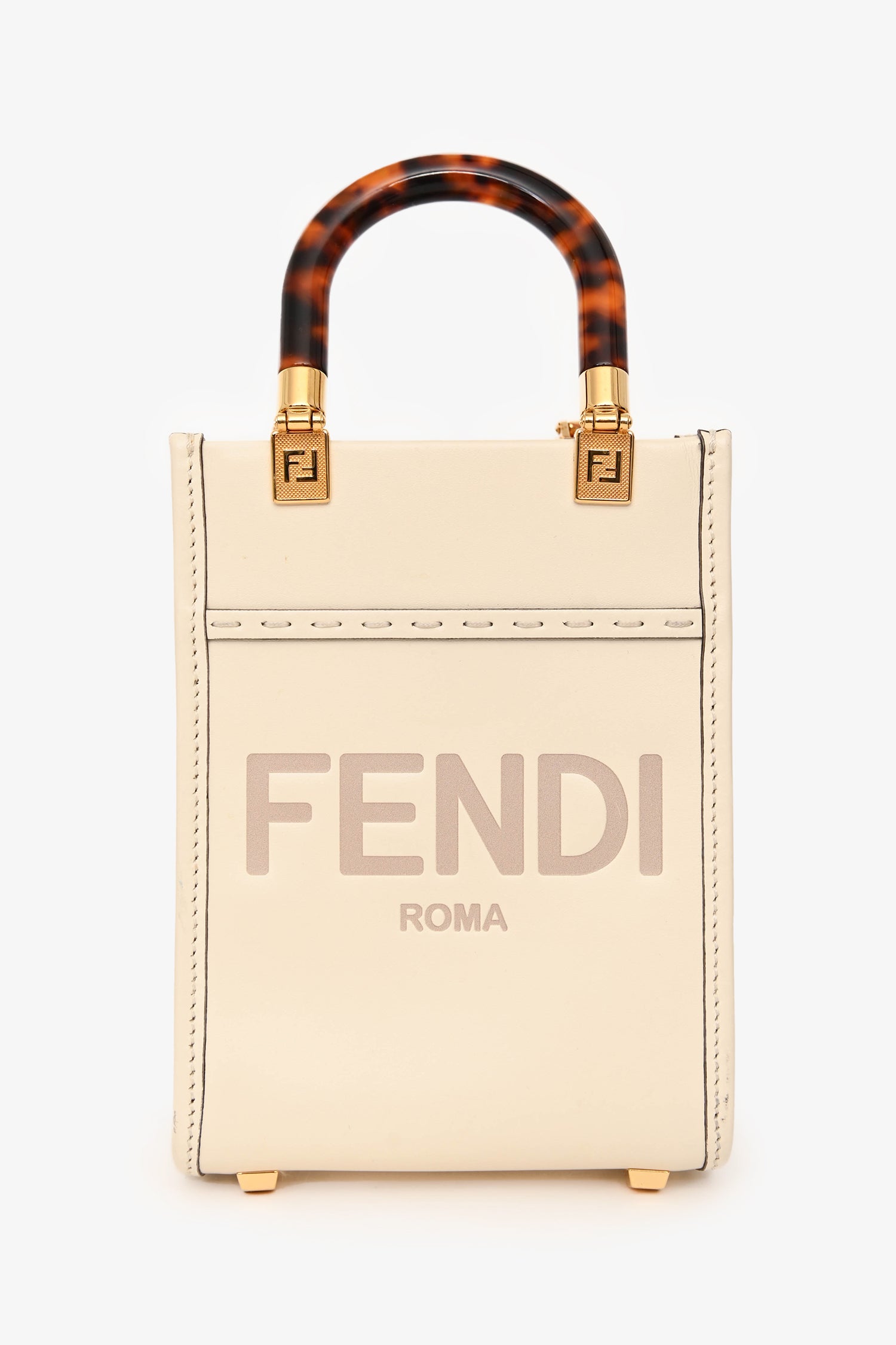Refresh availabilityFendi Cream Leather Mini Sunshine Crossbody Bag. Open top. 2 top handles with removable crossbody strap. 1 interior main compartment. 4 protective base studs. Silver and gold-tone hardware. Tonal stitching.