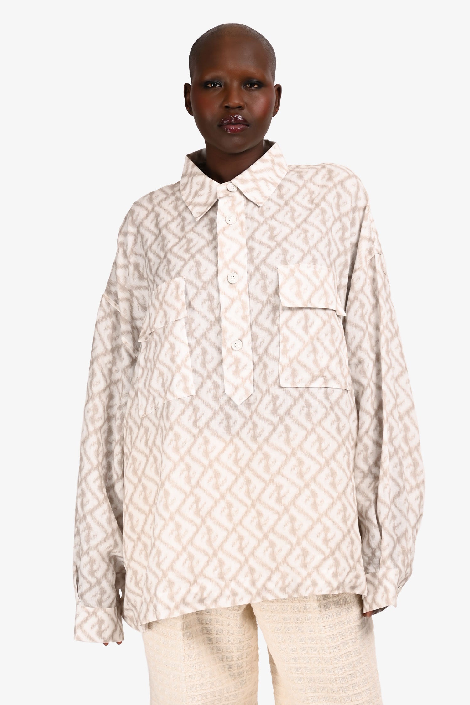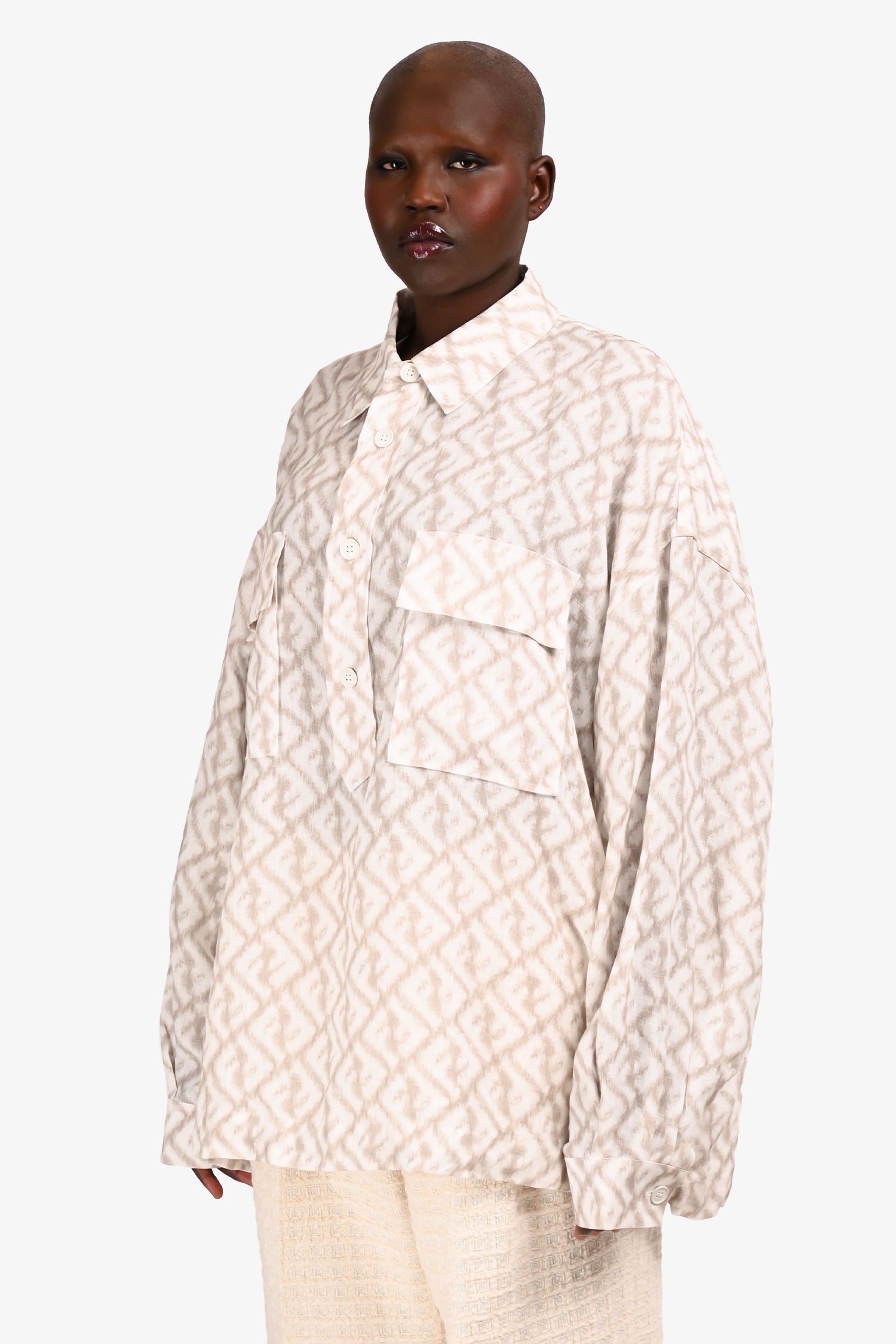 Refresh availabilityFendi 2022 White/Beige Graphic Linen V-Neck Pocket Blouse. Pull-on. Collared neckline. Front button-up closure. Front chest pockets. Tonal stitching.