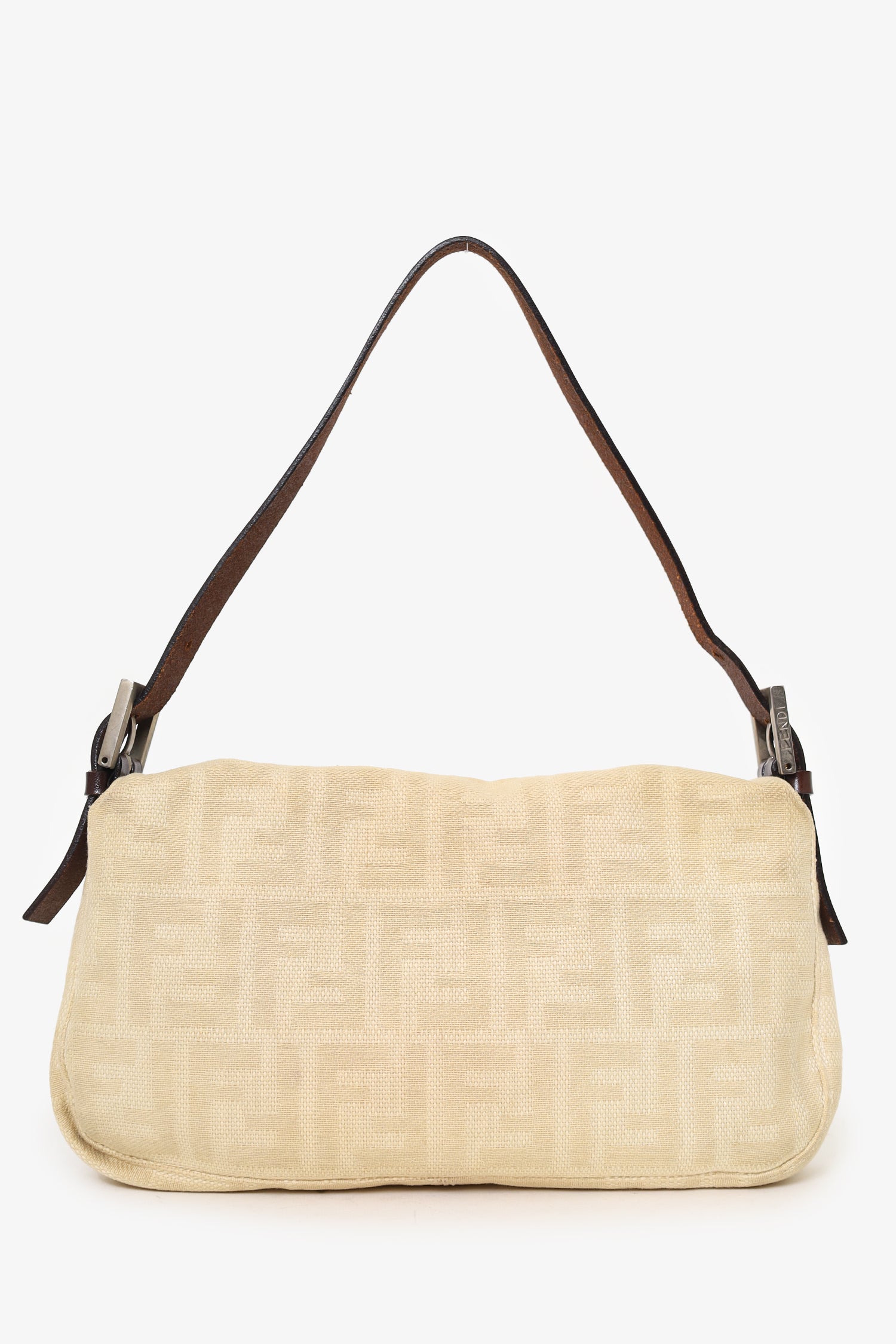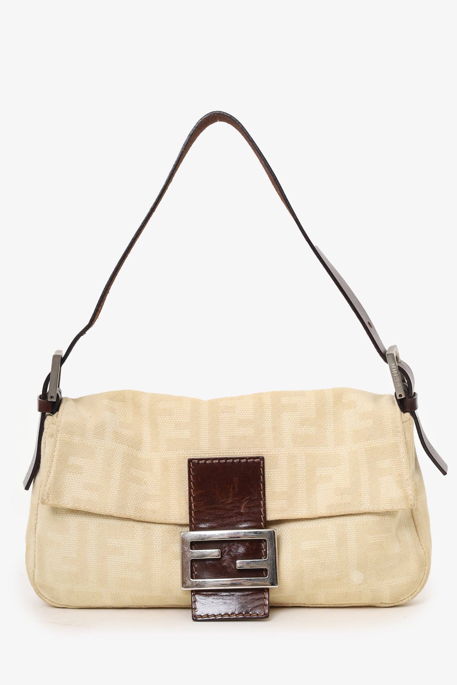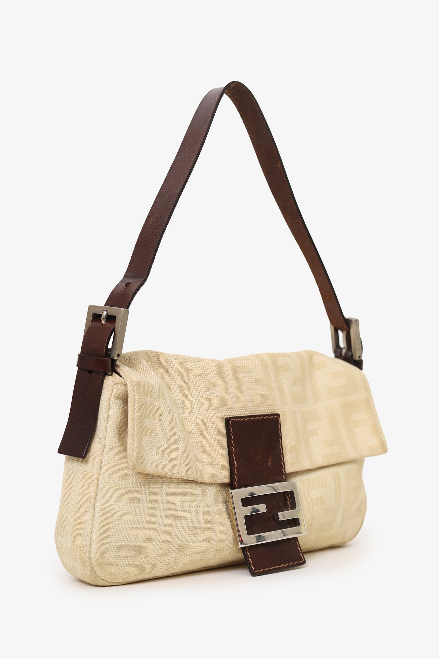 Refresh availabilityFendi Beige FF Zucca Canvas Baguette Shoulder Bag. Front fold-over flap with magnetic closure. Shoulder strap with adjustable buckle closure. Lined interior. Single interior zip pocket. Silver-tone hardware. Tonal stitching.