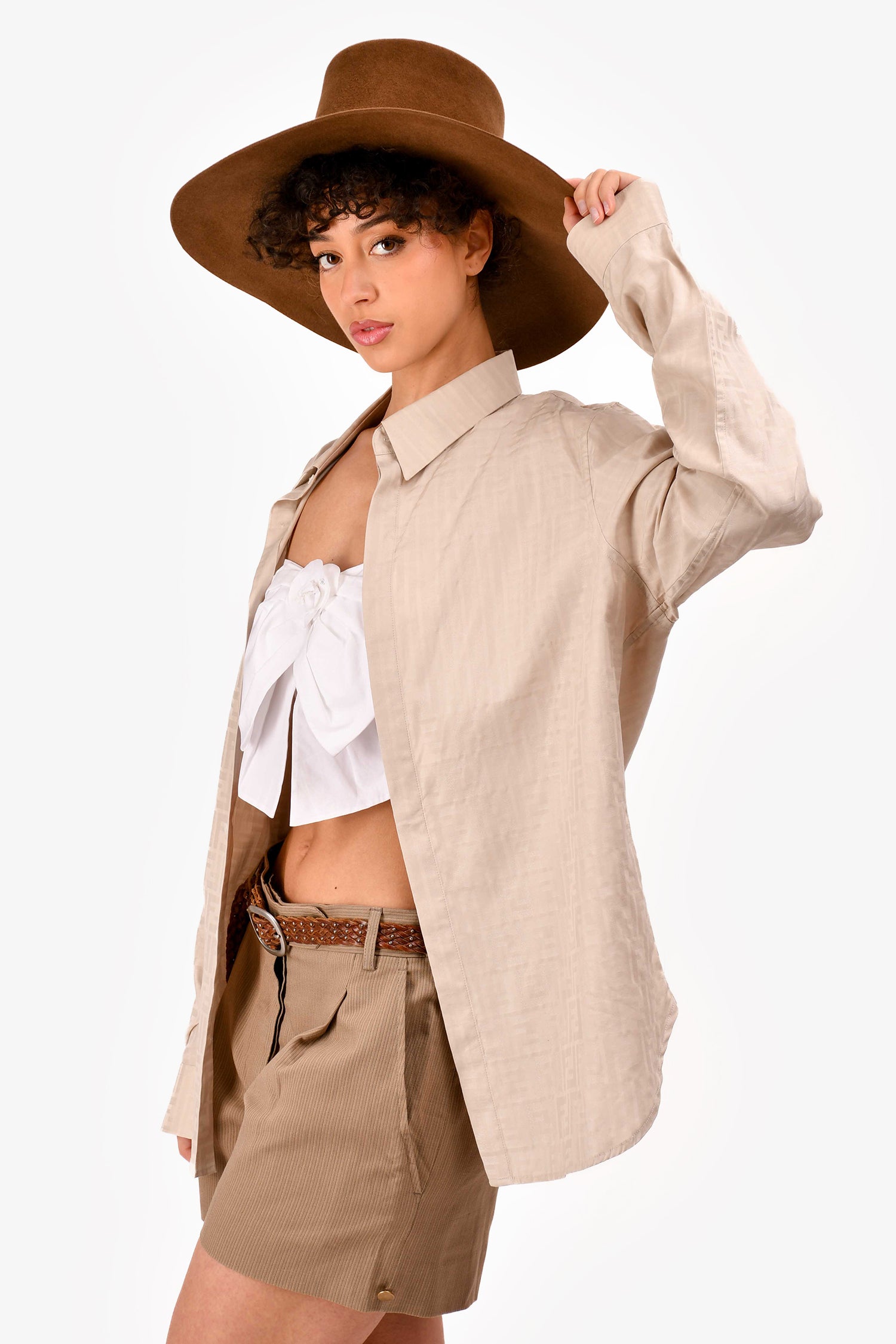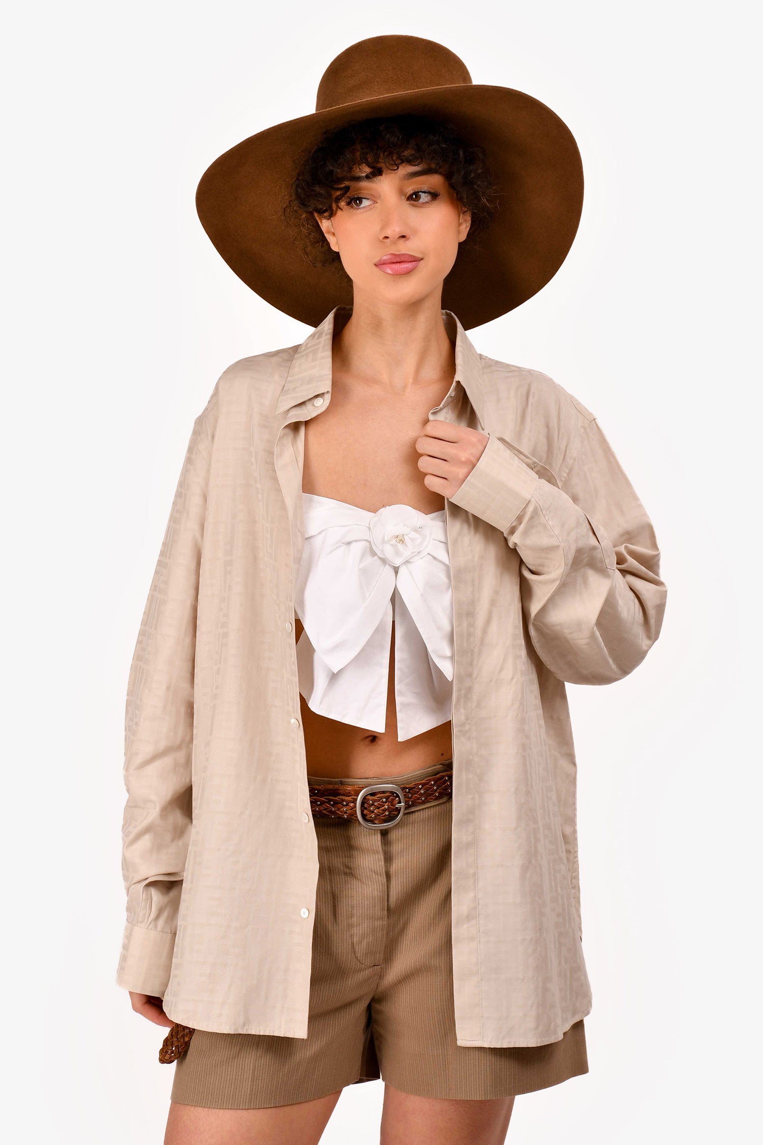 Refresh availabilityFendi Beige Monogram Cotton Button-Down Shirt. Front button-down closure. Button closure at cuffs. Tonal Zucca print throughout. Tonal stitching.