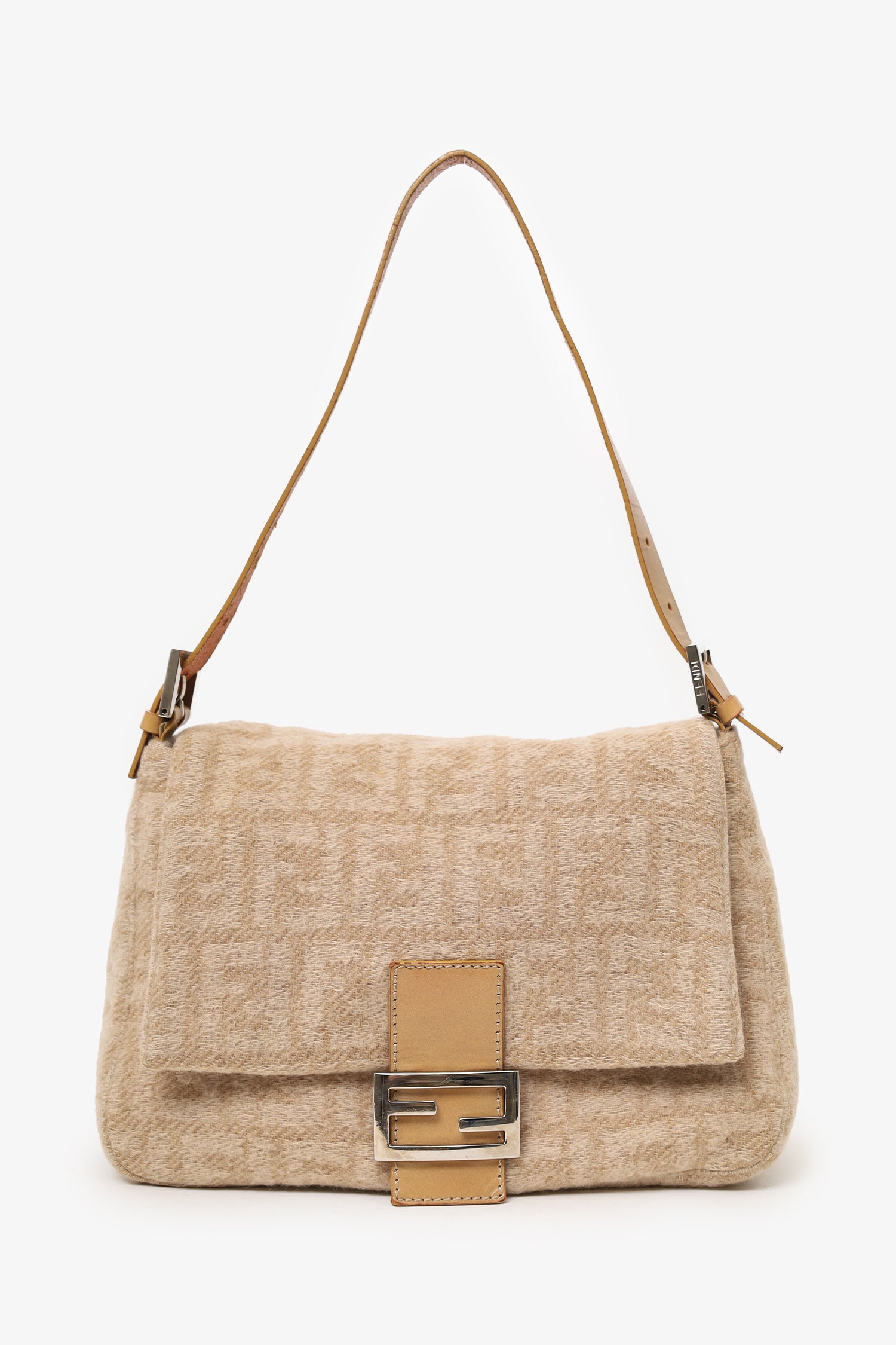 Refresh availabilityFendi Beige Zucca Wool Mamma Forever Shoulder Bag. Front fold-over flap with magnetic snap-button closure. Adjustable shoulder strap with buckle closure. Lined interior. Single interior zip pocket. Silver-tone hardware. Tonal stitching.