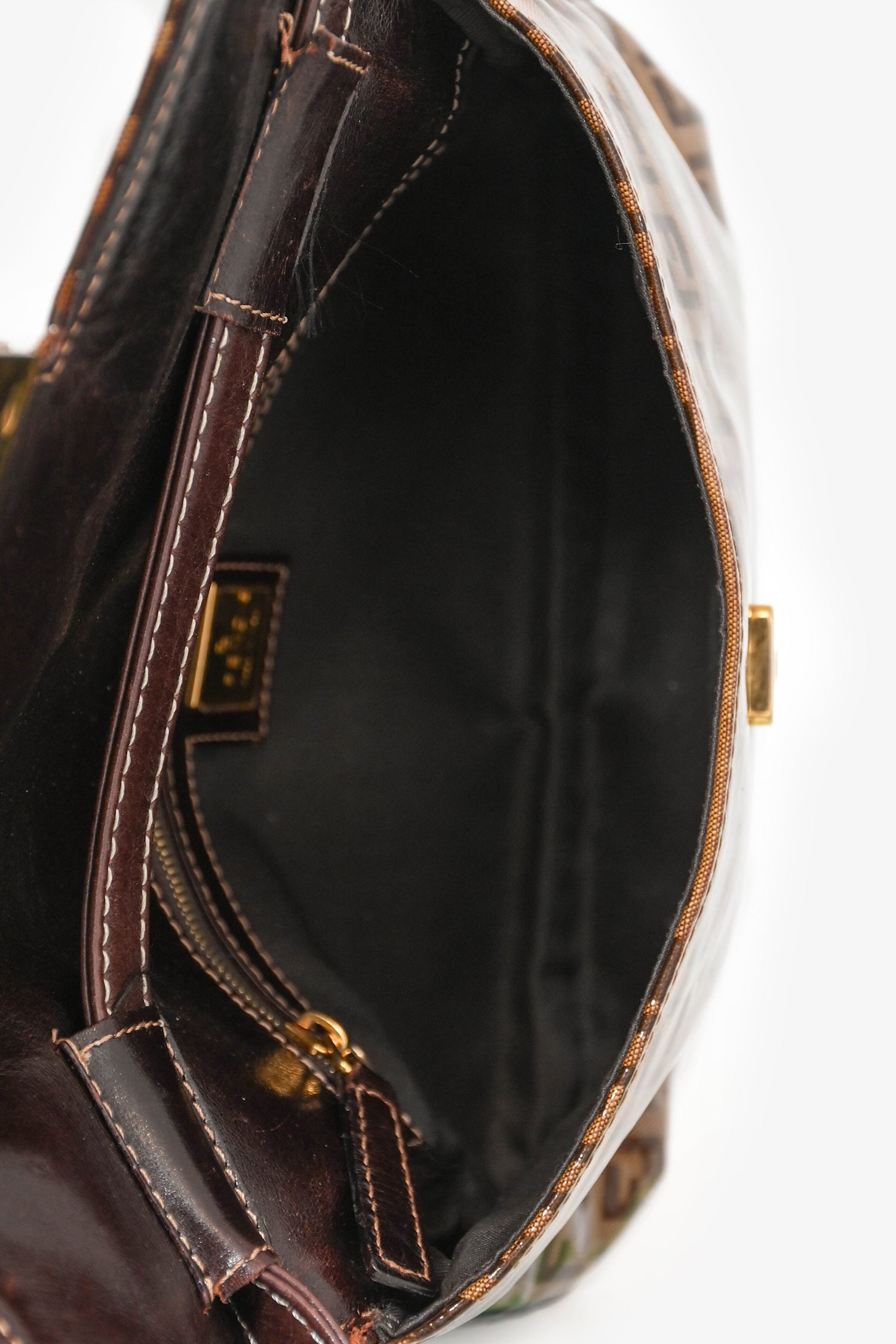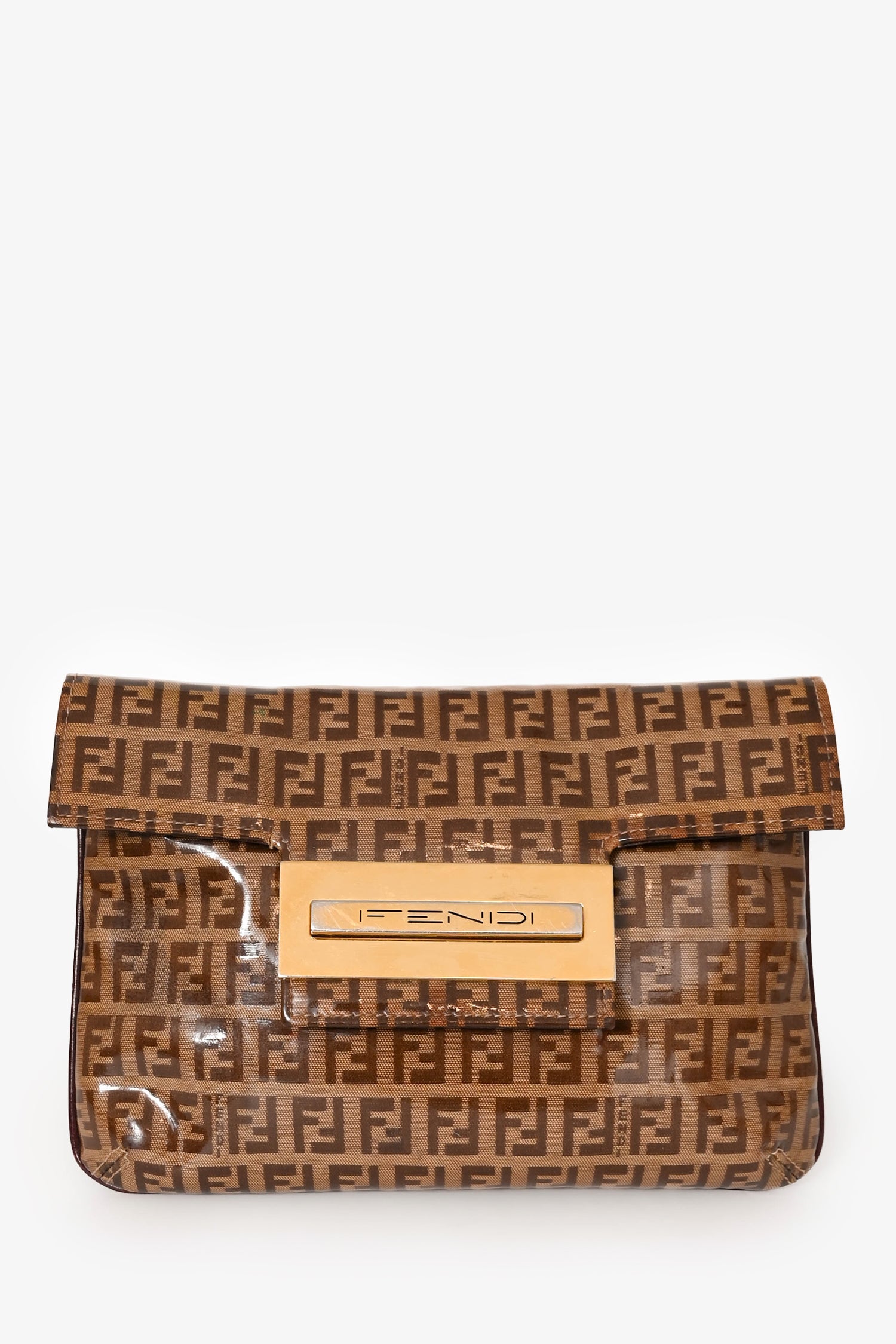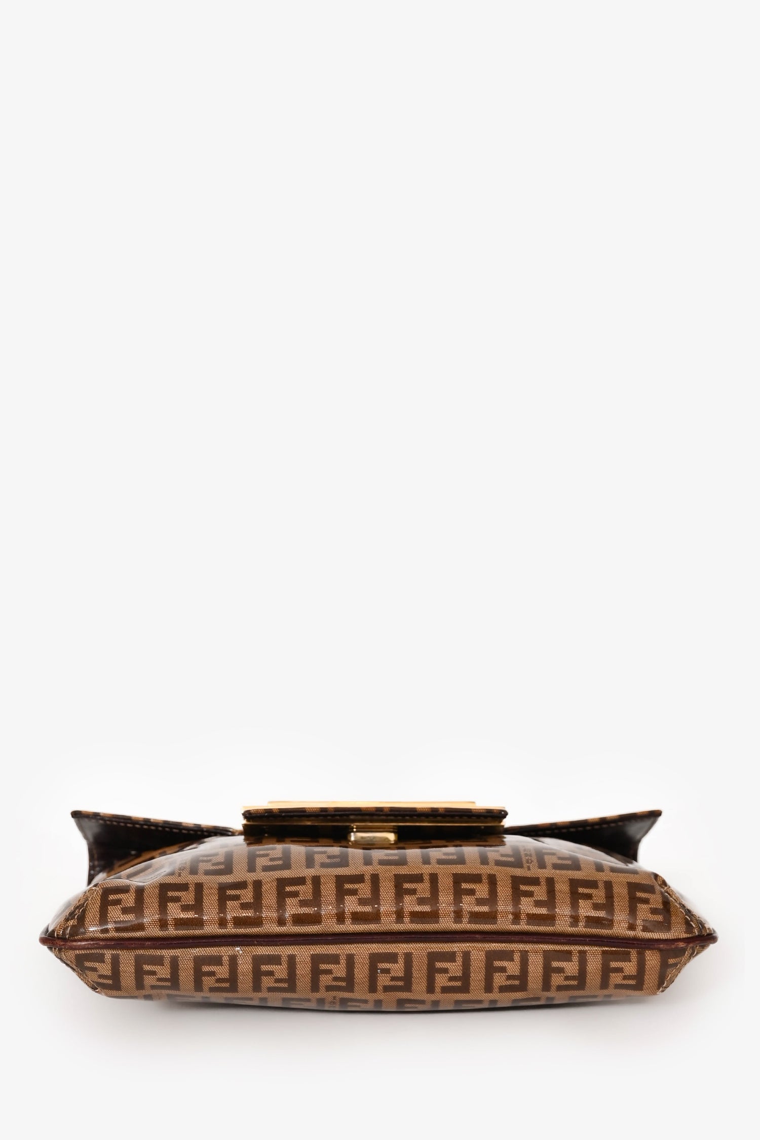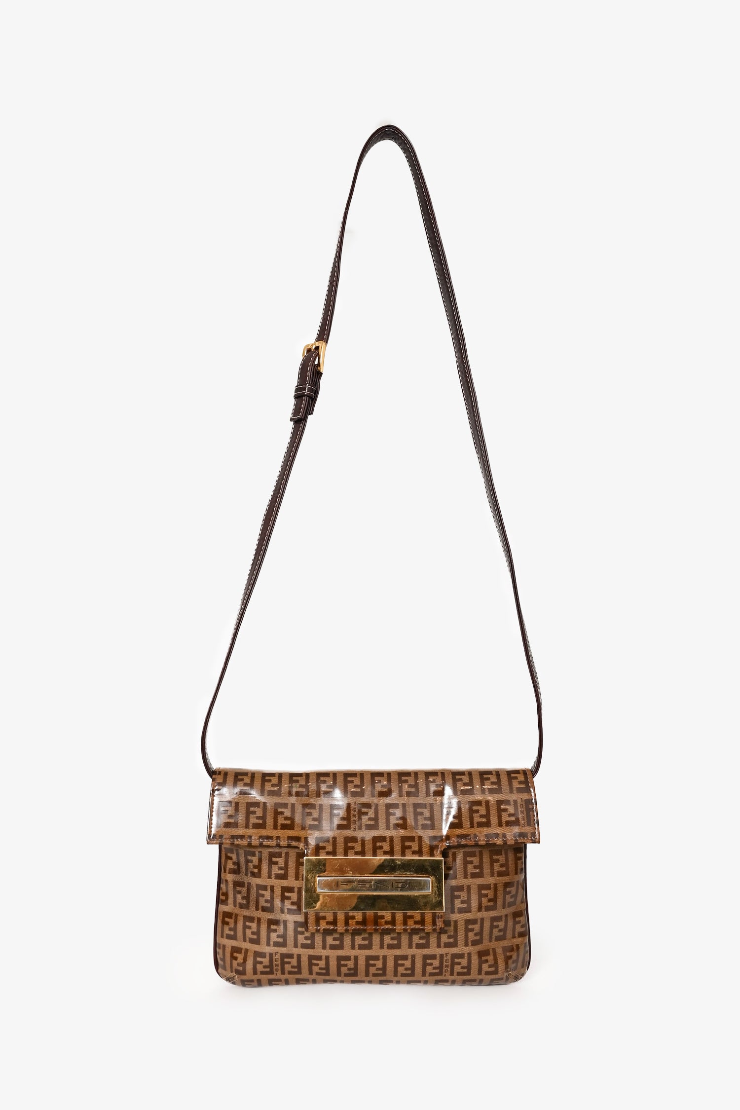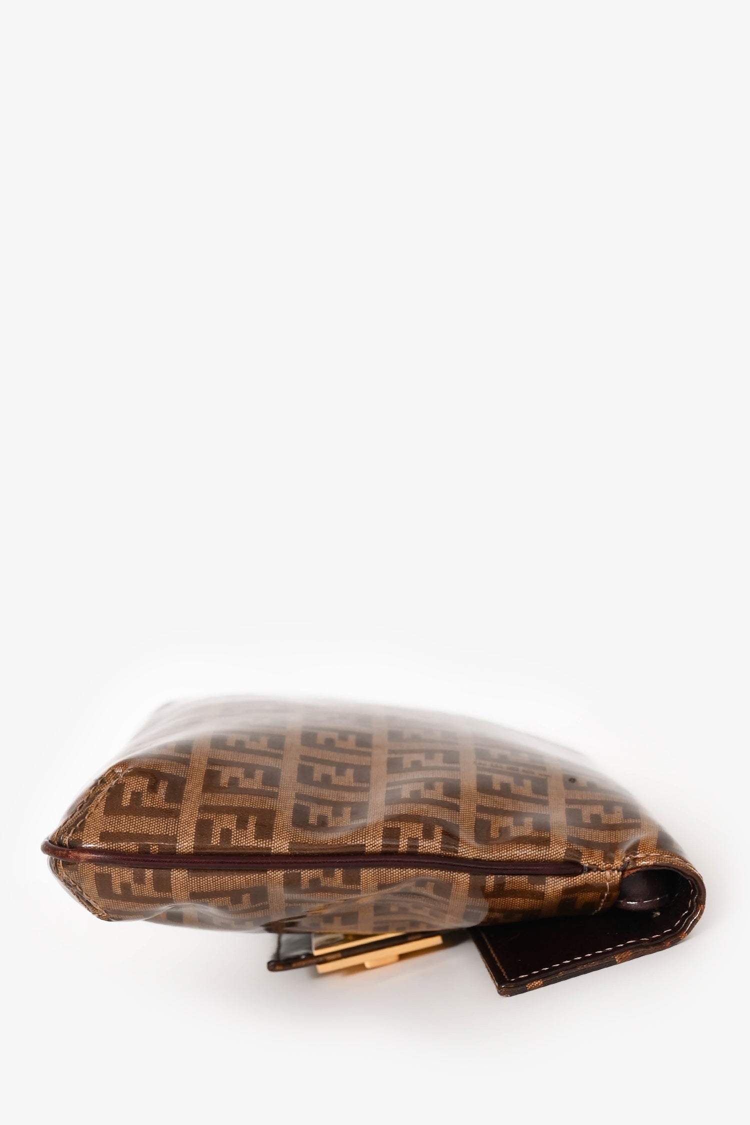 Refresh availabilityFendi Beige Zucchino Vinyl Shoulder Bag. Front fold-over flap with magnetic button closure. Dark brown textile interior lining. Single interior wall zip pocket. Adjustable strap. Glossy finish. Gold-tone hardware.