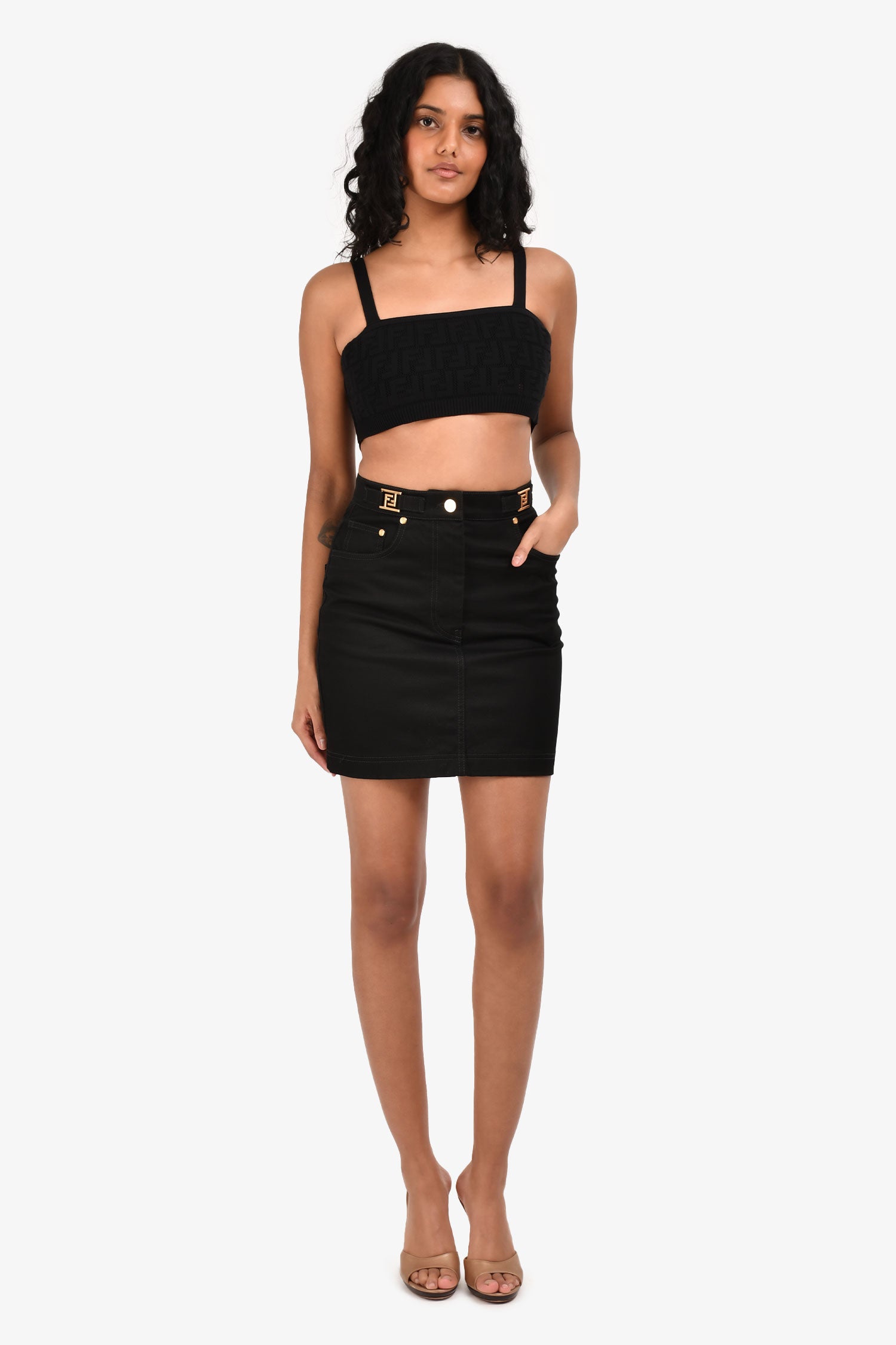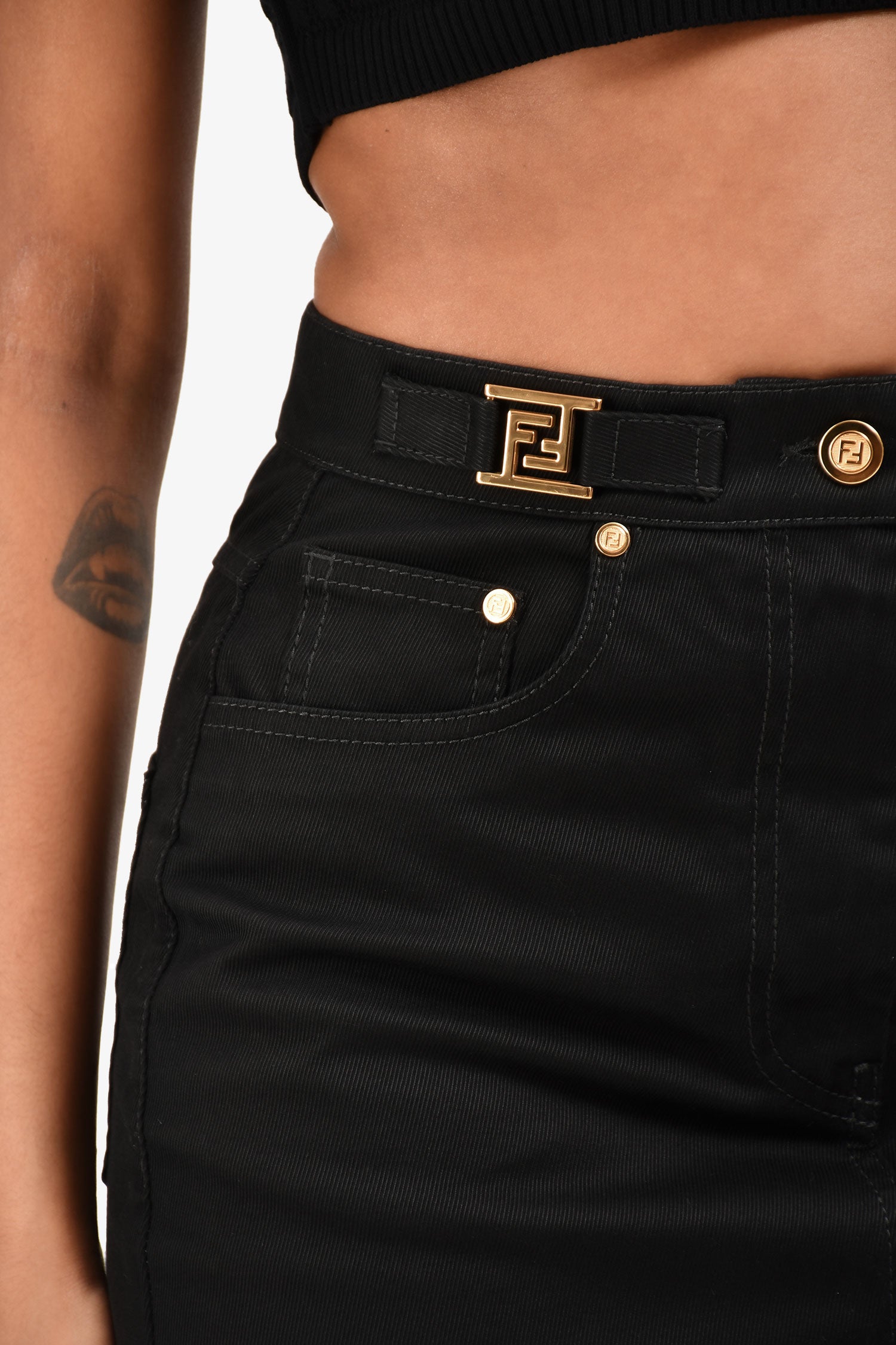 Refresh availabilityFendi Black Denim Mini Skirt with Gold FF Detail. Classic five-pocket style. Gold-tone hardware. Unlined. Tonal stitching.