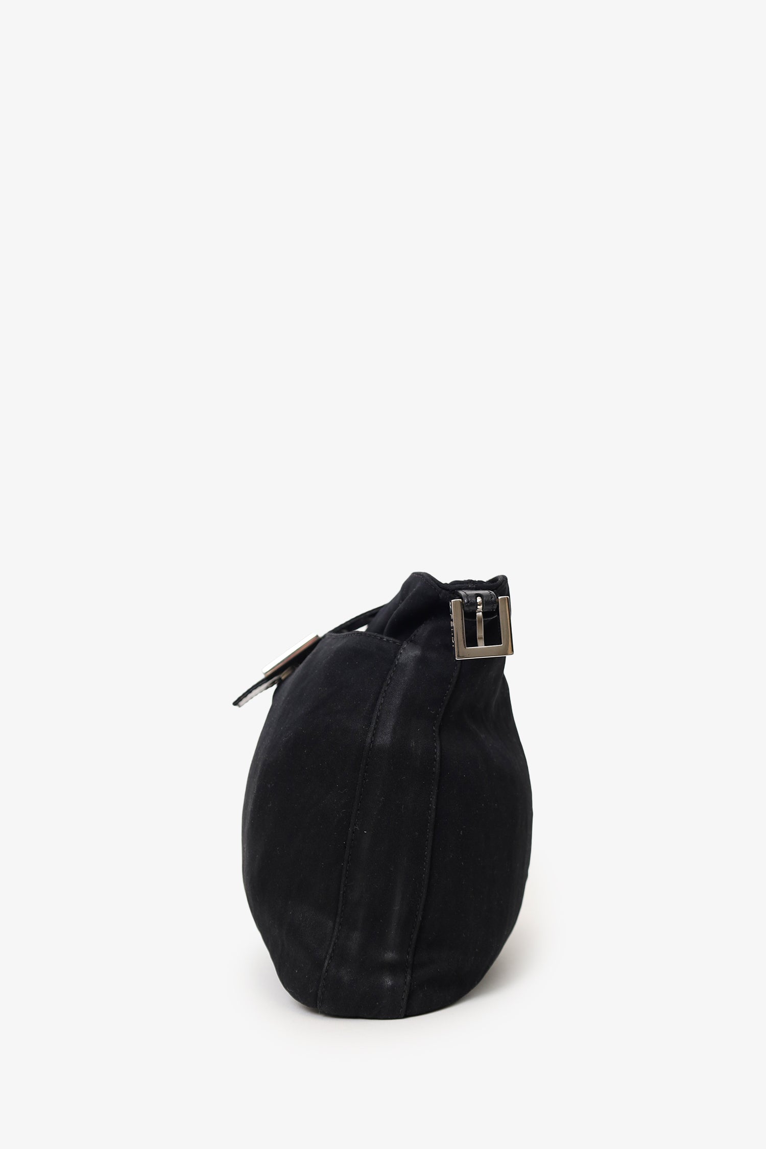 Refresh availabilityFendi Black Fabric Forever Baguette Shoulder Bag. Front-fold-over-strap with snap-button-up closure. Shoulder strap with adjustable pull-through buckle closure. Single exterior front slip pocket. Unlined-interior with single rear zip-up pocket. Silver-tone hardware. Tonal stitching.
