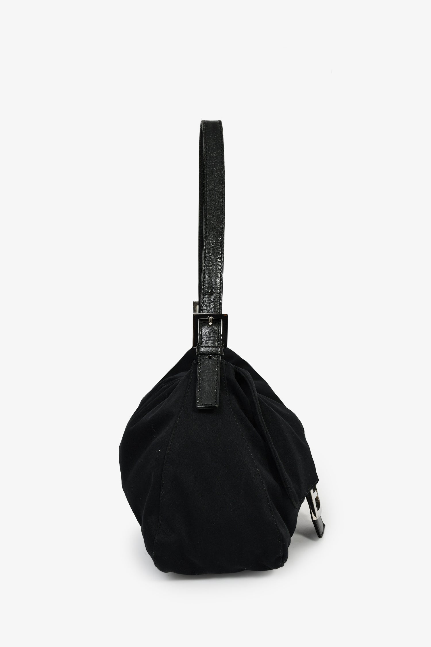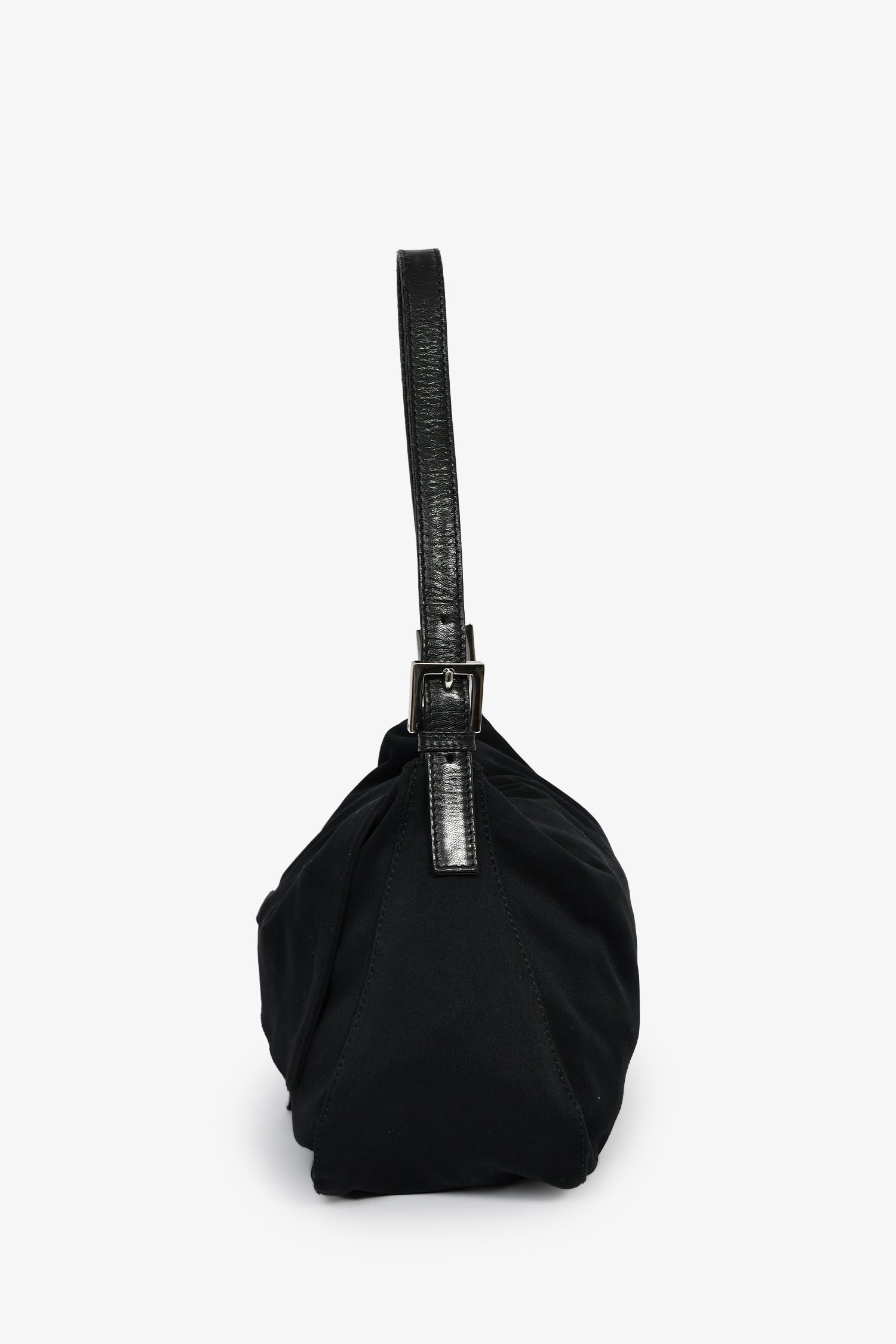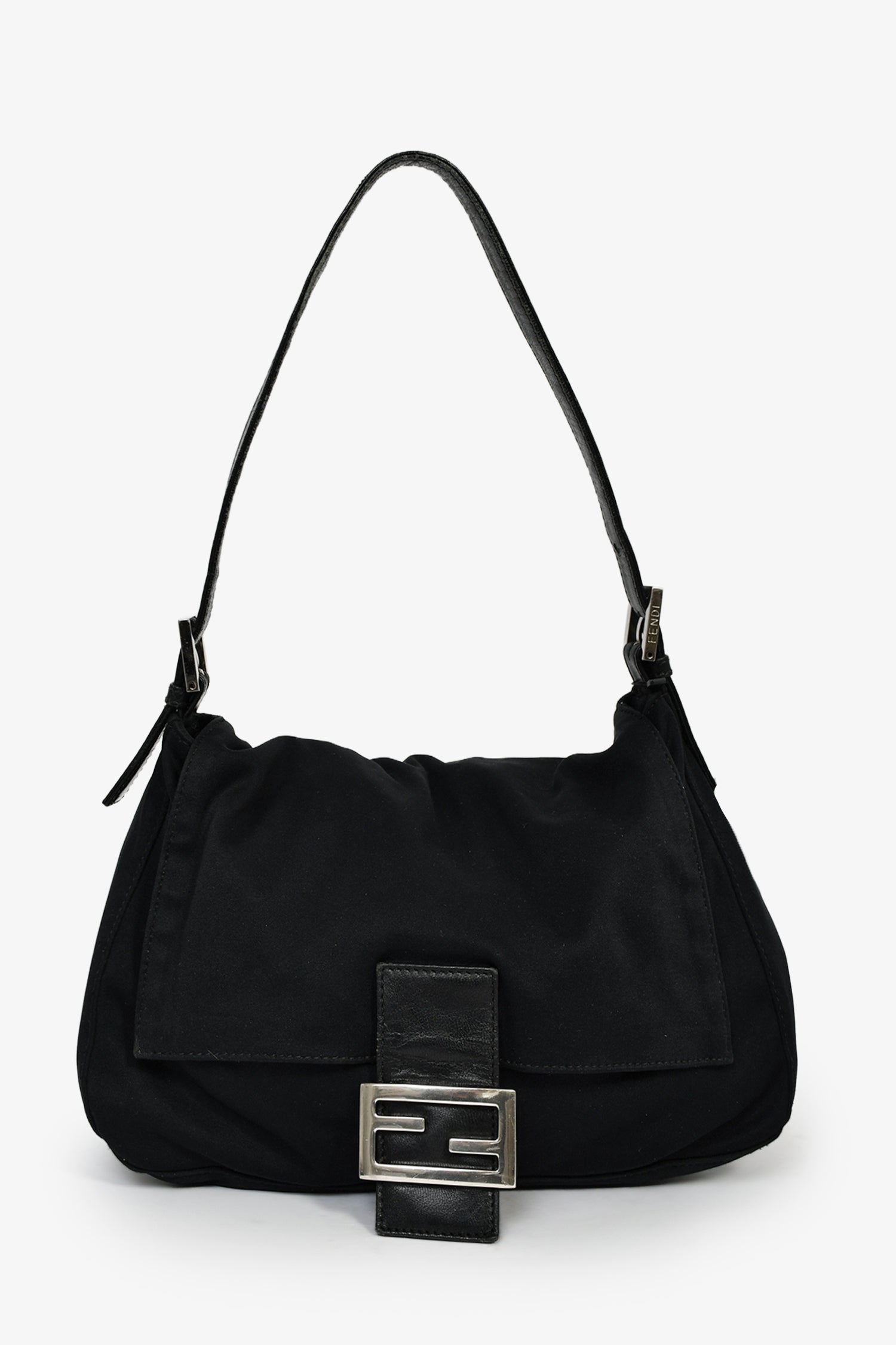 Fendi Black Fabric Mama Baguette Shoulder Bag.  Front-fold-over-flap with snap-button-up closure. Adjustable shoulder strap with pull-through buckle closure. Lined-interior with single rear zip-up pocket. Silver-tone hardware. Tonal stitching.