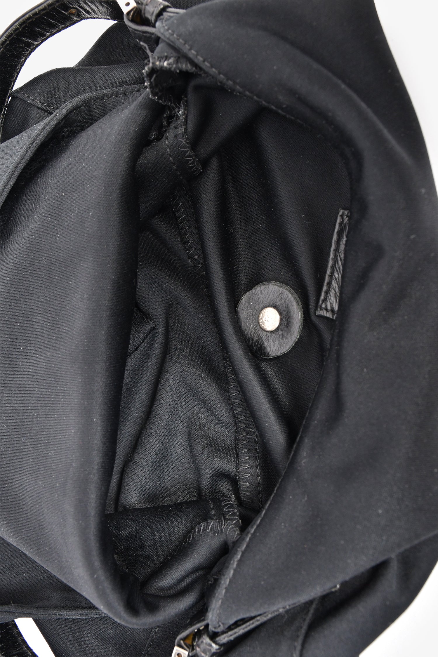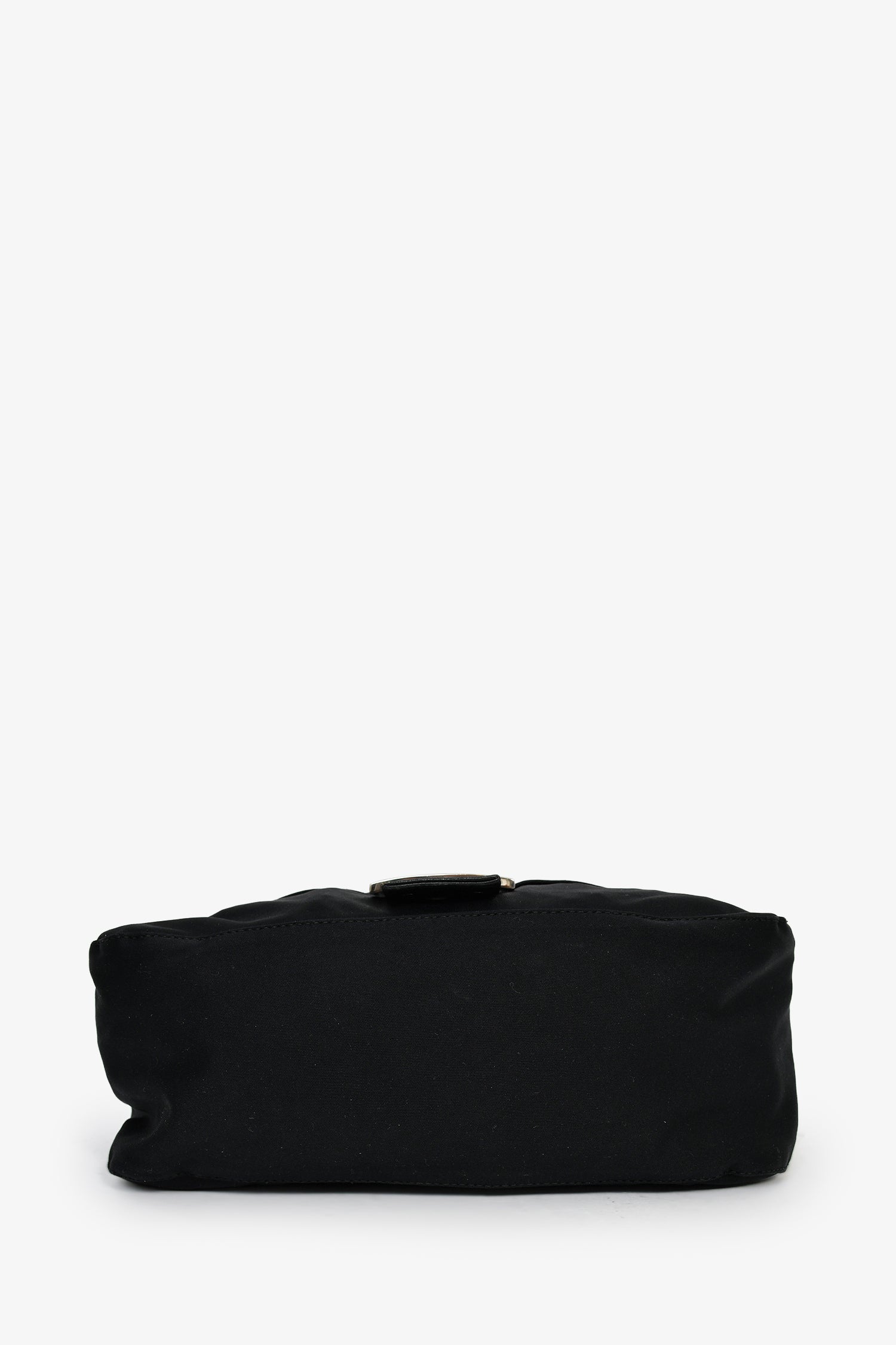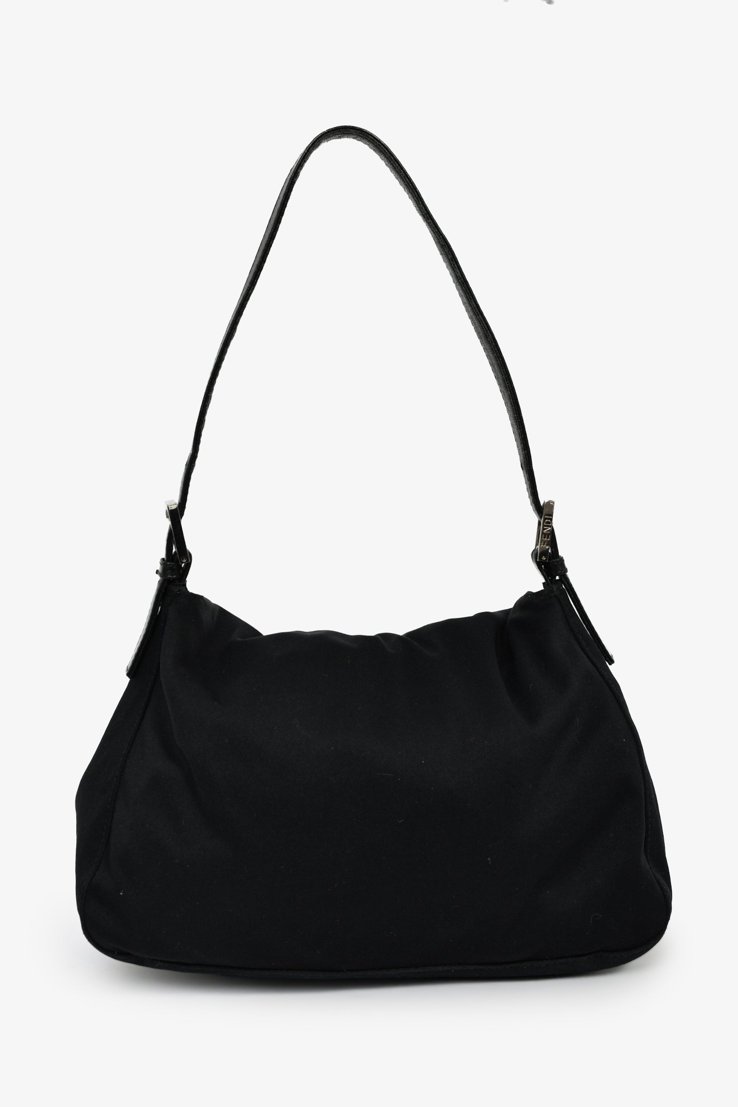 Fendi Black Fabric Mama Baguette Shoulder Bag.  Front-fold-over-flap with snap-button-up closure. Adjustable shoulder strap with pull-through buckle closure. Lined-interior with single rear zip-up pocket. Silver-tone hardware. Tonal stitching.