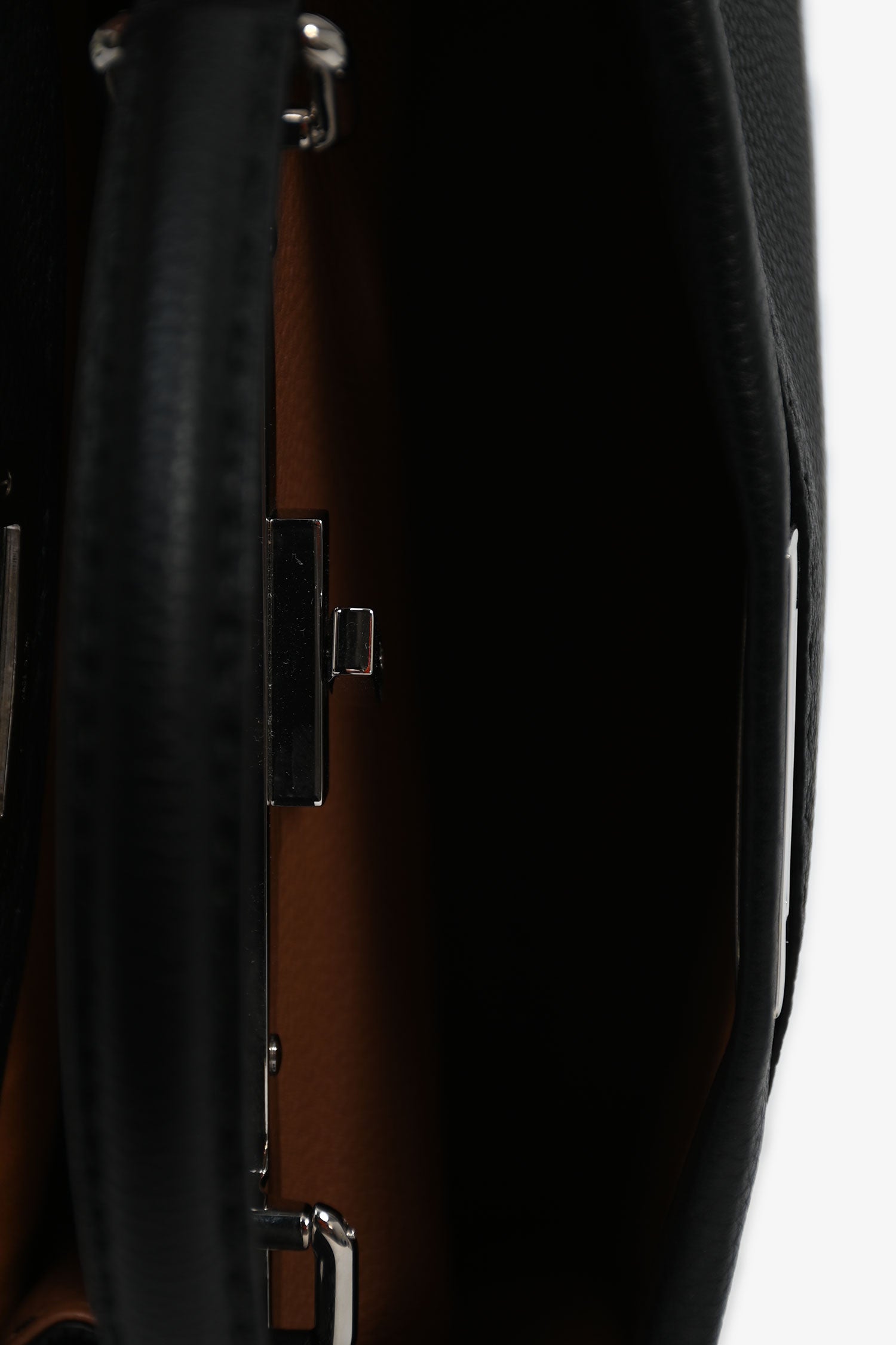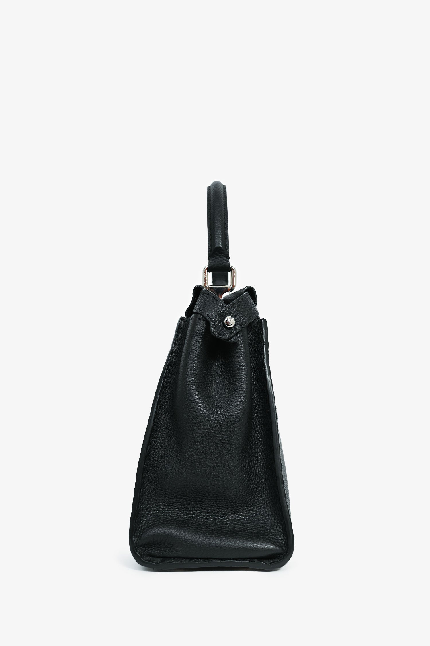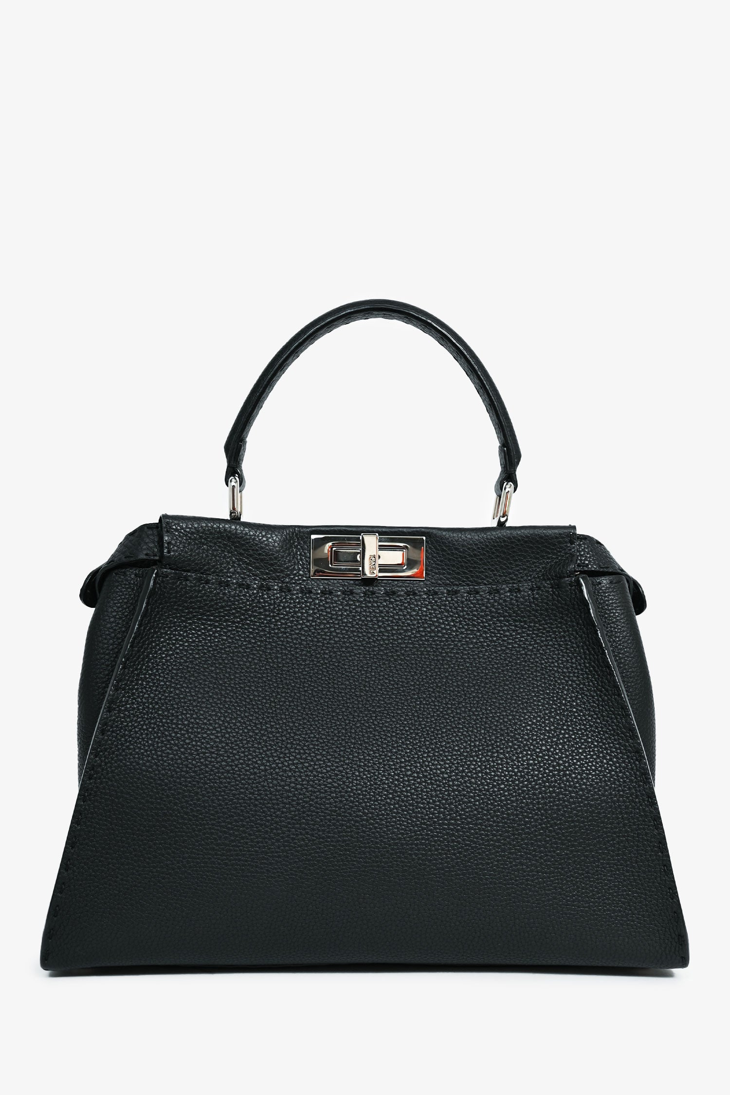 Refresh availabilityFendi Black Grained Leather Medium Peekaboo Top Handle. Single top handle. Silver-tone hardware. Double turn-lock closure. Double compartments. Zipped interior compartment. Comes with an attachable strap. Tonal stitching.