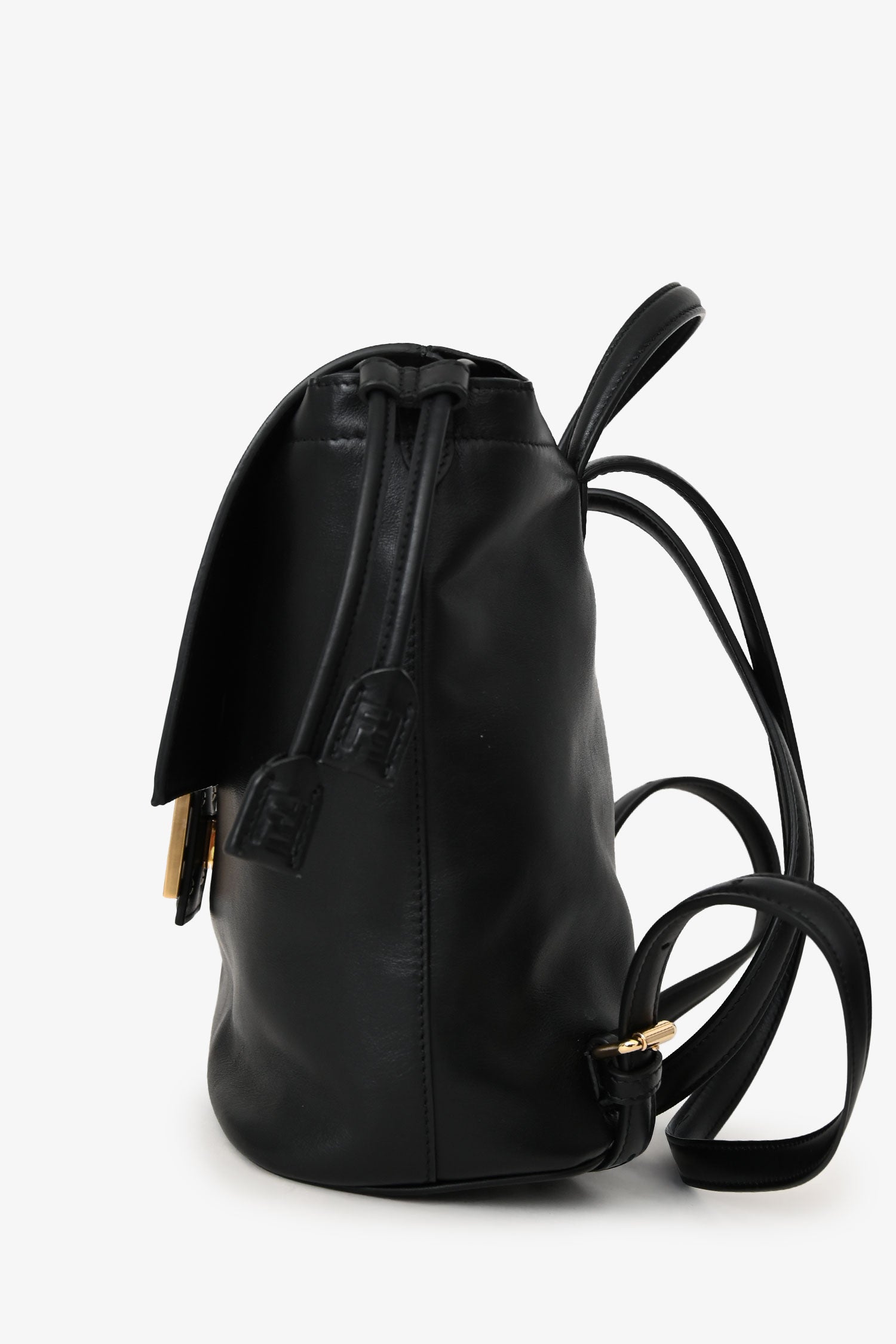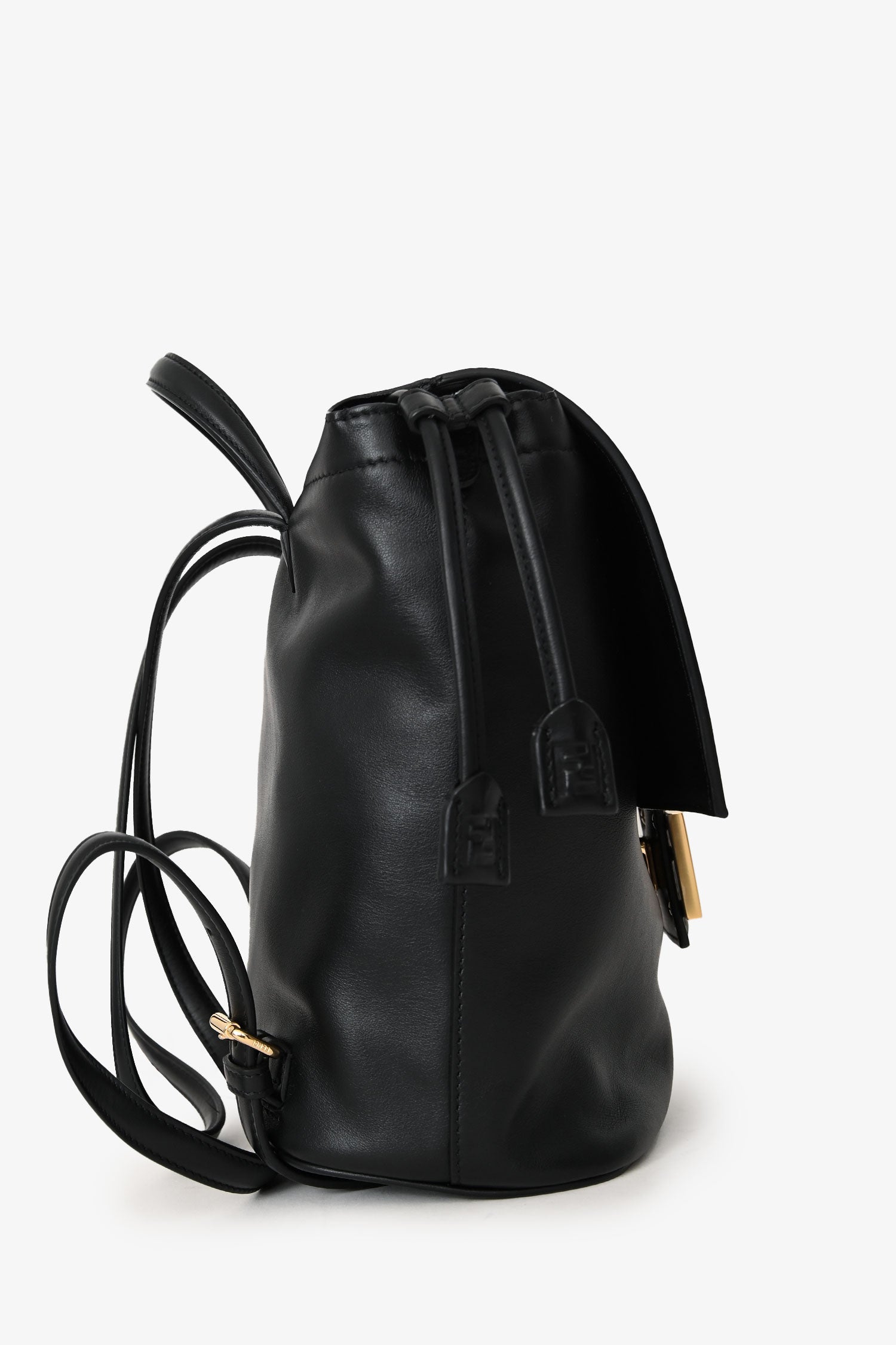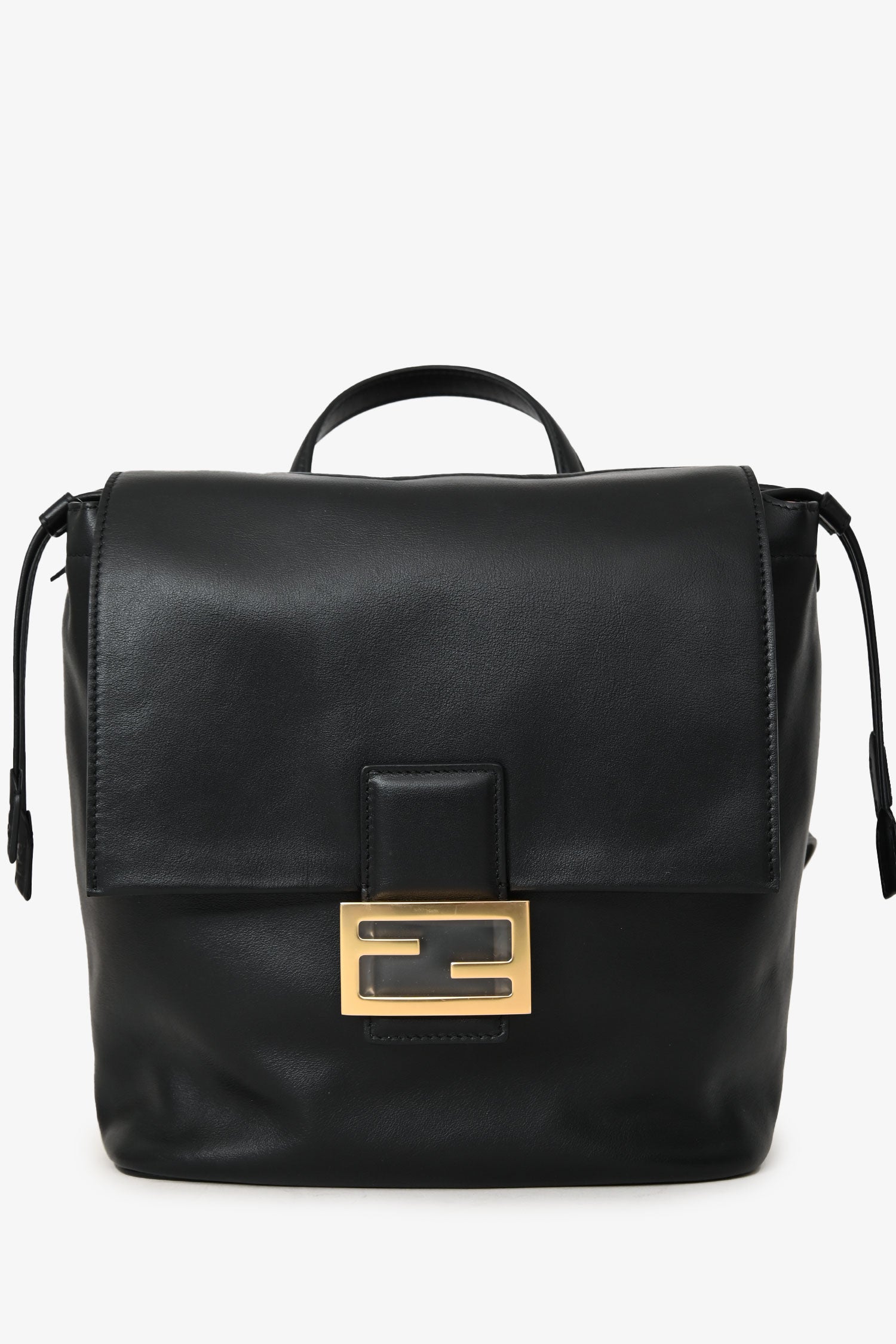 Refresh availabilityFendi Black Leather FF Clasp Backpack. Flap closure with FF clasp and drawstring fastening. Adjustable shoulder straps; top handle. Single main compartment. Fabric-lined interior. Gold-tone hardware. Tonal stitching.