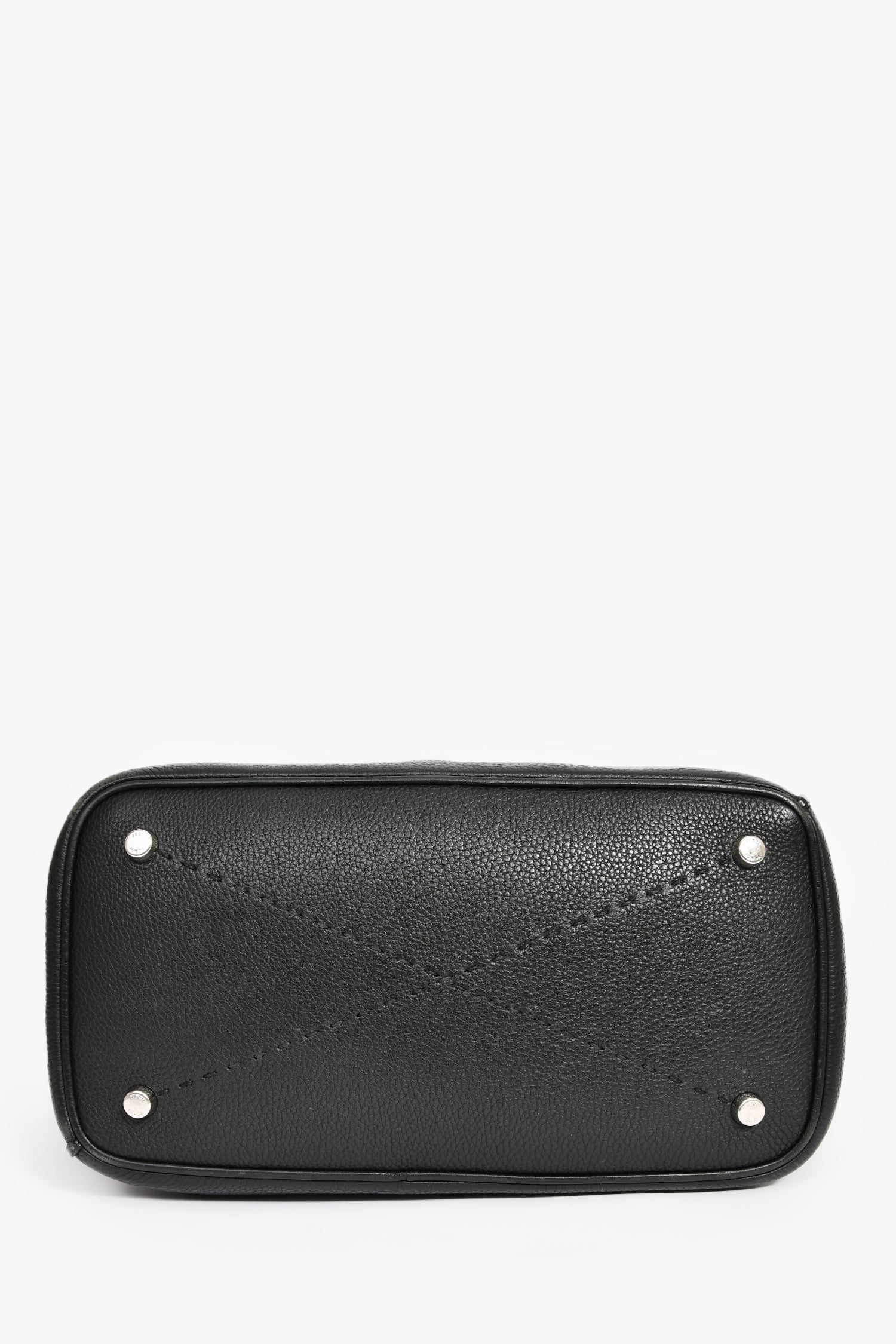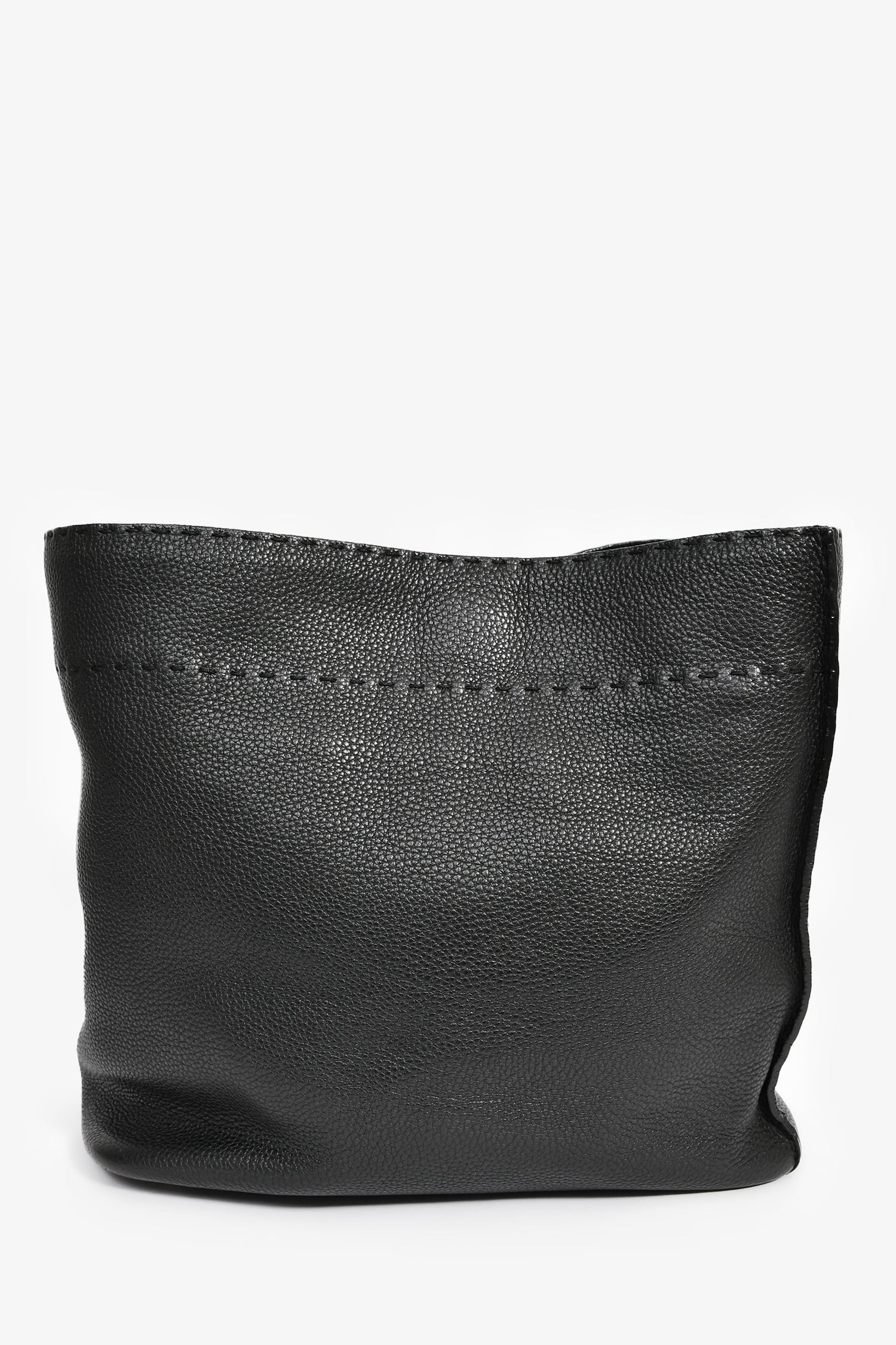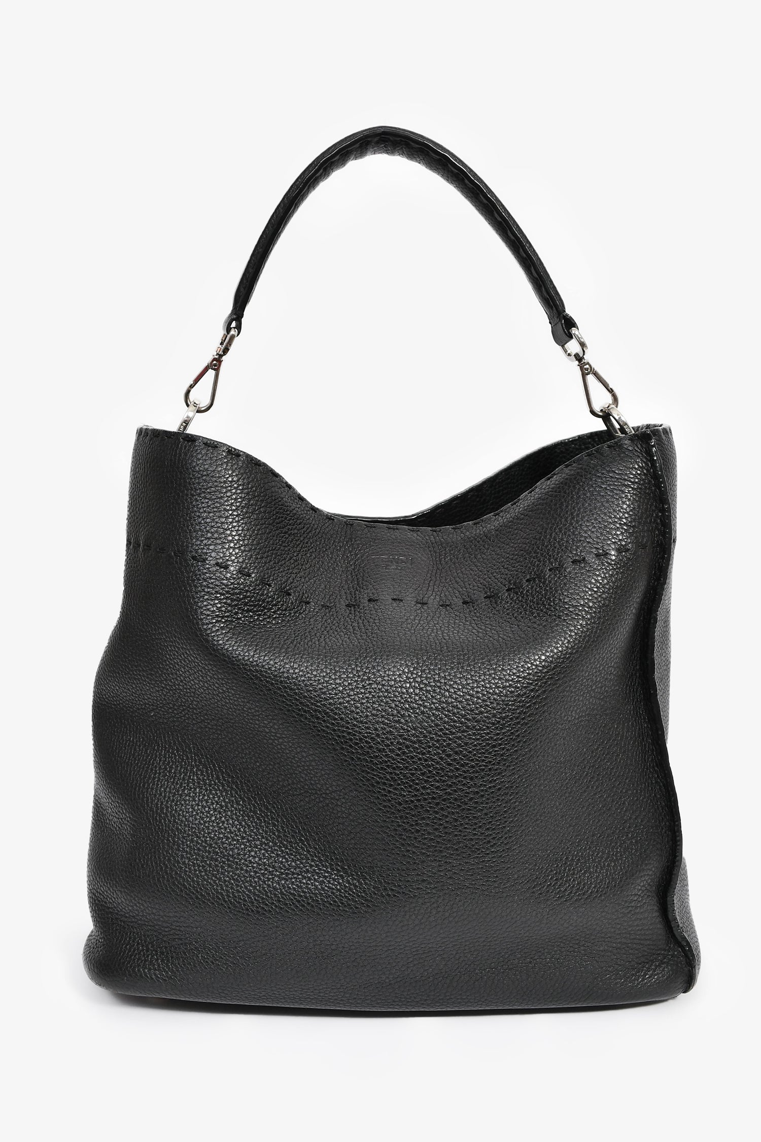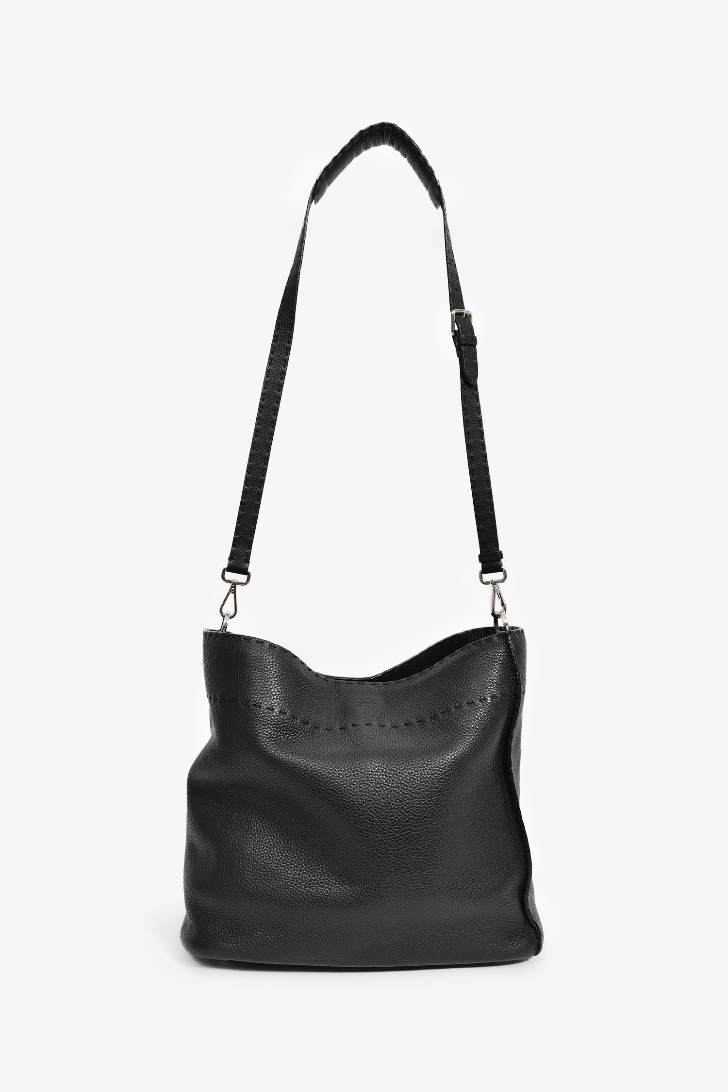 Fendi Black Leather Selleria Anna Bucket Bag with Strap. Top interior latch closure. Protective base studs. Interchangeable and detachable top handle and strap (adjustable). Lined interior. 3 interior wall pockets; 2 open, 1 with zip closure. Silver-tone hardware. Tonal stitching.
