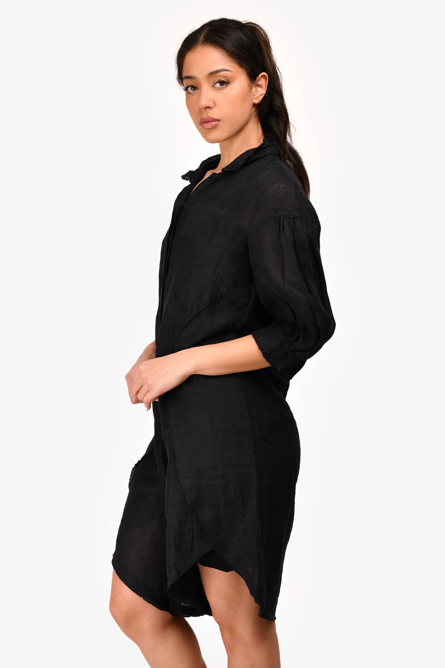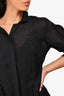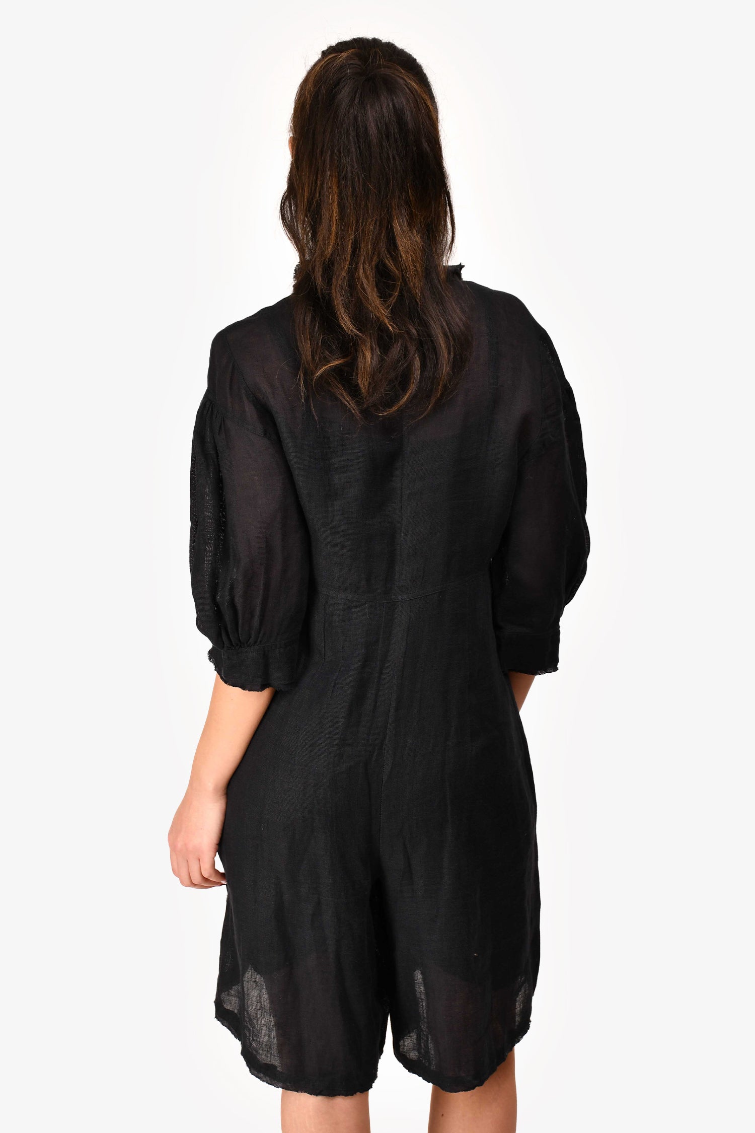 Refresh availabilityFendi Black Linen 3/4 Sleeve Mid Length Romper. Sheer. Front button closures. Rouched sleeves. Raw seamline detailing throughout neckline and bodice. Tonal stitching.