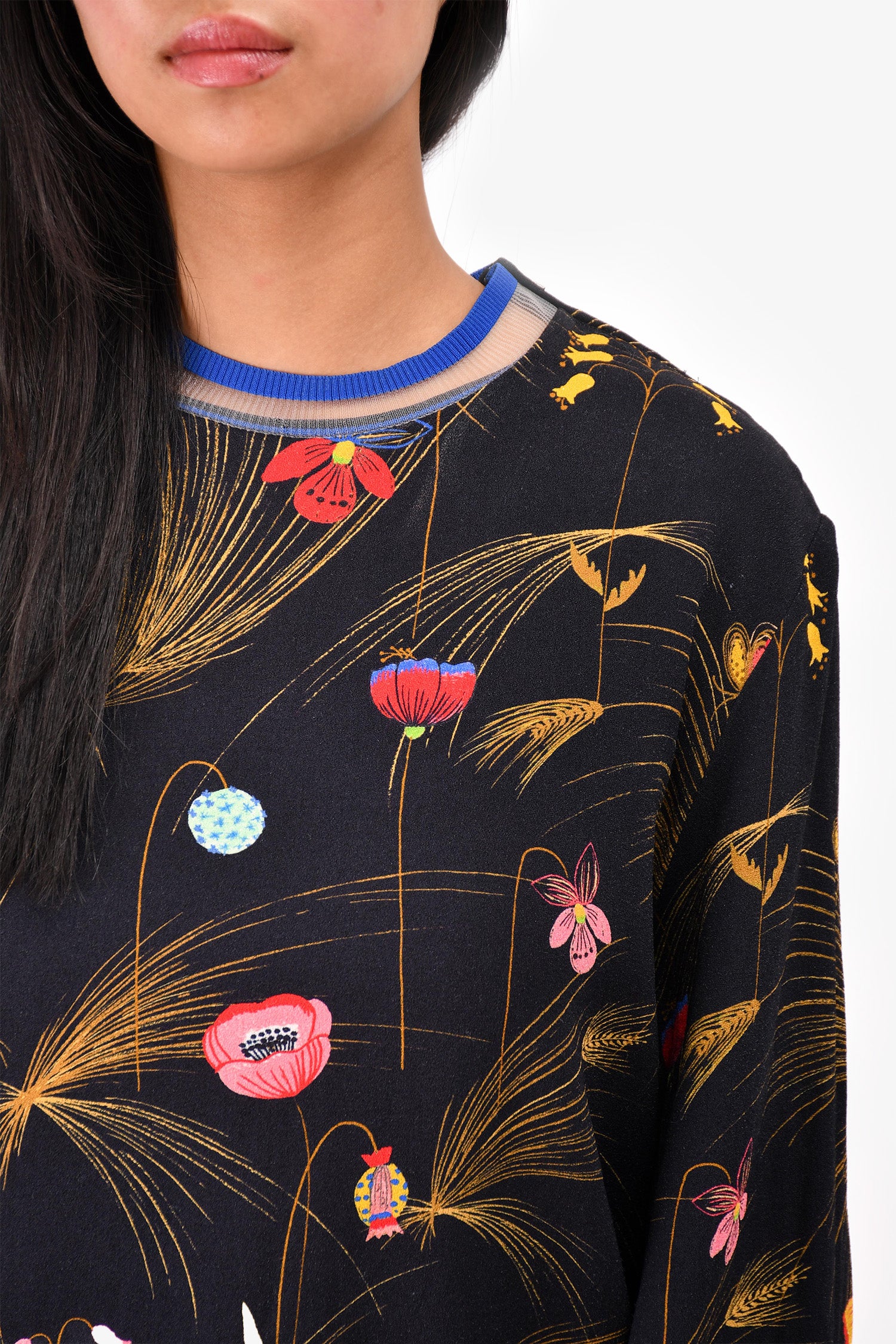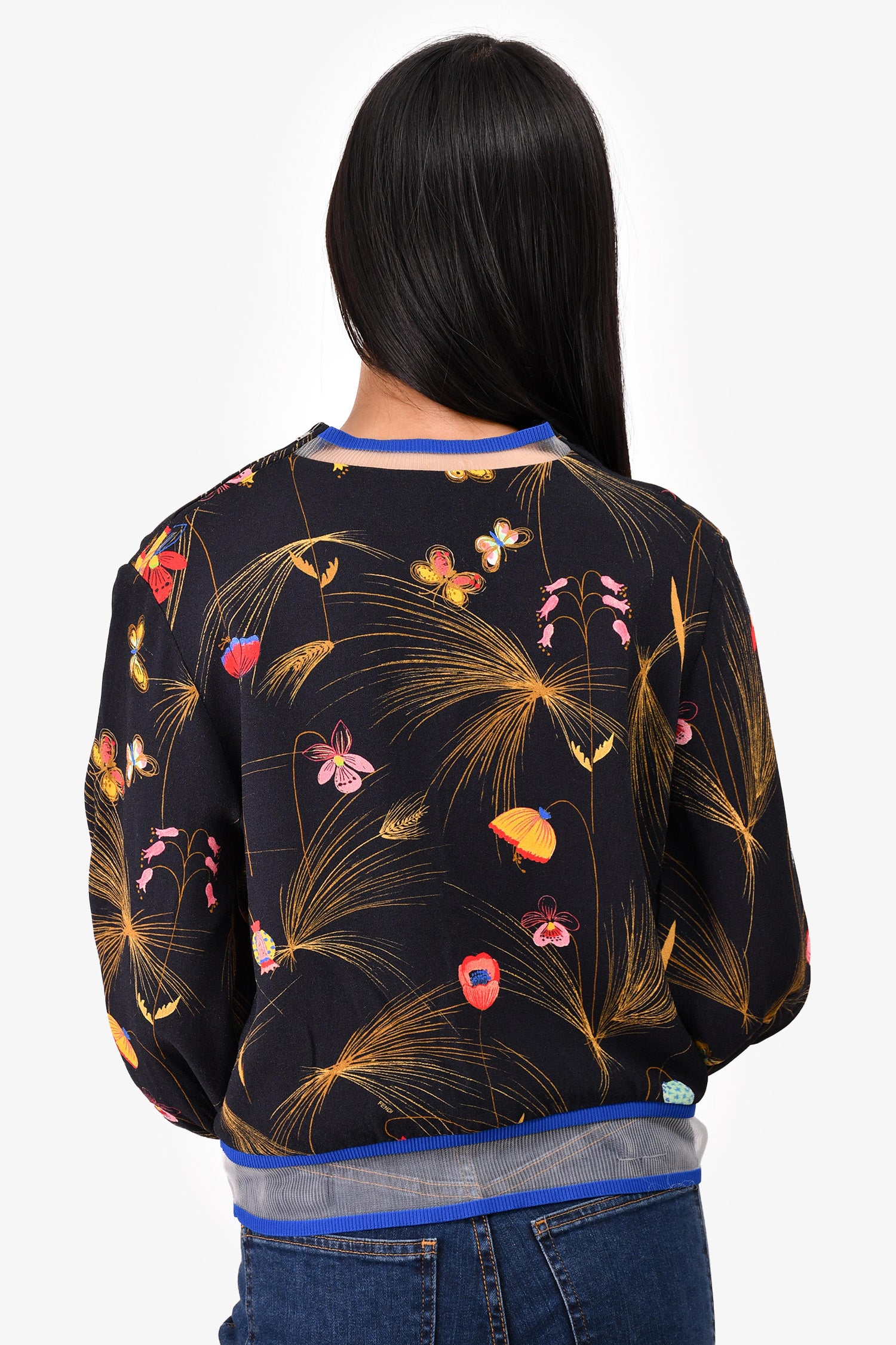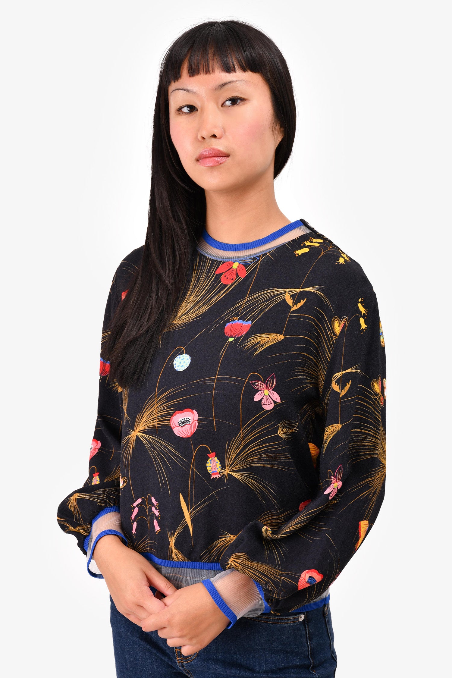 Refresh availabilityFendi Black/Multicolour Floral Print Crew Neck Blouse. Round neckline. Slip on with top shoulder zips. Tonal stitching.