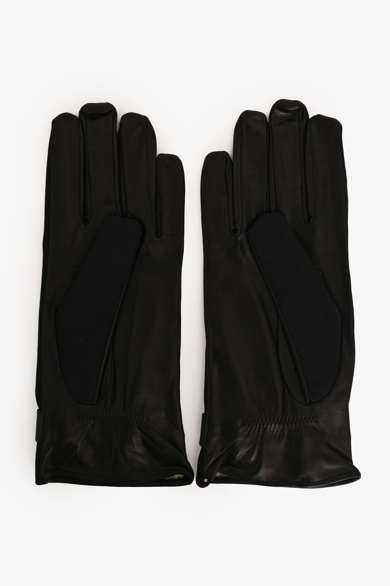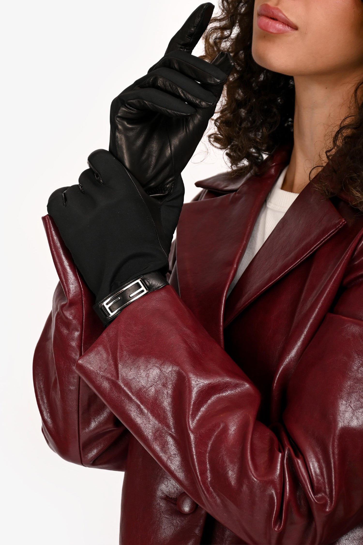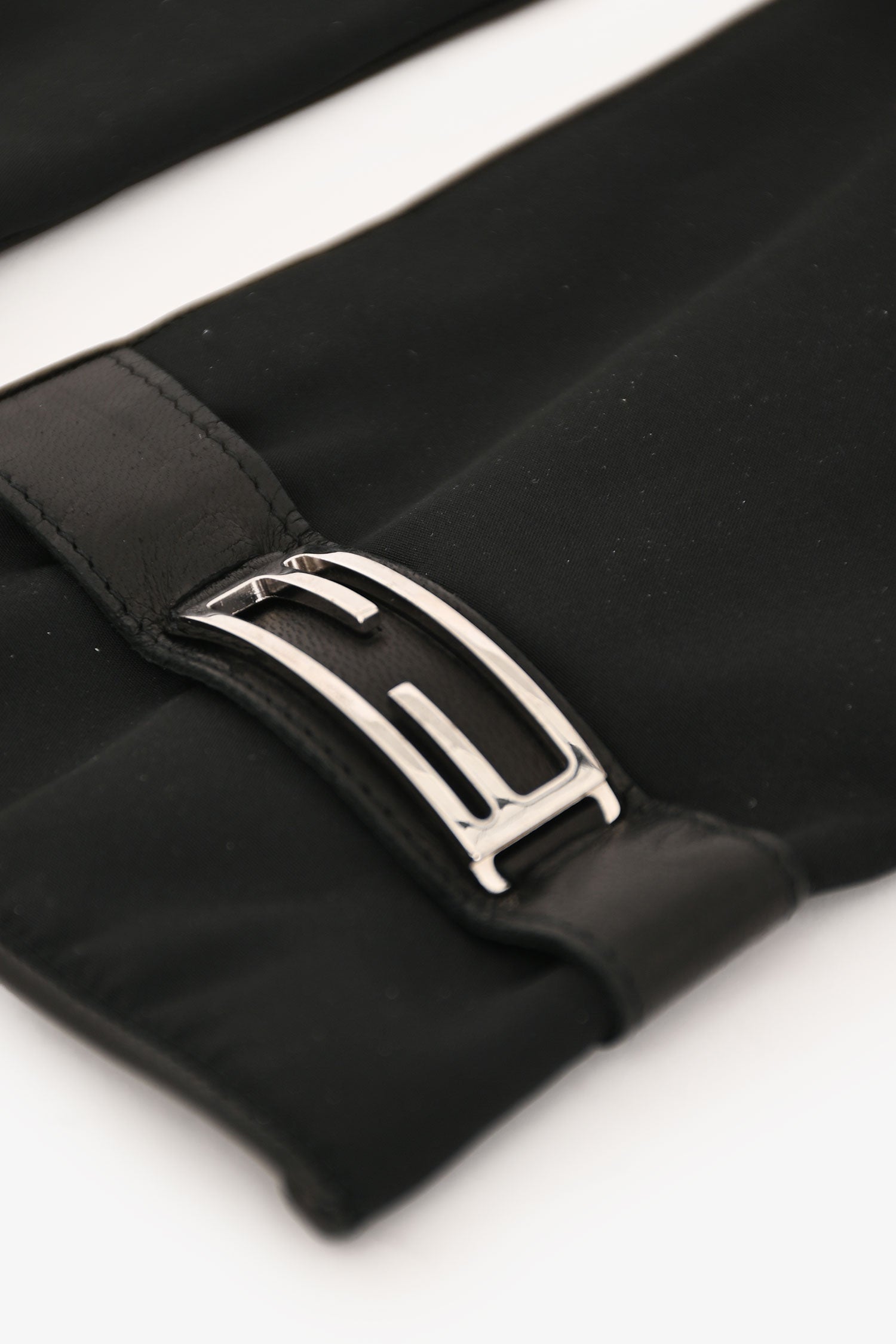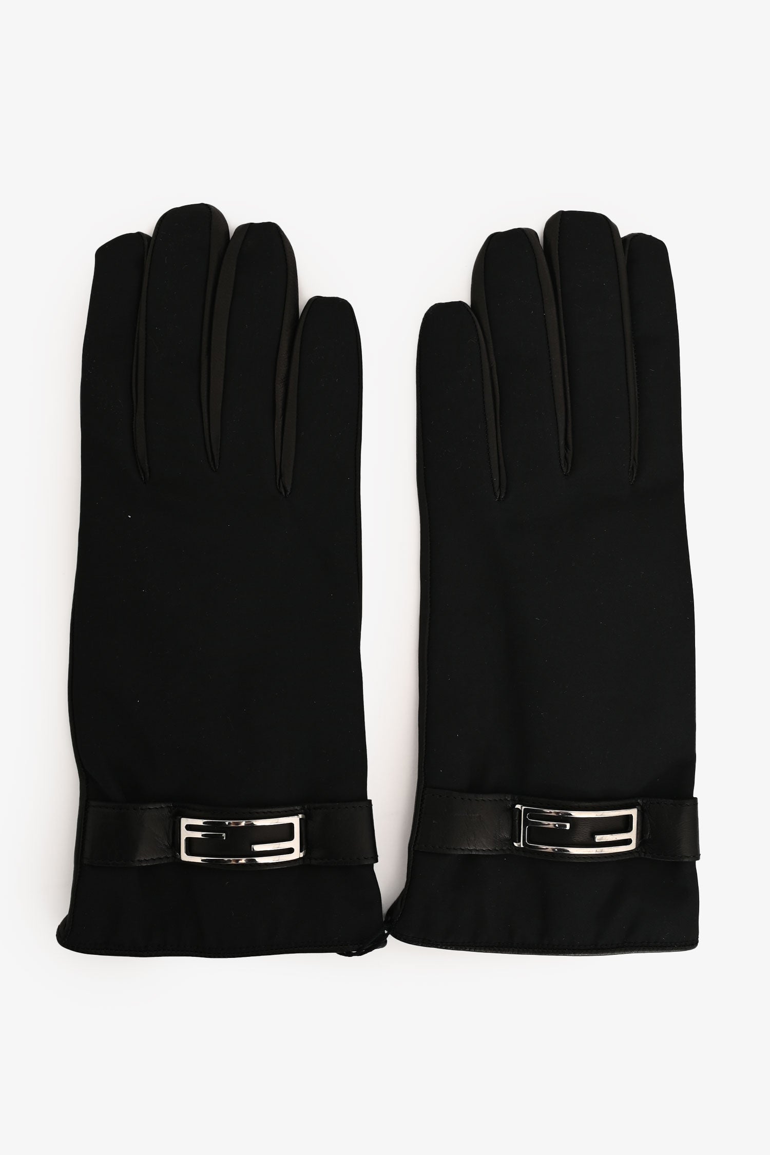 Refresh availabilityFendi Black Nylon/Leather Gloves. Slip-on. Nylon at the top with tonal leather wrist trim featuring silver-tone FF logo buckle detail. Leather on the palm side. Tonal stitching.