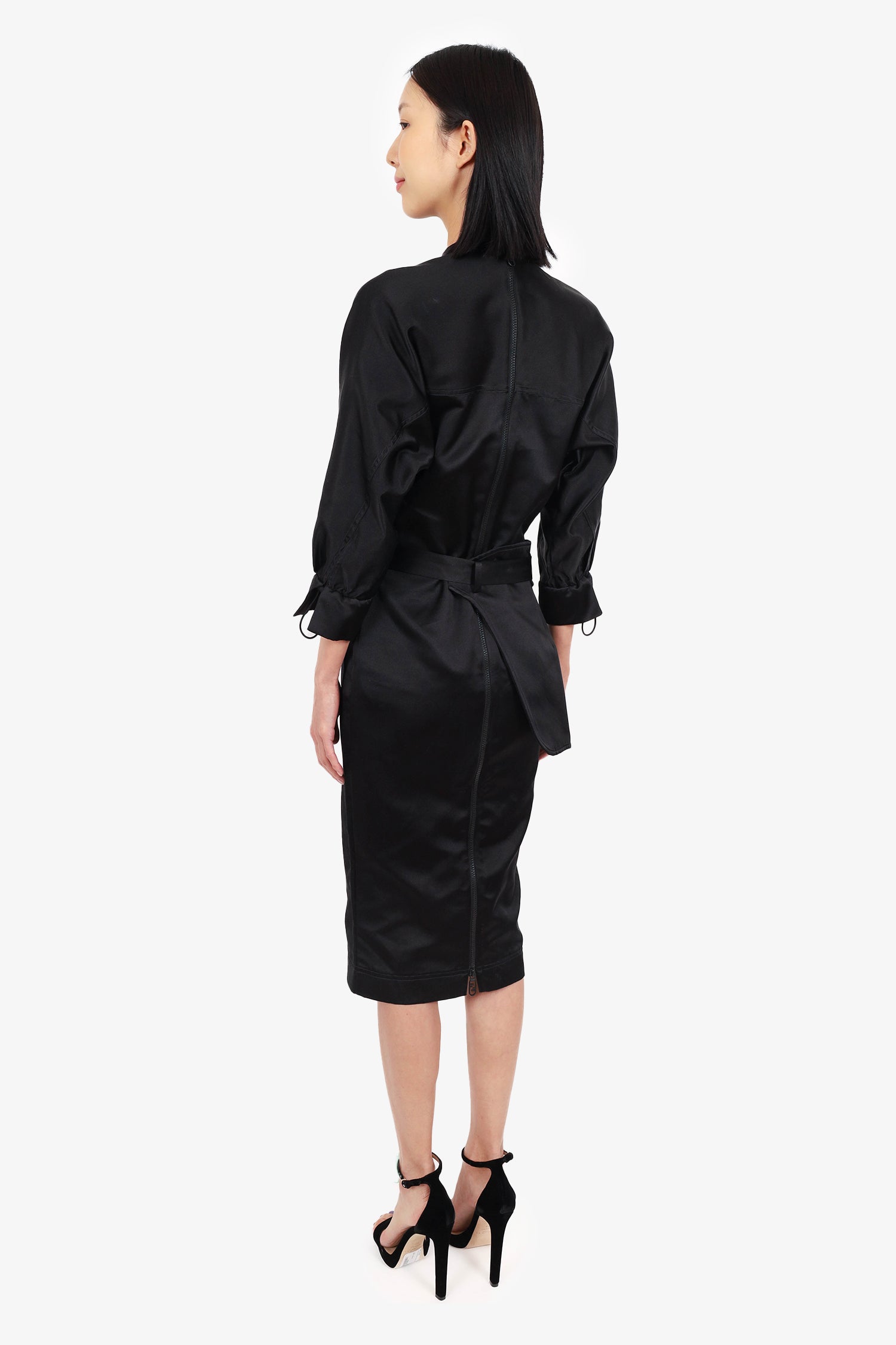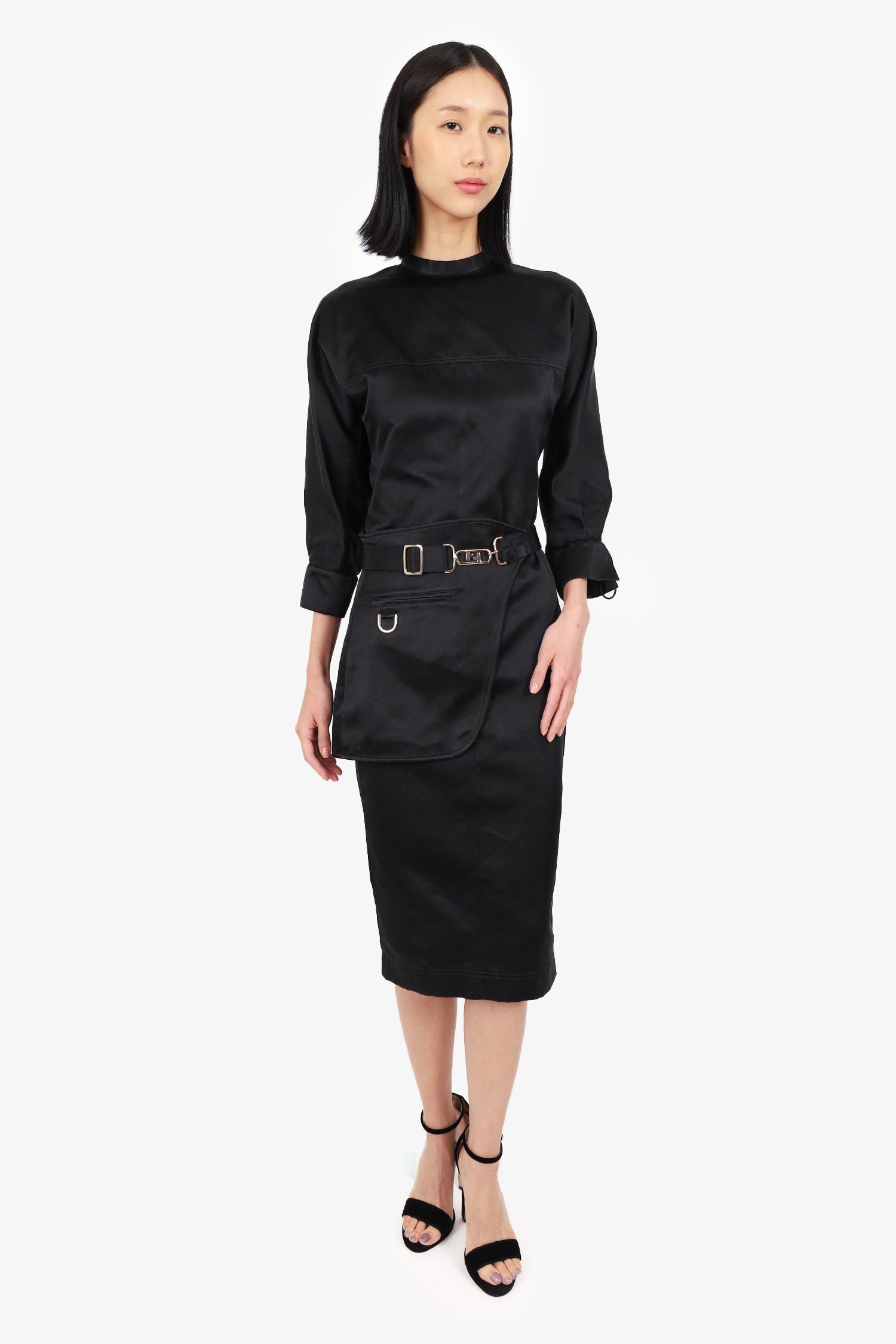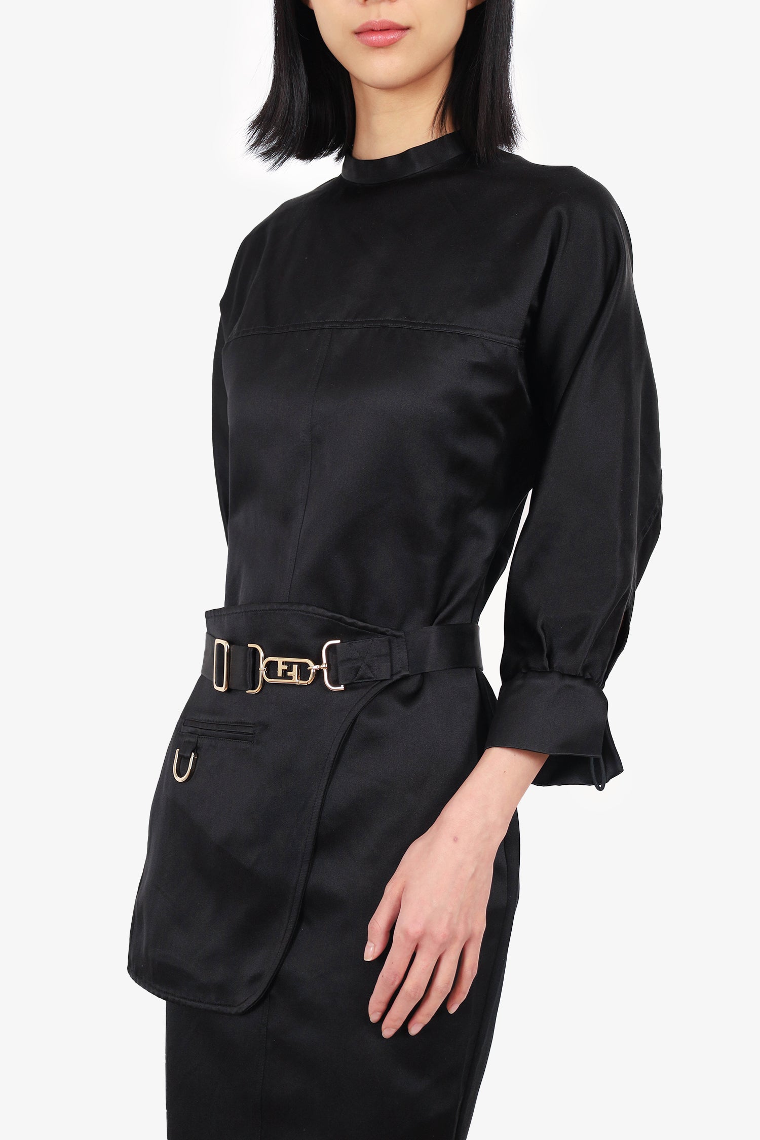 Refresh availabilityFendi Black Silk Belted Long-Sleeved Midi Dress. Rear zip closure. Adjustable cuff on sleeves. Round neckline. Attachable belt. Gold tone hardware. Tonal stitching.