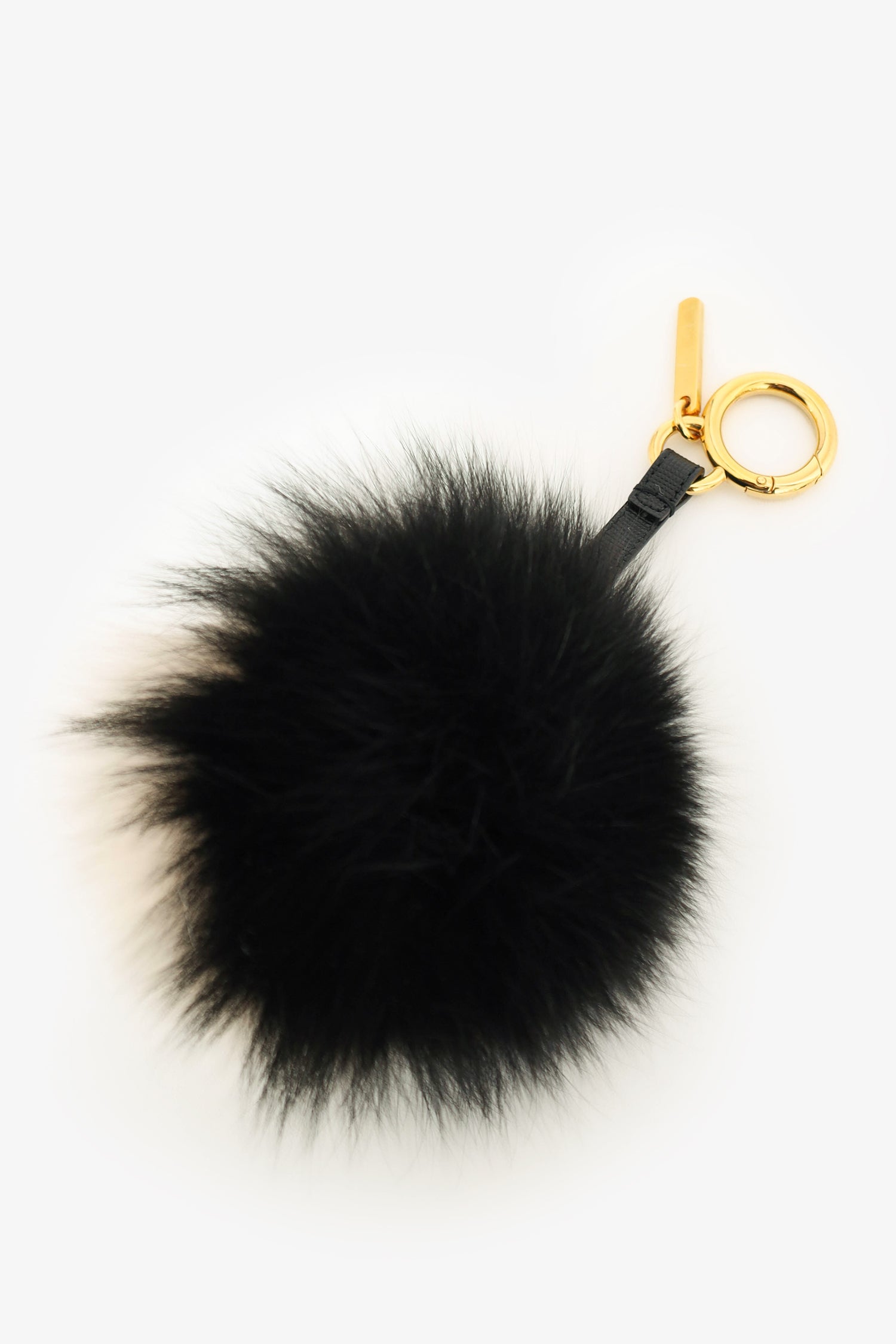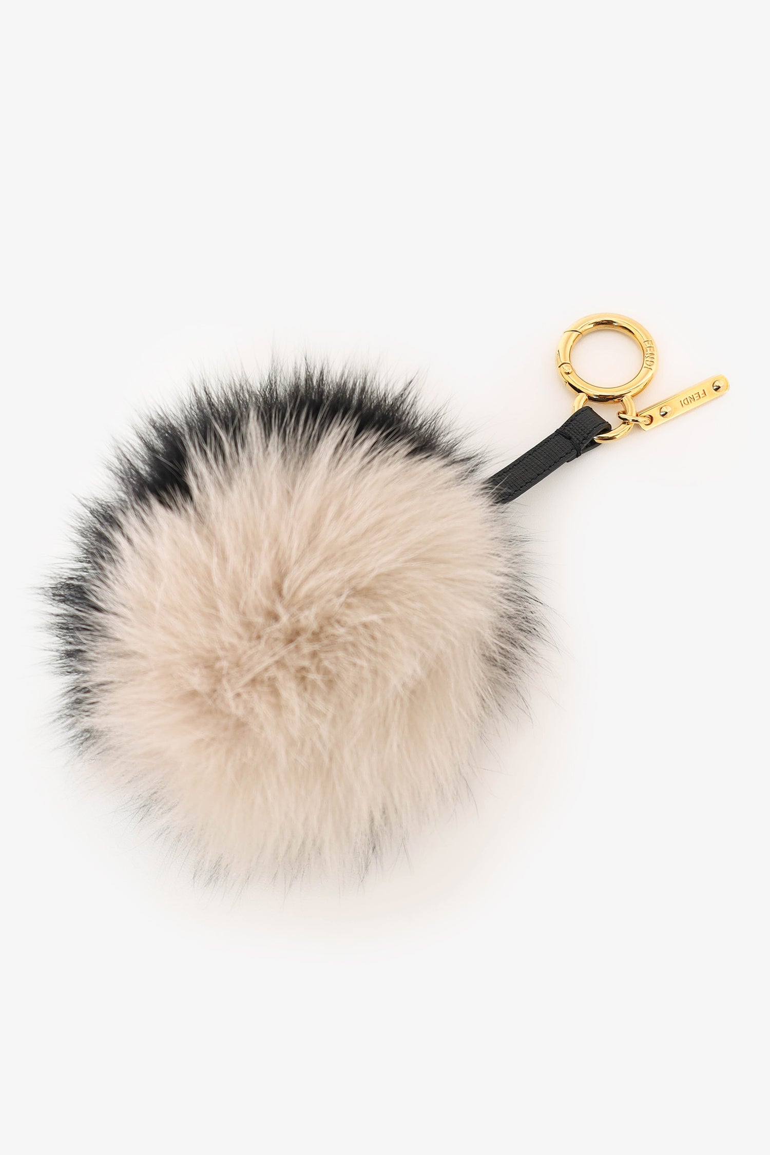 Refresh availabilityFendi Black/White Fur Bag Charm. Circle lobster clasp closure. Gold-tone hardware. Tonal stitching on leather strap.