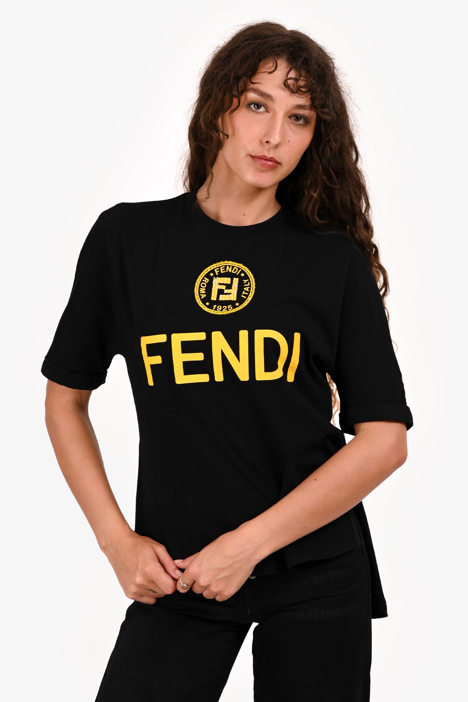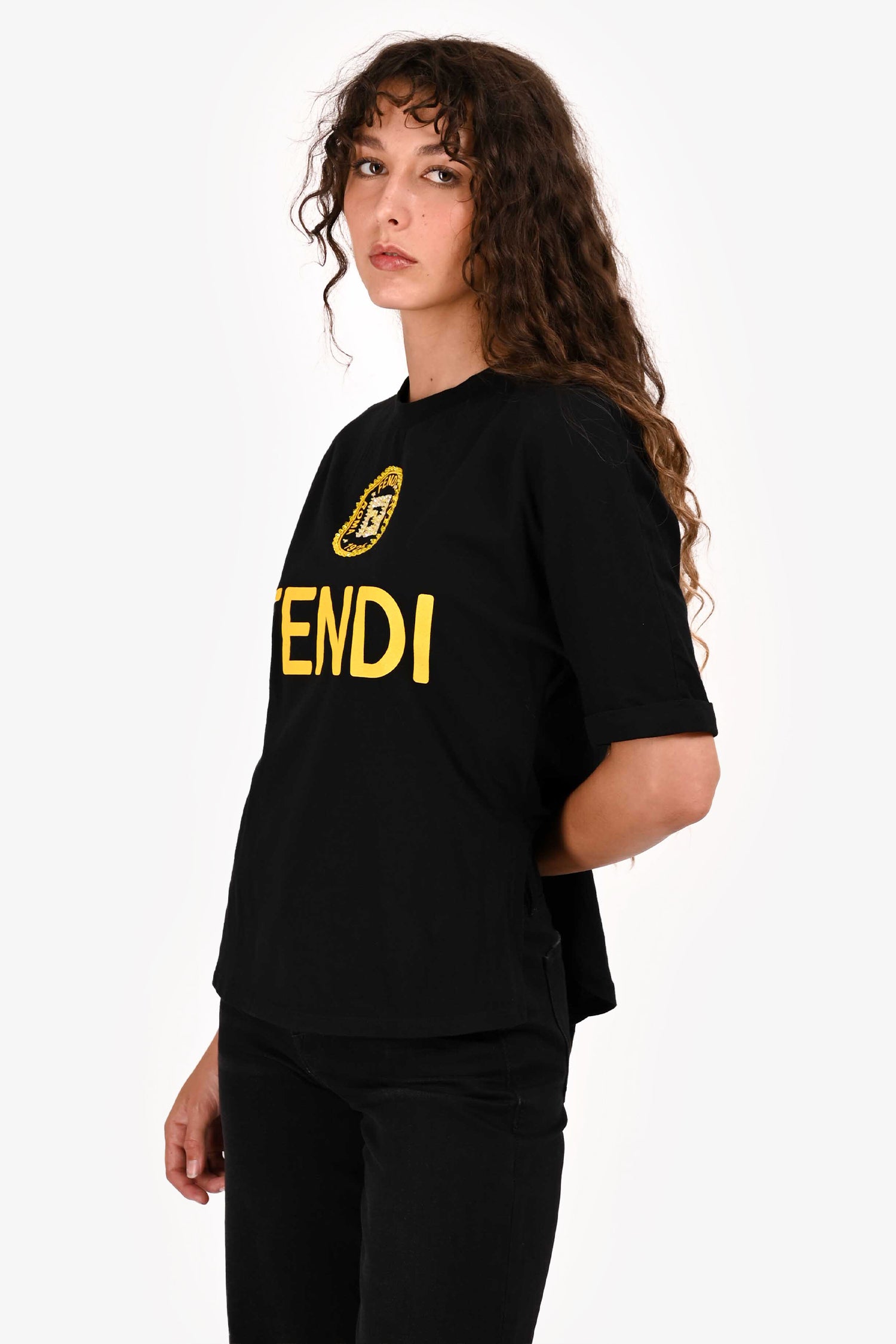 Refresh availabilityFendi Black/Yellow Embellished Logo T-Shirt. Crew neckline. Short sleeves. Soft cotton fabric. Tonal stitching.