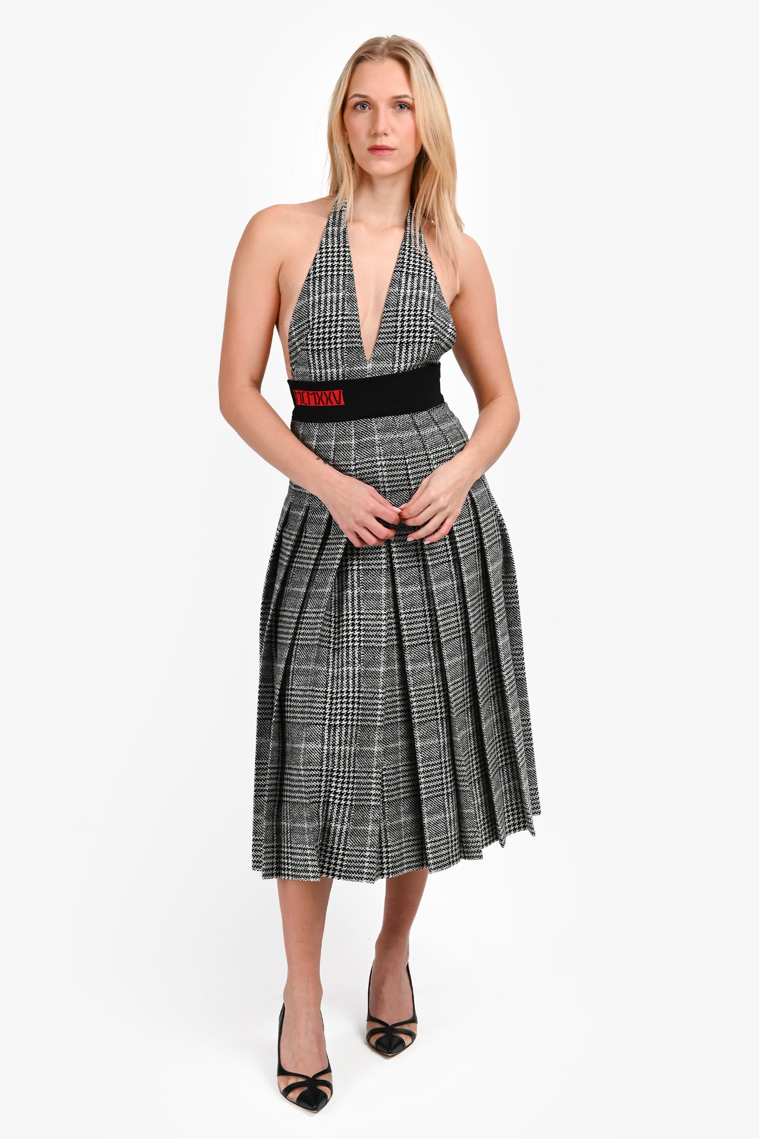 Refresh availabilityFendi Black/White Houndstooth Pleated Midi Dress. Pull-on. Halter neckline. Tension clasp closure on the neck. Zipper closure on the side. Elasticized waistband. Partly lined. Silver-tone and tonal hardware. Tonal stitching.
