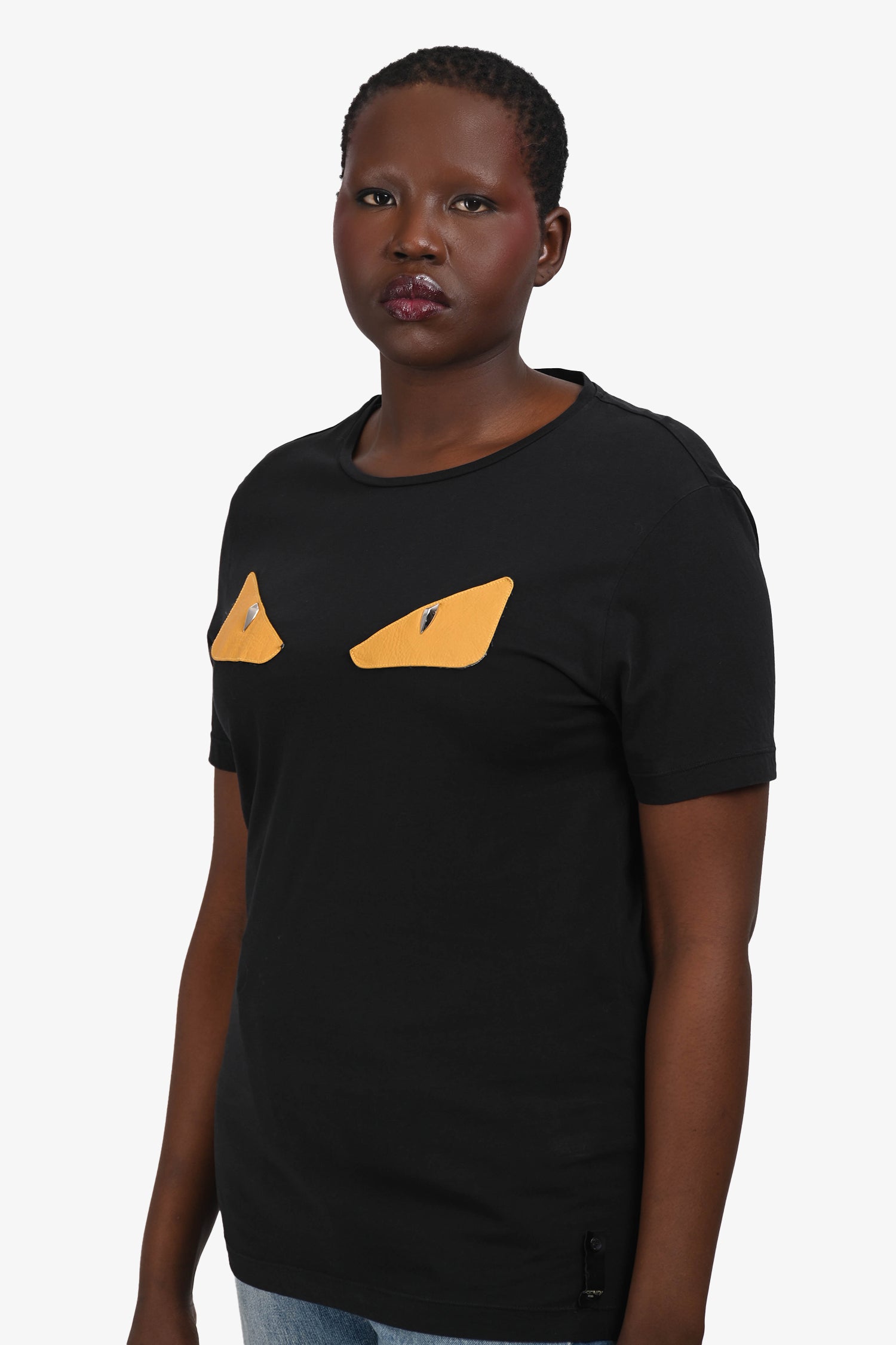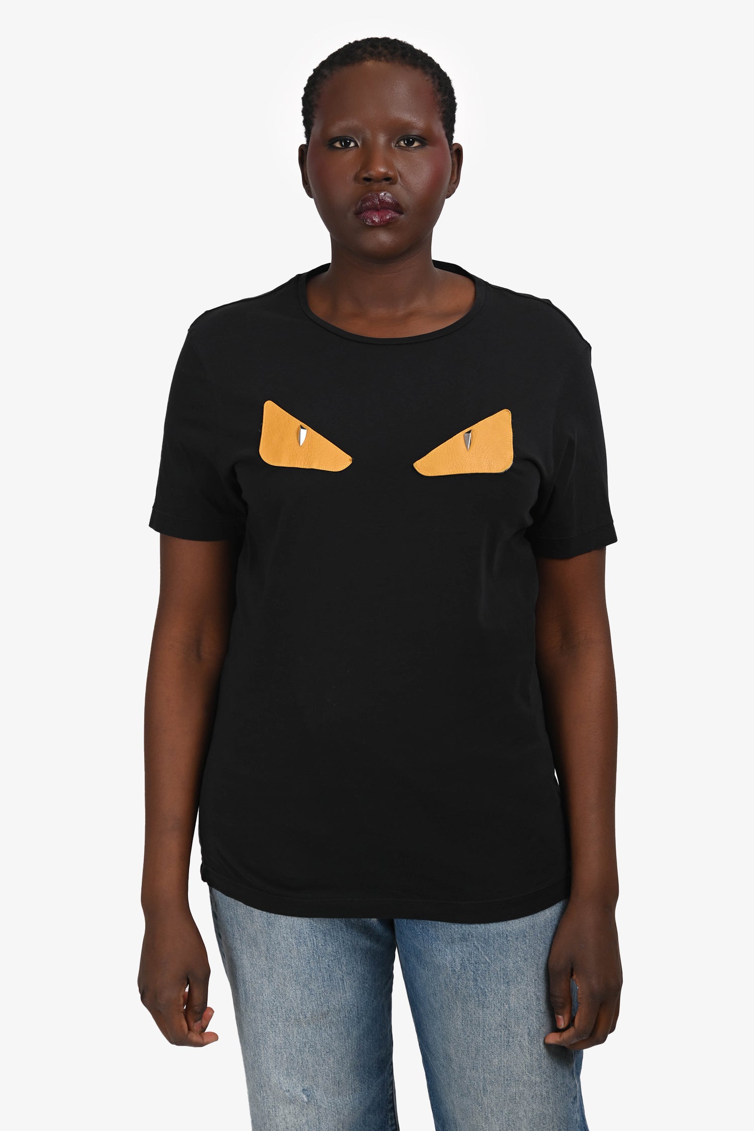 Refresh availabilityFendi Black/Yellow Cotton/Leather Monster Crew Neck T-Shirt. Round neckline. Silver-tone hardware. Tonal stitching.