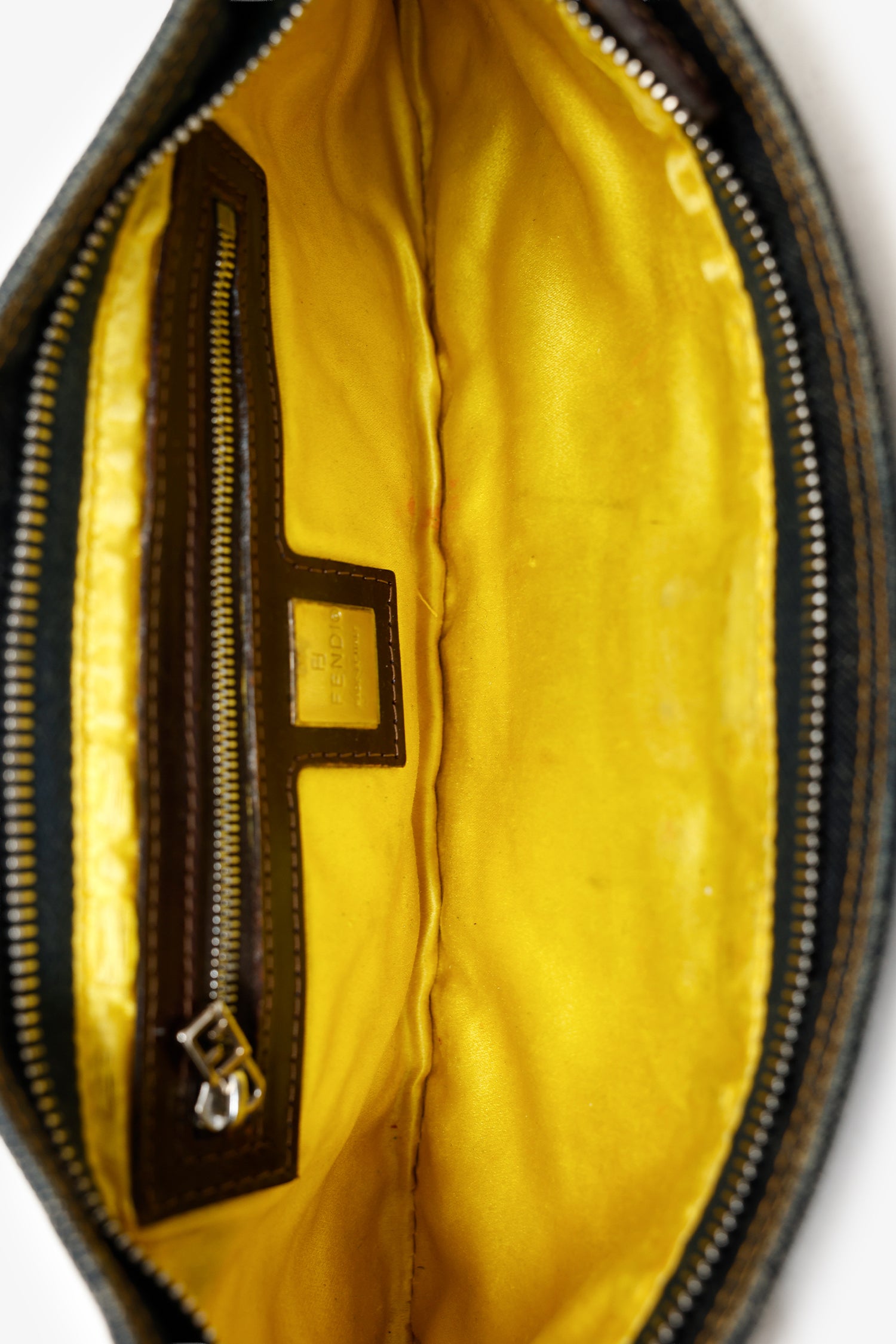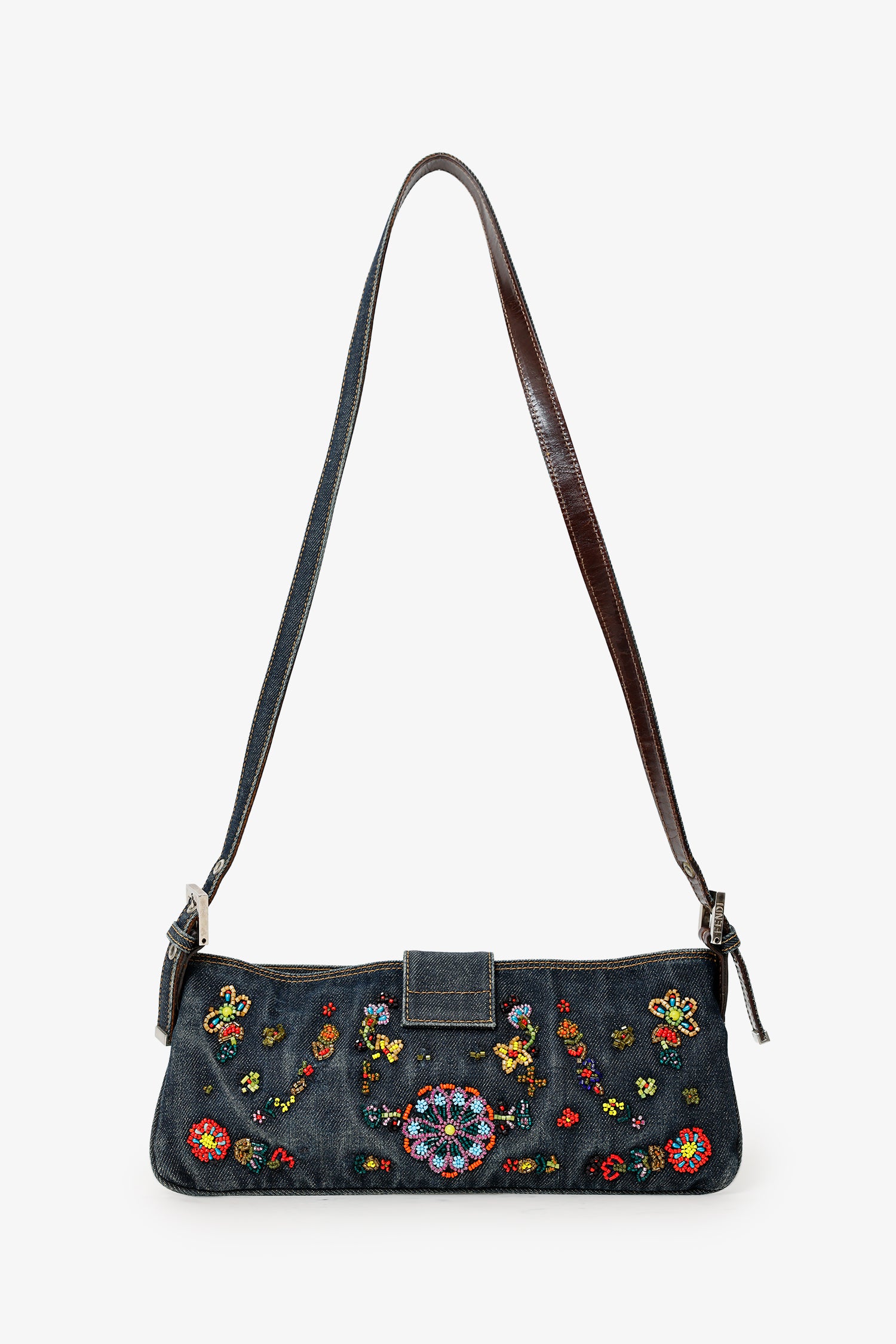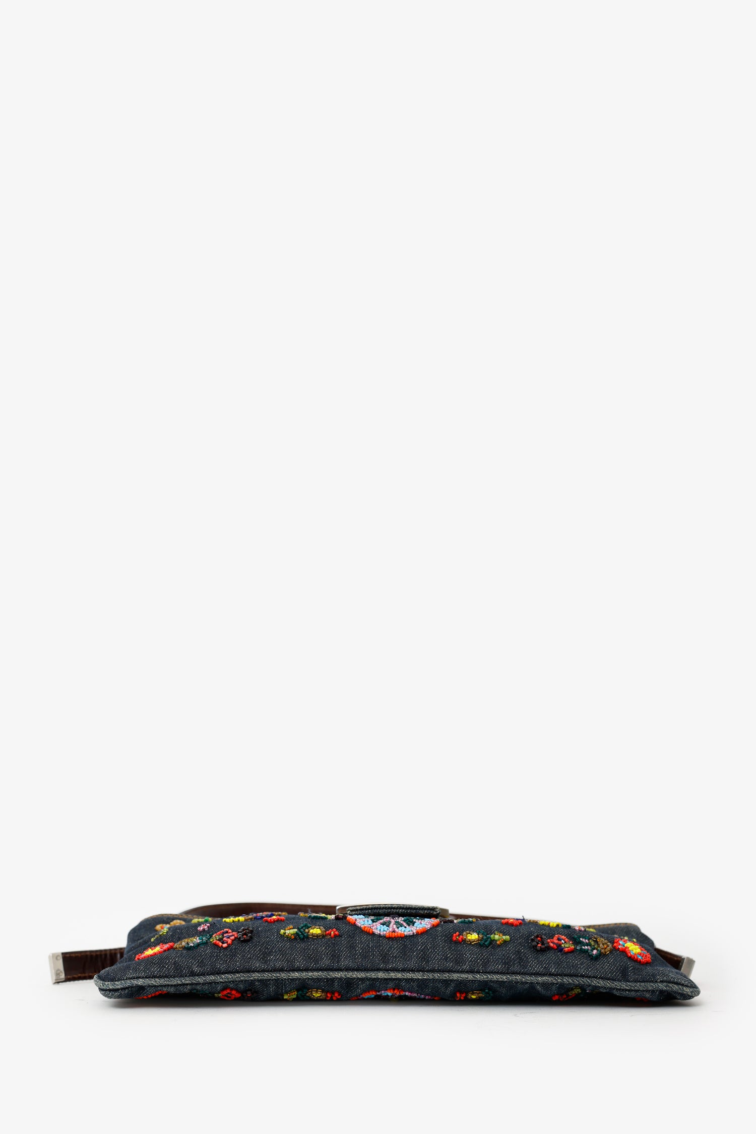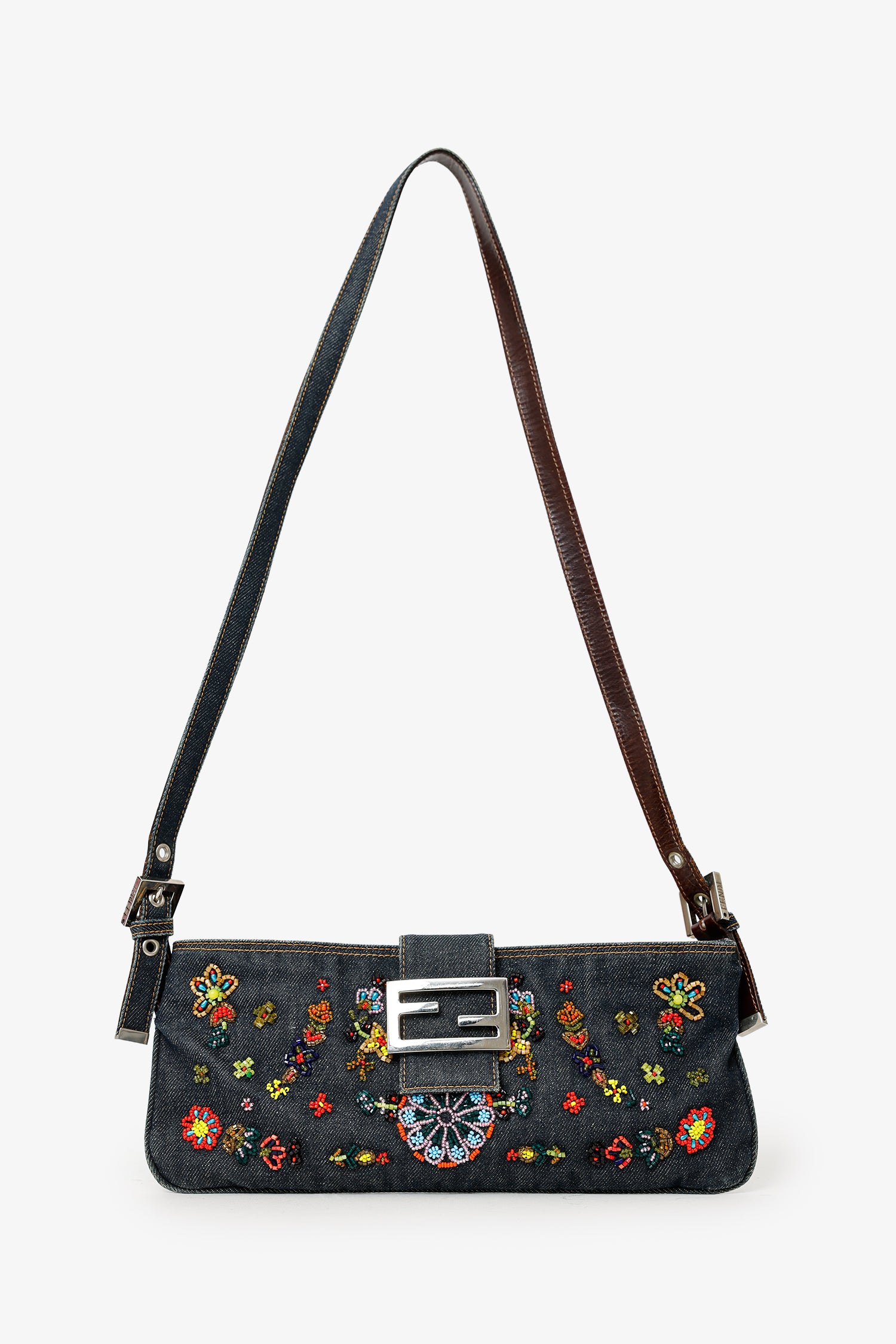 Refresh availabilityFendi Blue Denim Beaded Baguette Pochette. Front-fold-over-flap with snap-button-up and zip-up closure. Crossbody strap with adjustable pull-through buckle closure. Lined interior with single rear zip-up pocket. Silver-tone hardware. Contrast stitching.