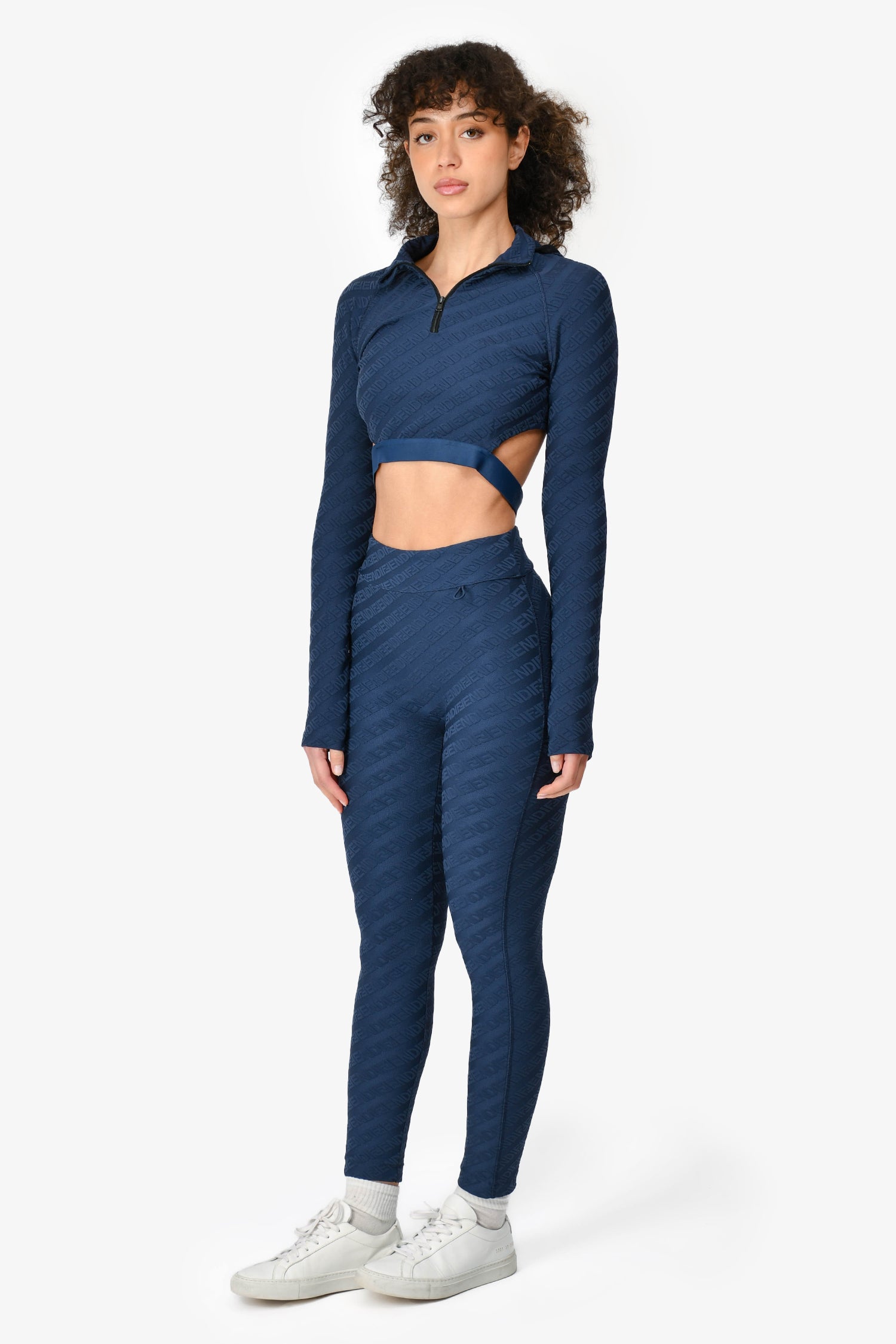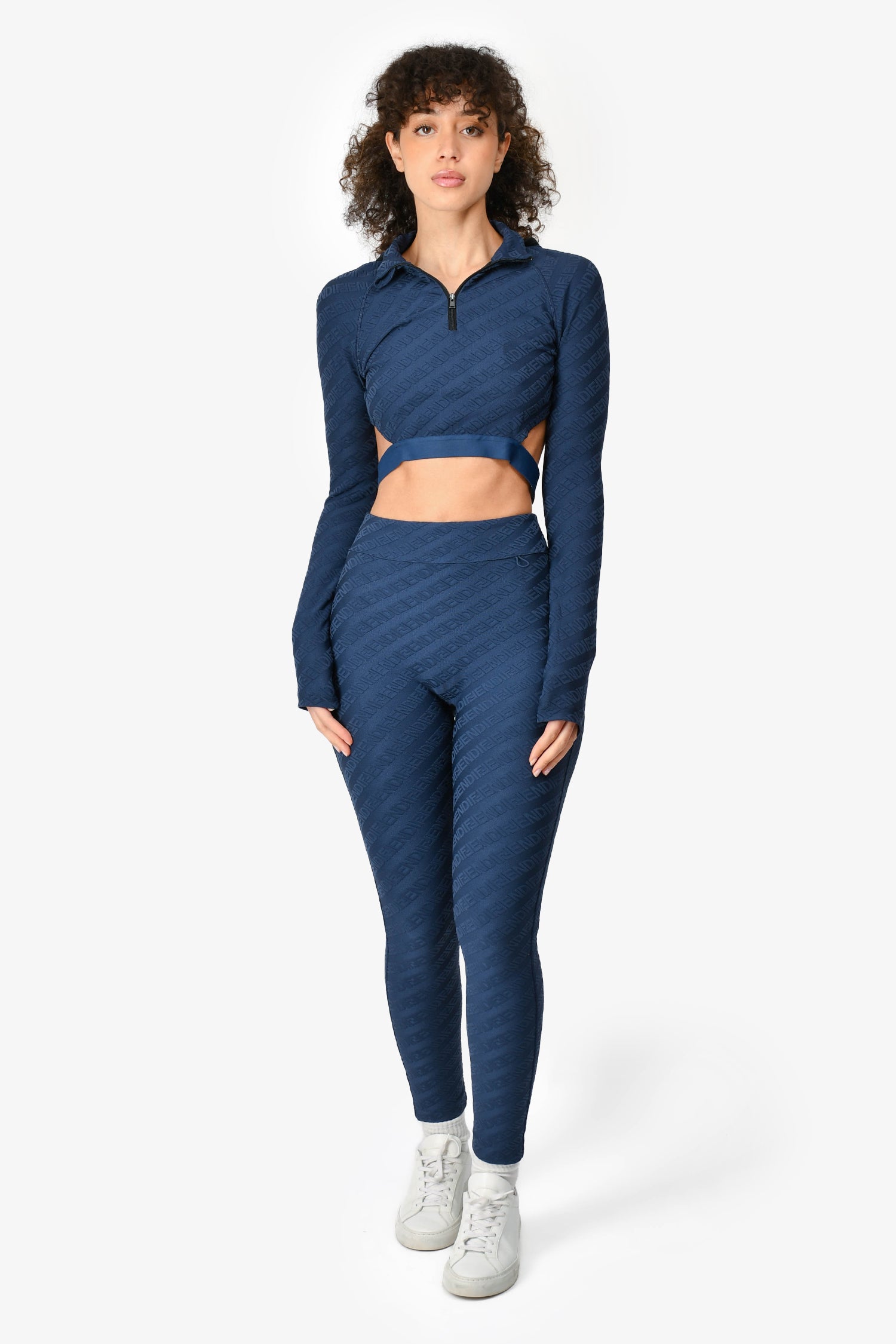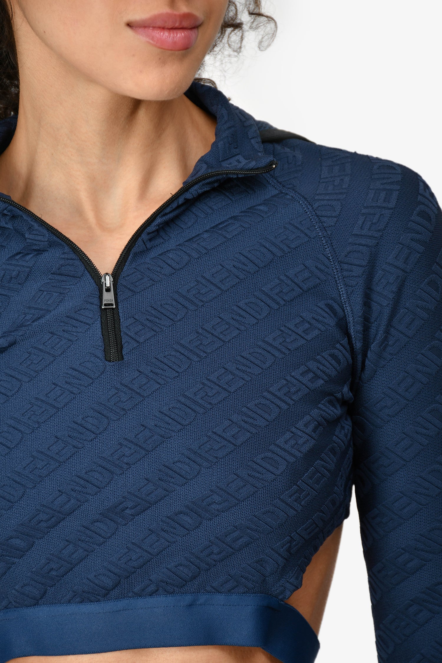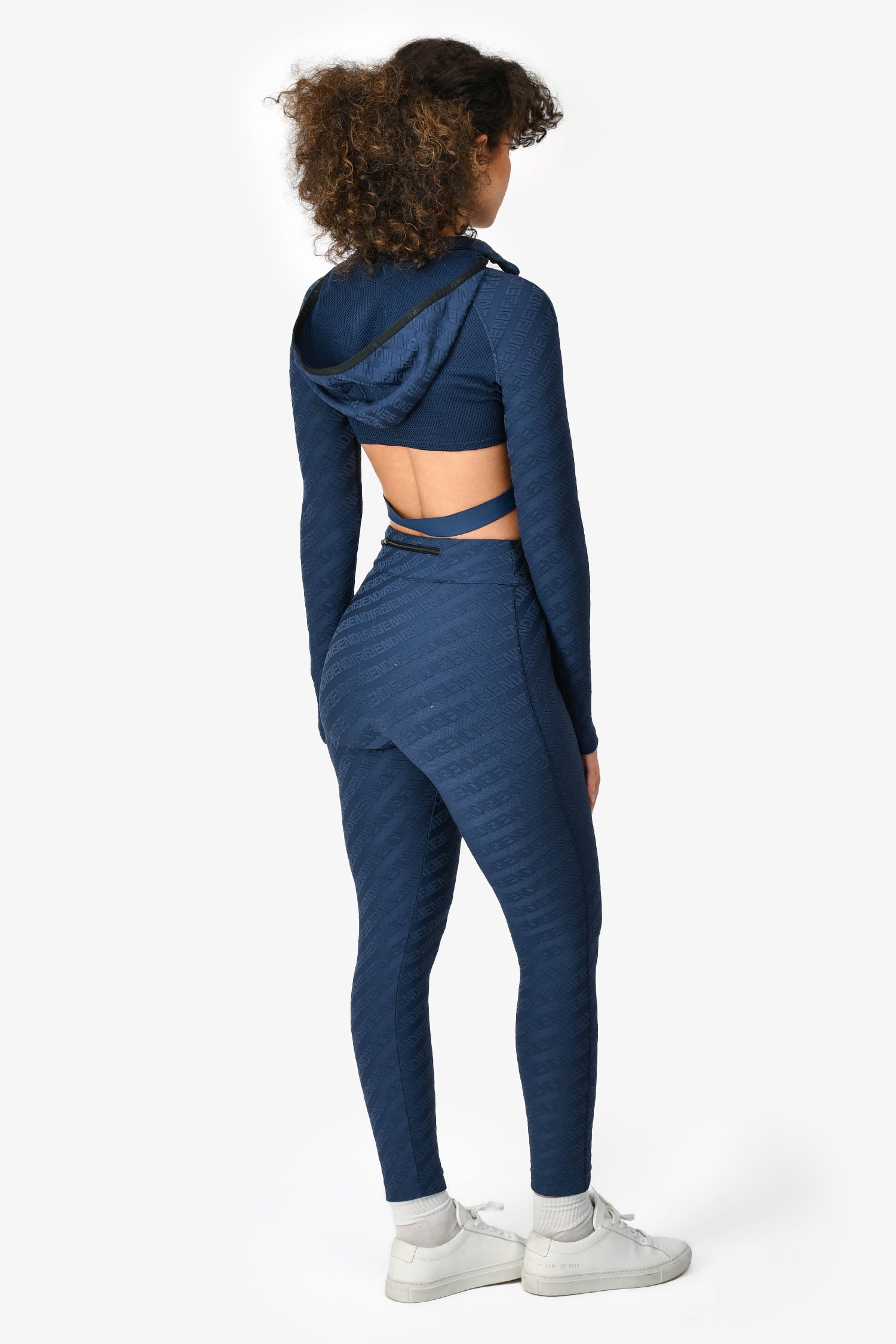 Refresh availabilityFendi Blue Logo Cropped Hooded Top + Legging Activewear Set. Top; half front zip-up closure, half lined interior, elasticized waist band, attached hood. Leggings; waist back zippered pocket. Both tonal stitching.
