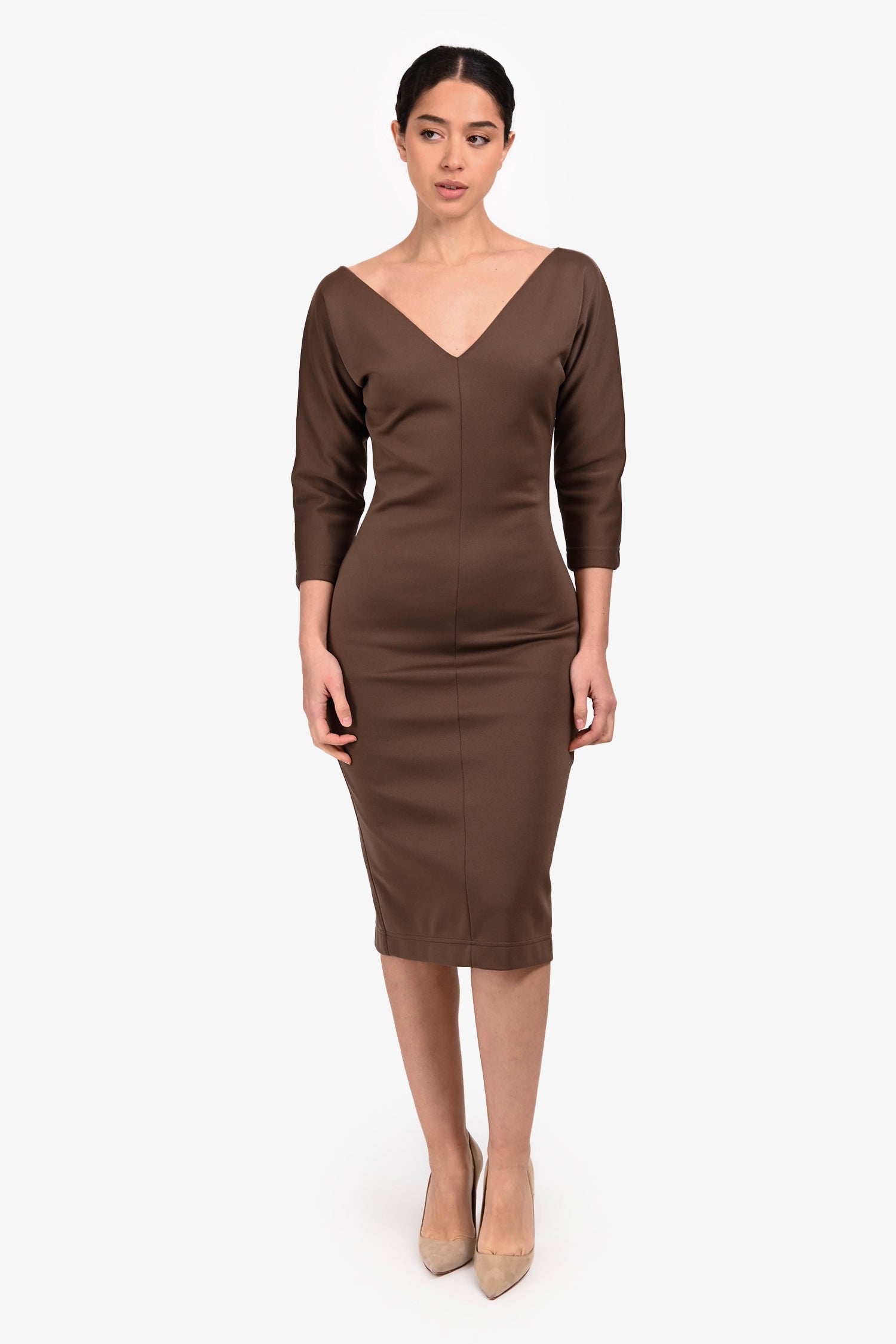 Refresh availabilityFendi Brown 3/4 Sleeve V-Neck Midi Dress. Round neckline. Zipper and hook-and-eye closure in the back. V-neckline. Slit in the back. Tonal hardware. Tonal stitching.