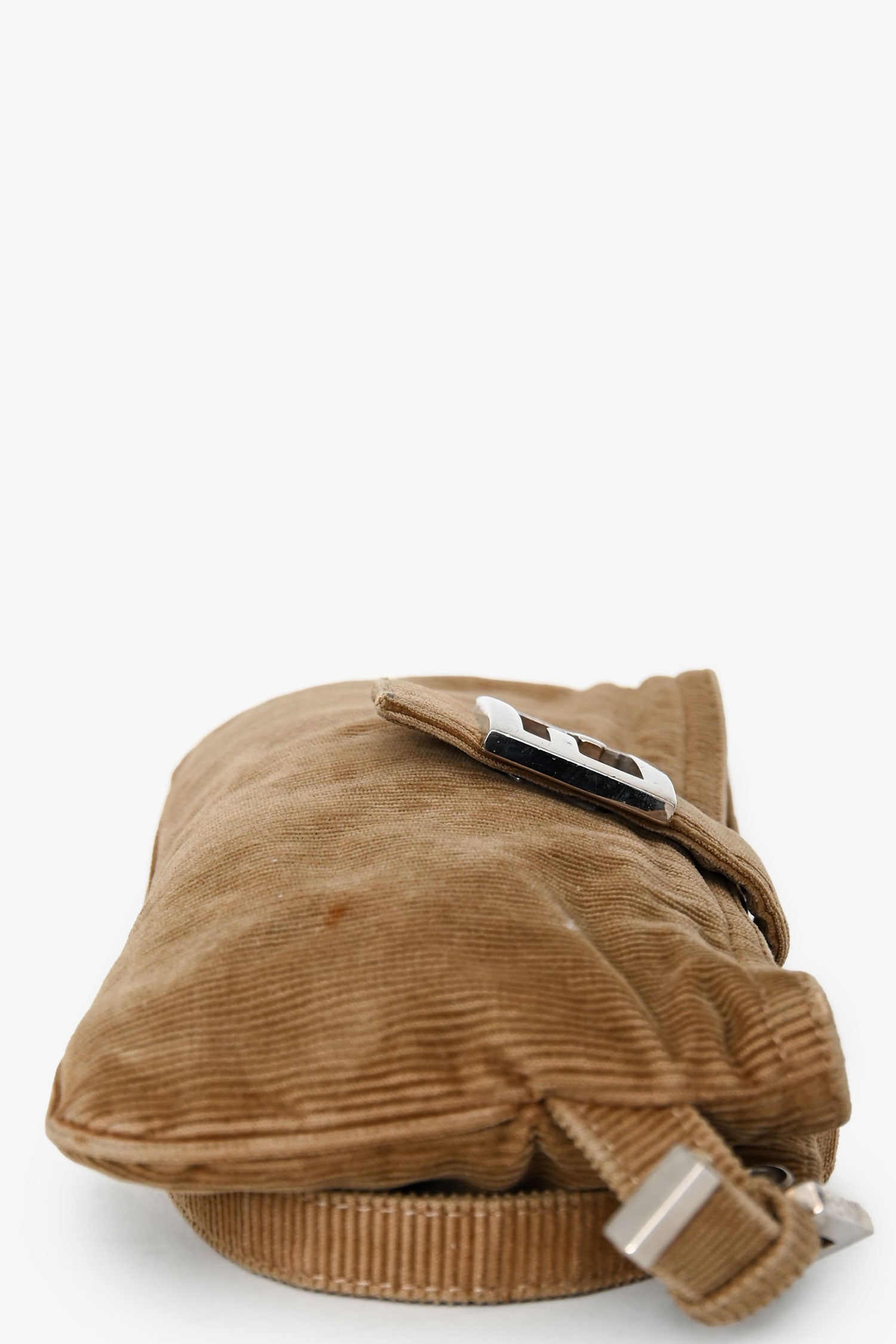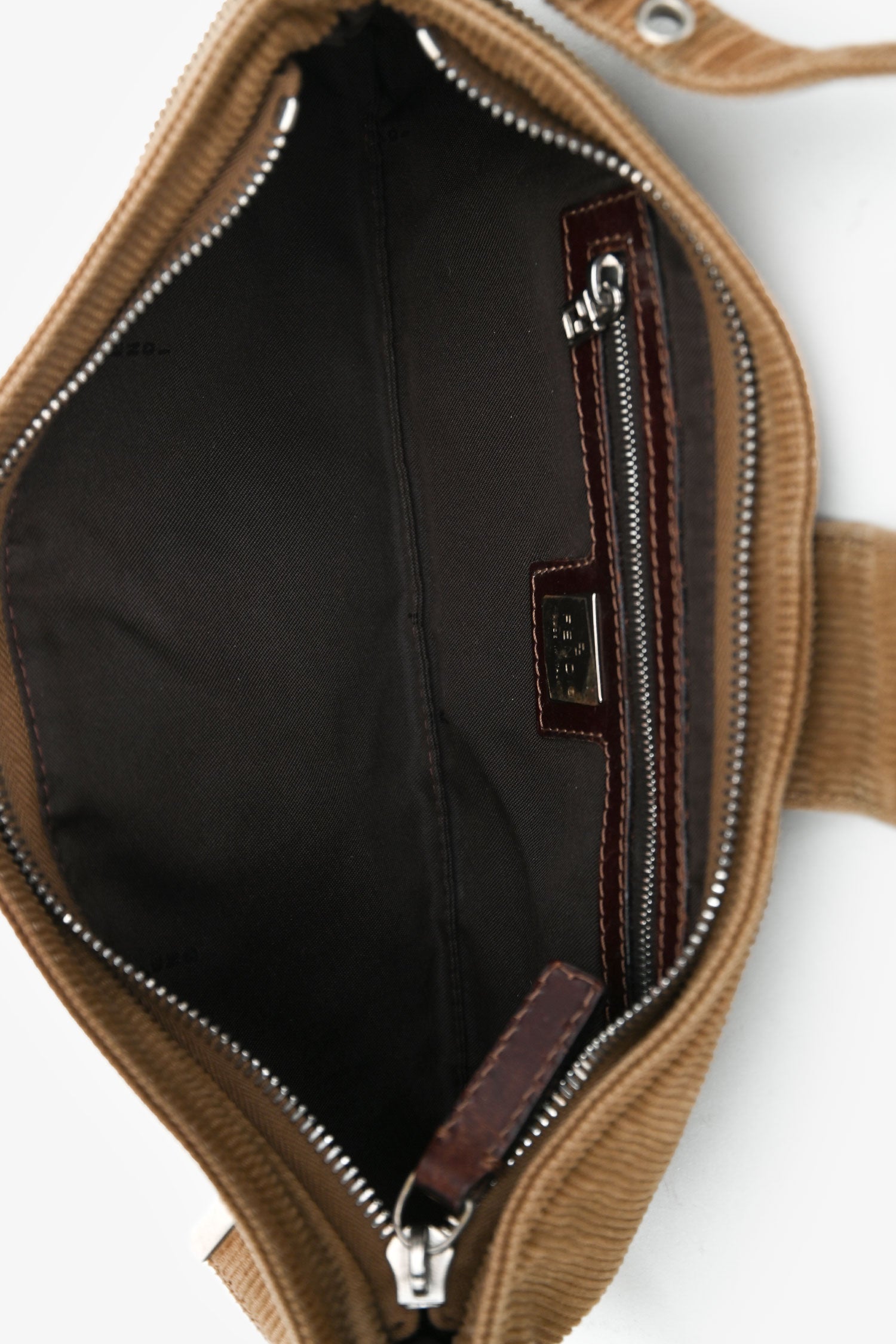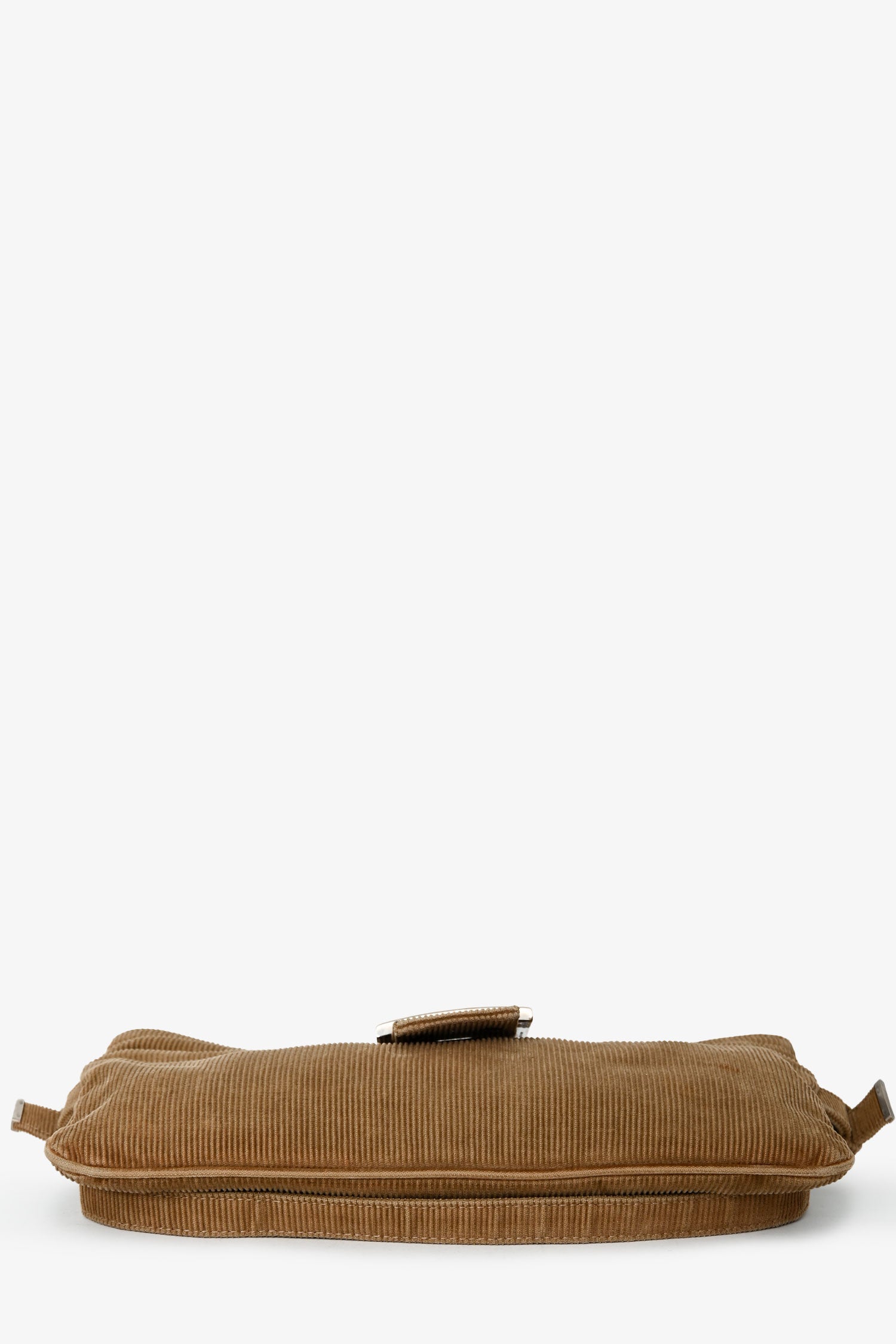 Refresh availabilityFendi Brown Corduroy Baguette Pochette. Fold-over strap with a snap closure. Concealed upper zipper. Adjustable shoulder strap. Lined interior with 1 wall zip. Silver-tone hardware. Tonal stitching.